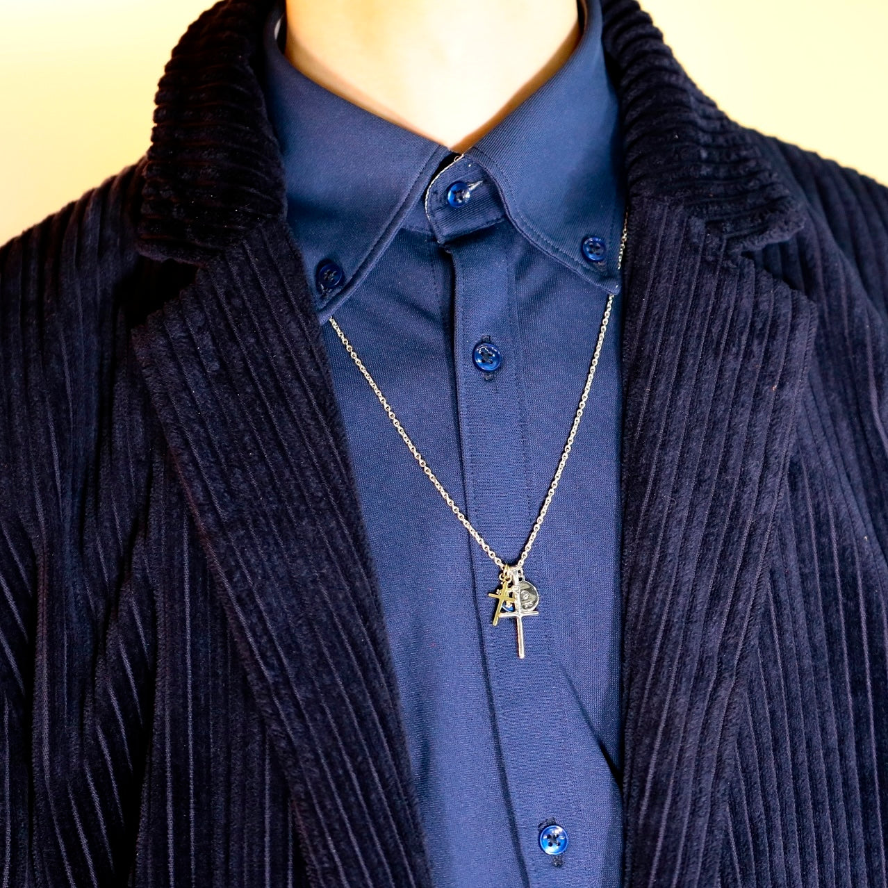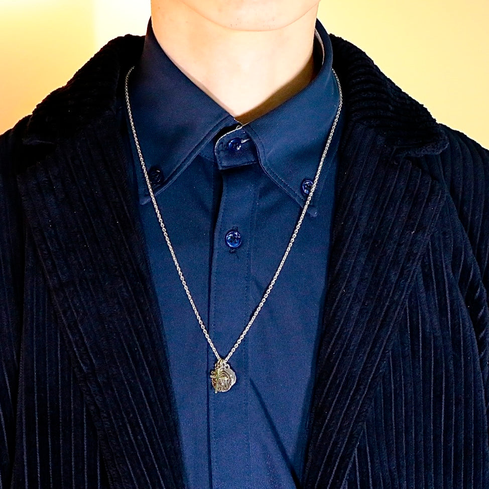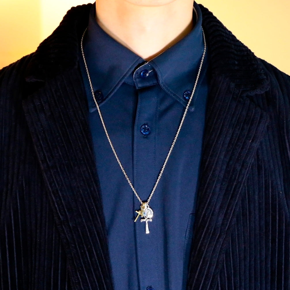 男性が身に付けるアクセサリーは本当に難しい!素材にしても色々ある。変なブルジョアにも見えて欲しくないし、宝石が付いたモノもなんか恥ずかしい、華美なモノはそこばかり目立ってしまう。アクセサリーは服のコーディネートのあくまでもプラスアルファであって欲しい。素材はシルバーがやっぱり良いのではないかと思う、ちゃんとした純銀製。長さも色々ある、首にピッタリとしたモノは何故か息苦しさを感じてあまり好きではない。からと言って長いネックレスを探すとなかなか売っていない。Tシャツの上からもシャツの中にしても丁度良い長さ、60センチがとてもバランスが良く見えると思う。あとはネックレスの先につけるチャームである。旅先などで一つづつ買い足したものを思い出としてネックレスの先につけていく、人生の思い出と一緒に身につけるアクセサリーは最高だと思う。カッコいい!こちらを作っていただいたamp japanは、もう長いお付き合いで、この手のモノを作らせたら最高のブランドです。今回もイメージ通りのモノをHATCHのために作っていただきました。是非これからの人生、思い出としてネックレスと一緒に歩んで欲しいと思います。