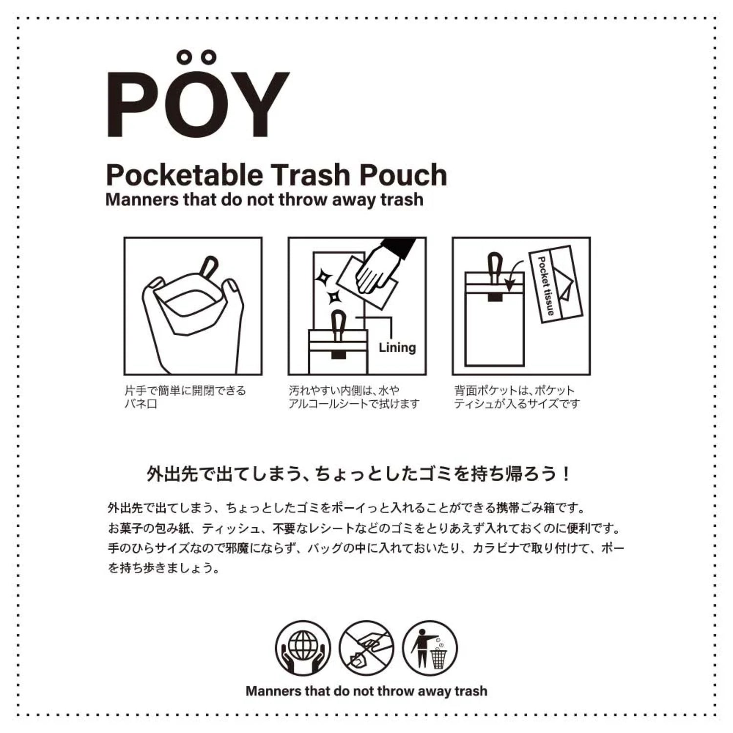 外出先で出てしまうちょっとしたゴミを入れることができる携帯ゴミ箱。お菓子の包み紙、ティッシュ、不要なレシートなど、小さなごみだけど捨てる場所がない・・・そんな時に、”とりあえず”入れておくのに便利な携帯用ミニゴミ箱。家に帰ったら、中のゴミを捨てるだけ。手のひらサイズで邪魔にならず、バッグの中に入れて置いたり、カラビナで取り付けて。お出かけにはポーイを持ち歩きましょう! 本体背面には、ウェットティッシュやポケットティッシュが入れられるポケット付き。セットで持ち歩けばどちらかを忘れてしまうこともなく便利です。