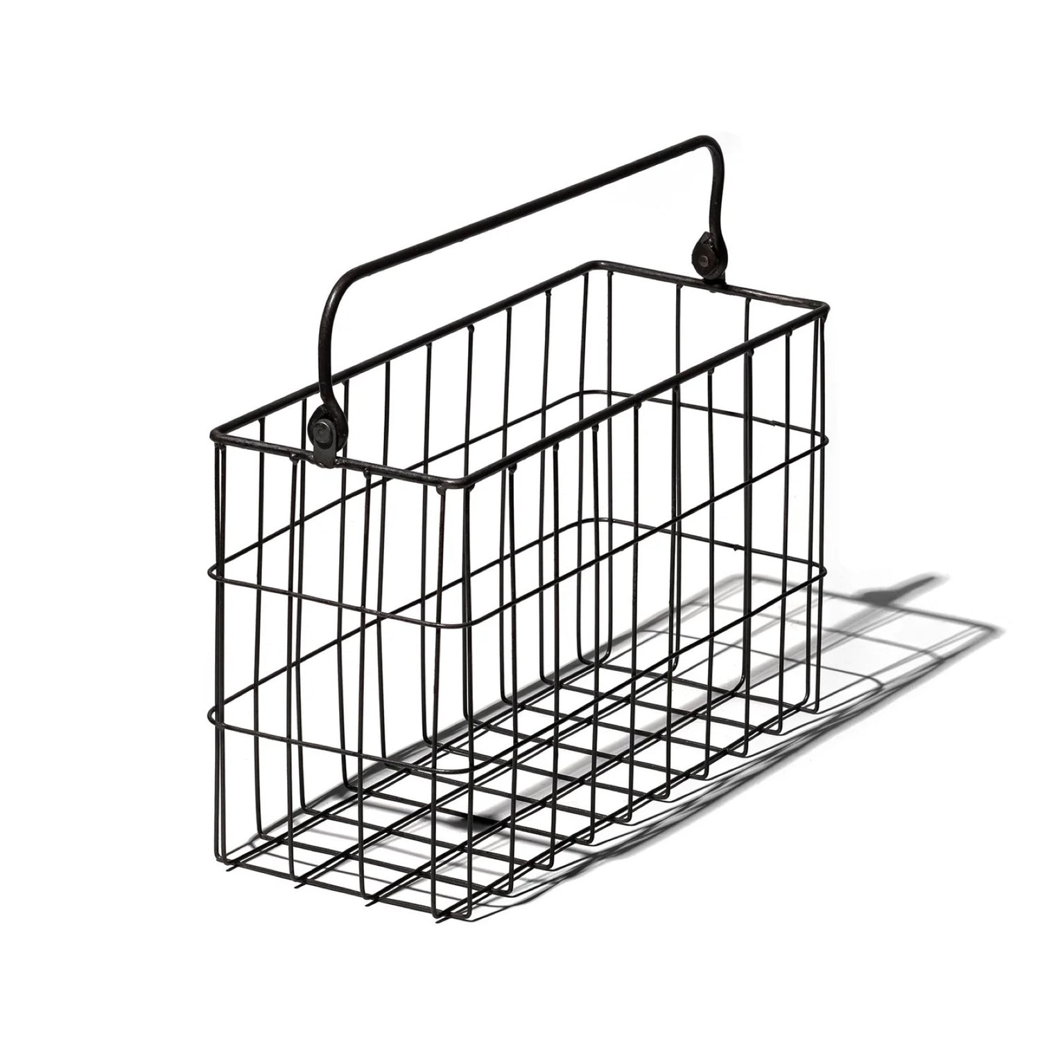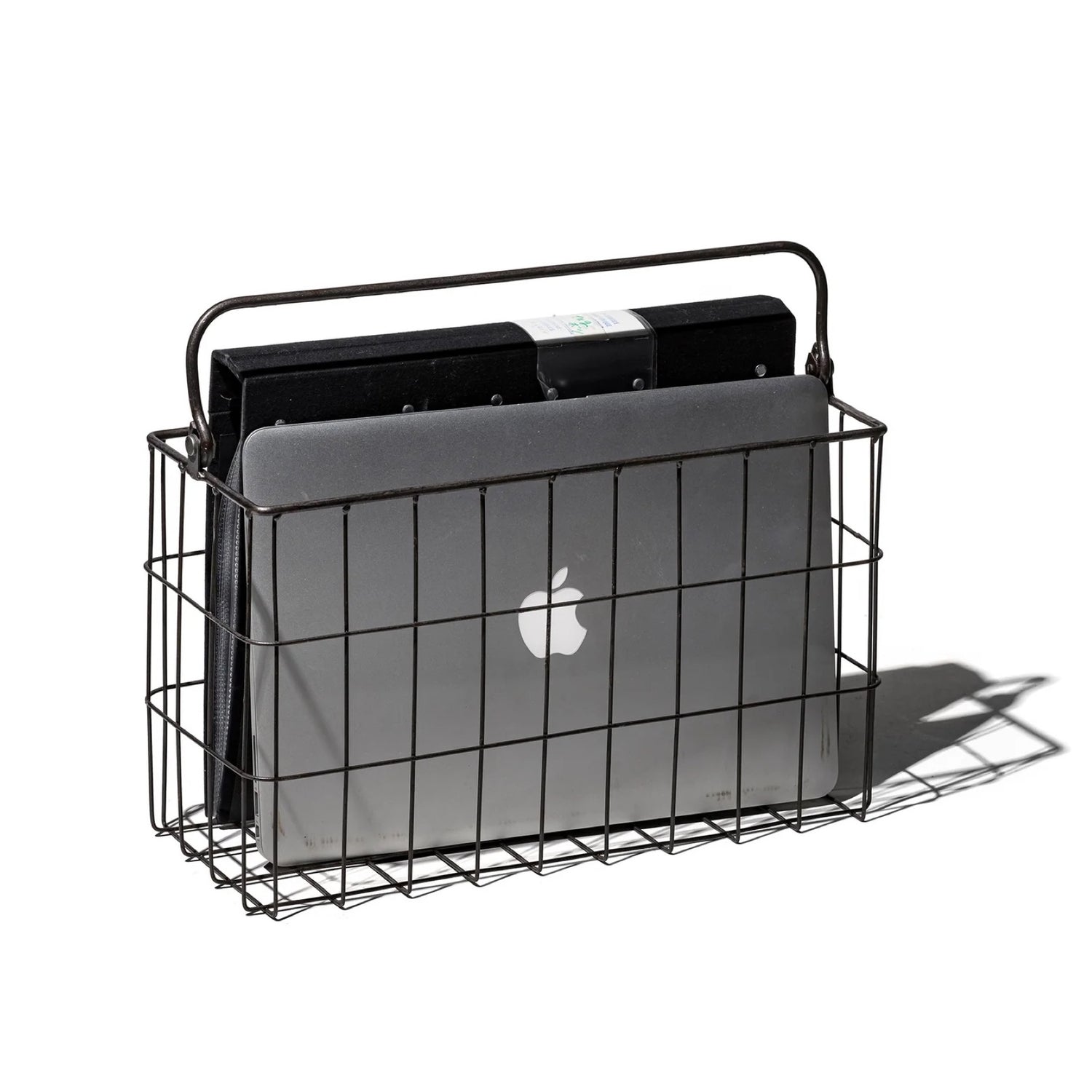 頑丈なスチール製のワイヤーマガジンバスケット。取手部分は倒れます。