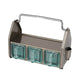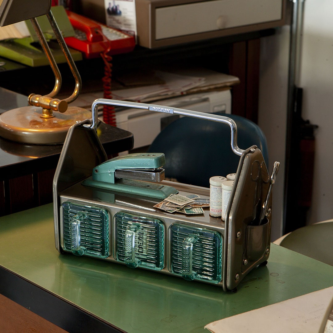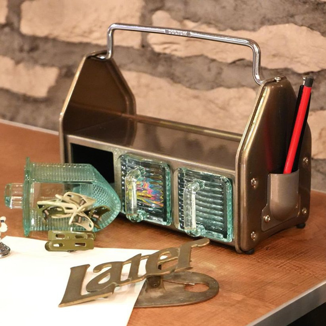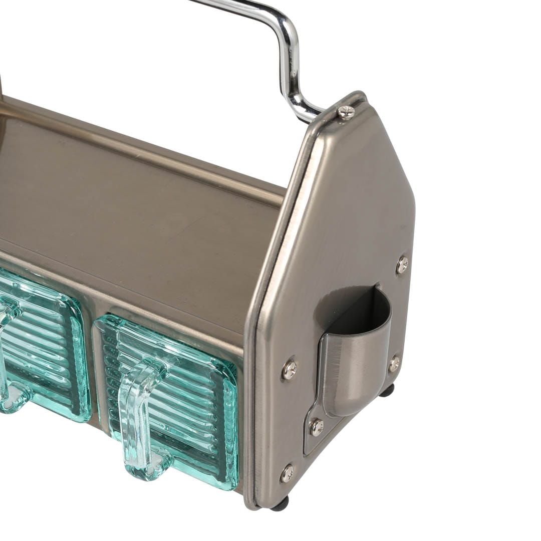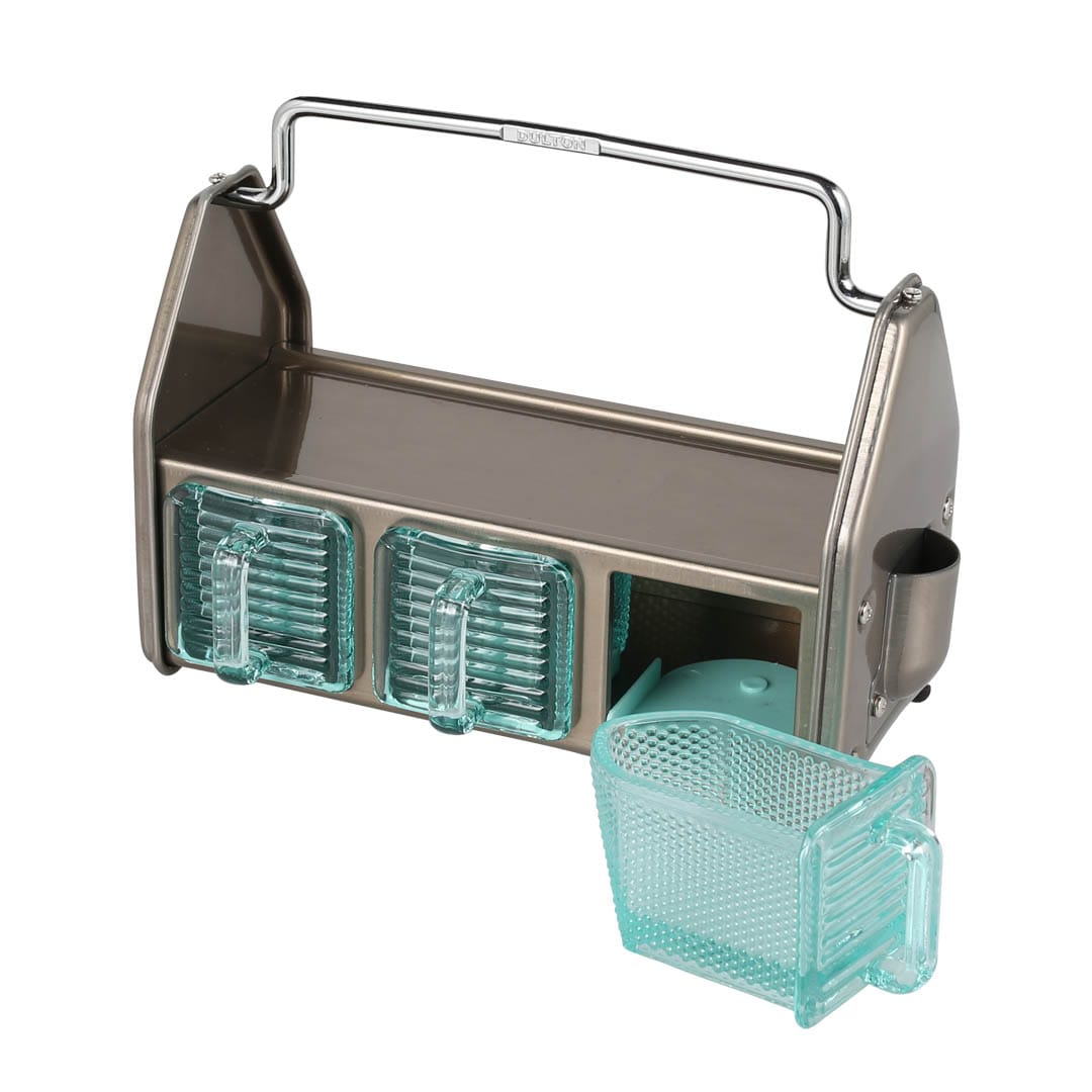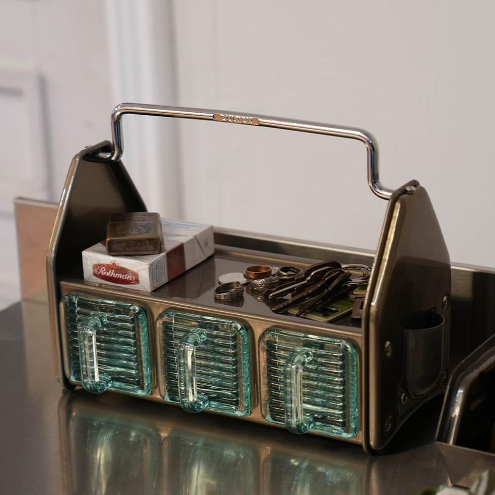 ダイニングテーブルやデスク傍に置いて、調味料や小物をまとめておけるオーガナイザー。3つのガラス容器、トップトレイ、サイドポケットと3タイプの収納スペースで構成されており、角砂糖やクリップなどの細かなものから、調味料やグラス、ペンやハサミなどの様々な形状の小物を収納できます。頑丈なスチールの枠組みと分厚く青みがかったガラス容器の組み合わせは、クラシカルでありながら新鮮な存在感も。これを置くために中に入れる小物を用意したい、そんな衝動買いも大歓迎のアイテムです。