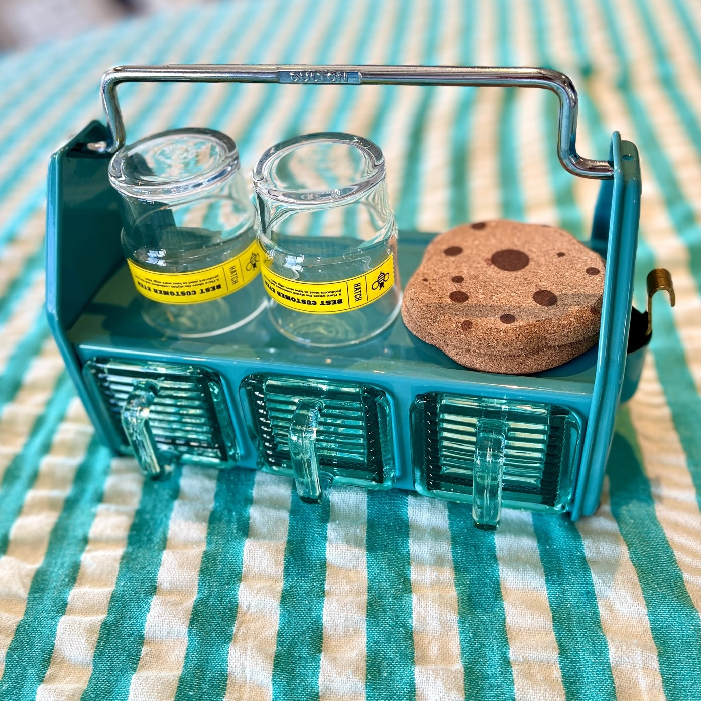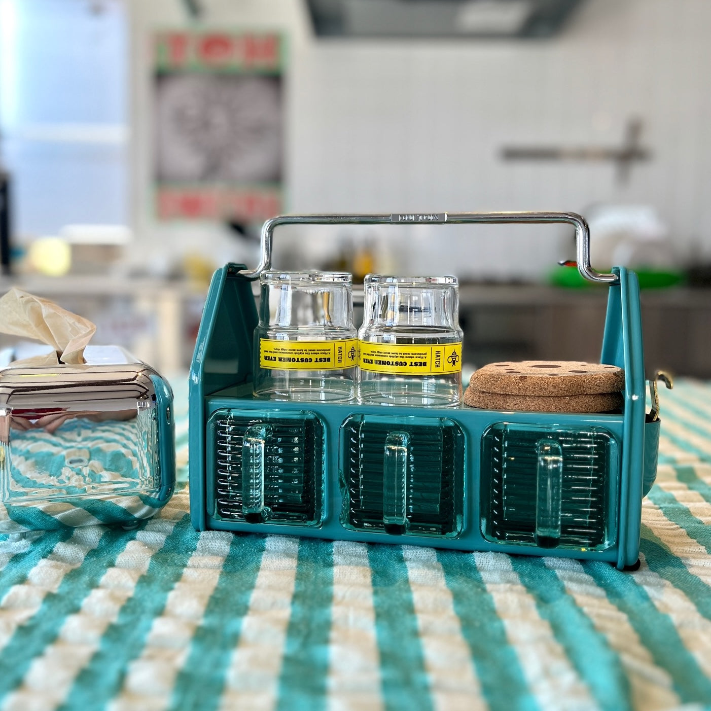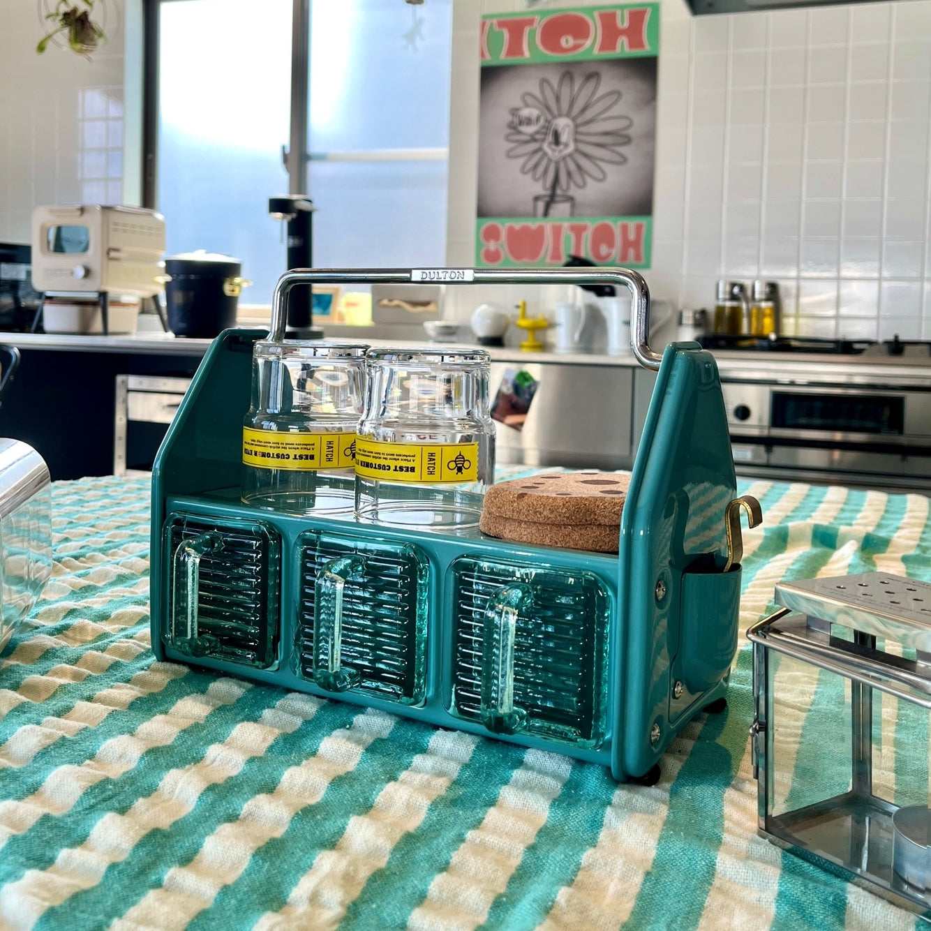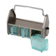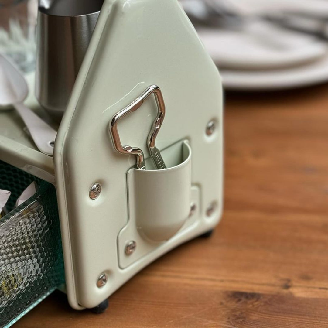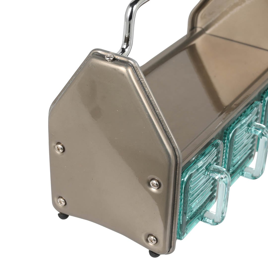 ダイニングテーブルやデスク傍に置いて、調味料や小物をまとめておけるオーガナイザー。3つのガラス容器、トップトレイ、サイドポケットと3タイプの収納スペースで構成されており、角砂糖やクリップなどの細かなものから、調味料やグラス、ペンやハサミなどの様々な形状の小物を収納できます。頑丈なスチールの枠組みと分厚く青みがかったガラス容器の組み合わせは、クラシカルでありながら新鮮な存在感も。これを置くために中に入れる小物を用意したい、そんな衝動買いも大歓迎のアイテムです。