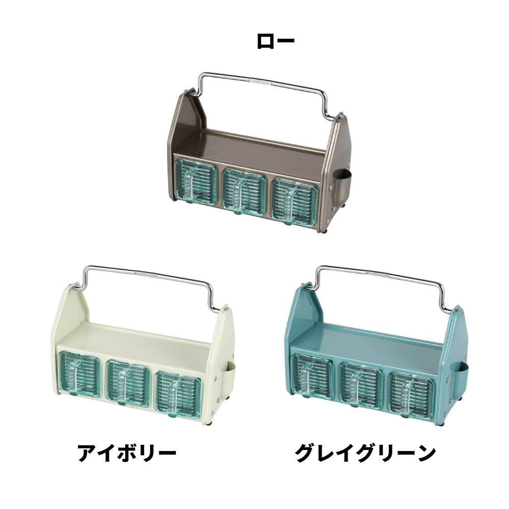 これはやばい、小物収納部門で僕の中の歴代No.1かもしれません。まず、このヴィジュアルと雰囲気…ズルいって。HATCHユーザーなら絶対グッとくるやつです。3つの収納スペース(上部のトレイ、ガラス容器、サイドポケット)で構成されたテーブルオーガナイザーで、ダイニングに置けばアメリカのダイナー風にコーヒーミルクやカトラリー、ナプキン、栓抜きなどをまとめても最高。仕事部屋で文房具や工具を放り込むのも最高。玄関でサングラスや鍵、アクセサリーをざっくり入れてもこれまた最高。グレイグリーンのアメリカンな色味、ローの無骨さ、アイボリーの清潔感…いや、3色ともいいんよ。これは“どこに置くか”より“何色にするか”で悩む系。選びきれなくて、気づいたら「用途に合わせてもう1個買うか」ってなりがち。危ないやつです。