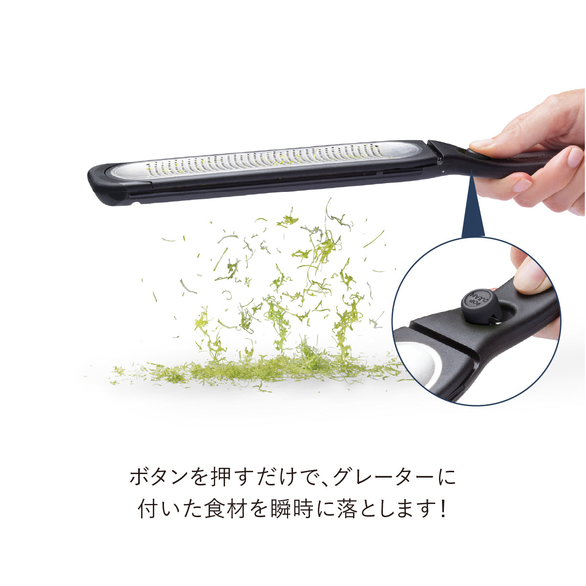 これは本当に最高で、特に柑橘の皮などに使うと香りが段違い!ボタンで食材を弾くから、余す事なく全部使えます。