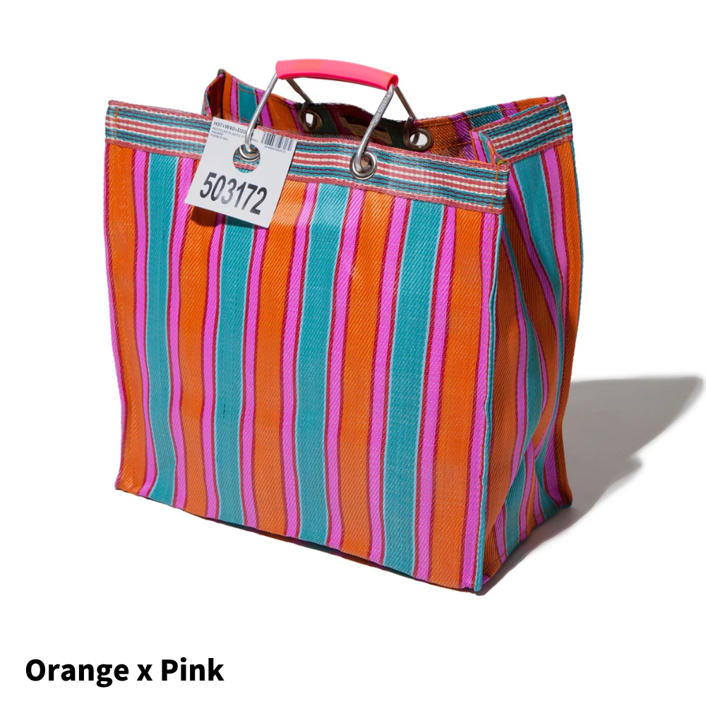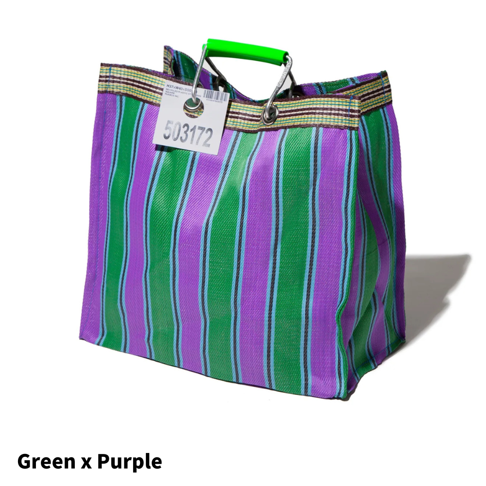 インドの地方からムンバイ空港に到着してすぐ、このバッグに目が止まった。バッグの大きさと、生地の発色がとてもいい印象だ。インドで良く見かけるこの生地だが、ここまで発色の良い物は見た事がなかった。すぐに工場を探した。数ヶ月後、届いたサンプル生地とこの画像を見比べて概ね、同じ物と確認し何を作ろうか考えていた。この生地だけでバッグを作ろうとするとどうしても「可愛く」なってしまう。だから工業的な印象に仕上げたかった。試作品はハンドルを鉄で作った。見た目は良いが重く使いにくかったのでアルミニウムでハンドルを作る事にした。また持ち手の保護用に水道ホースを使うことにした。