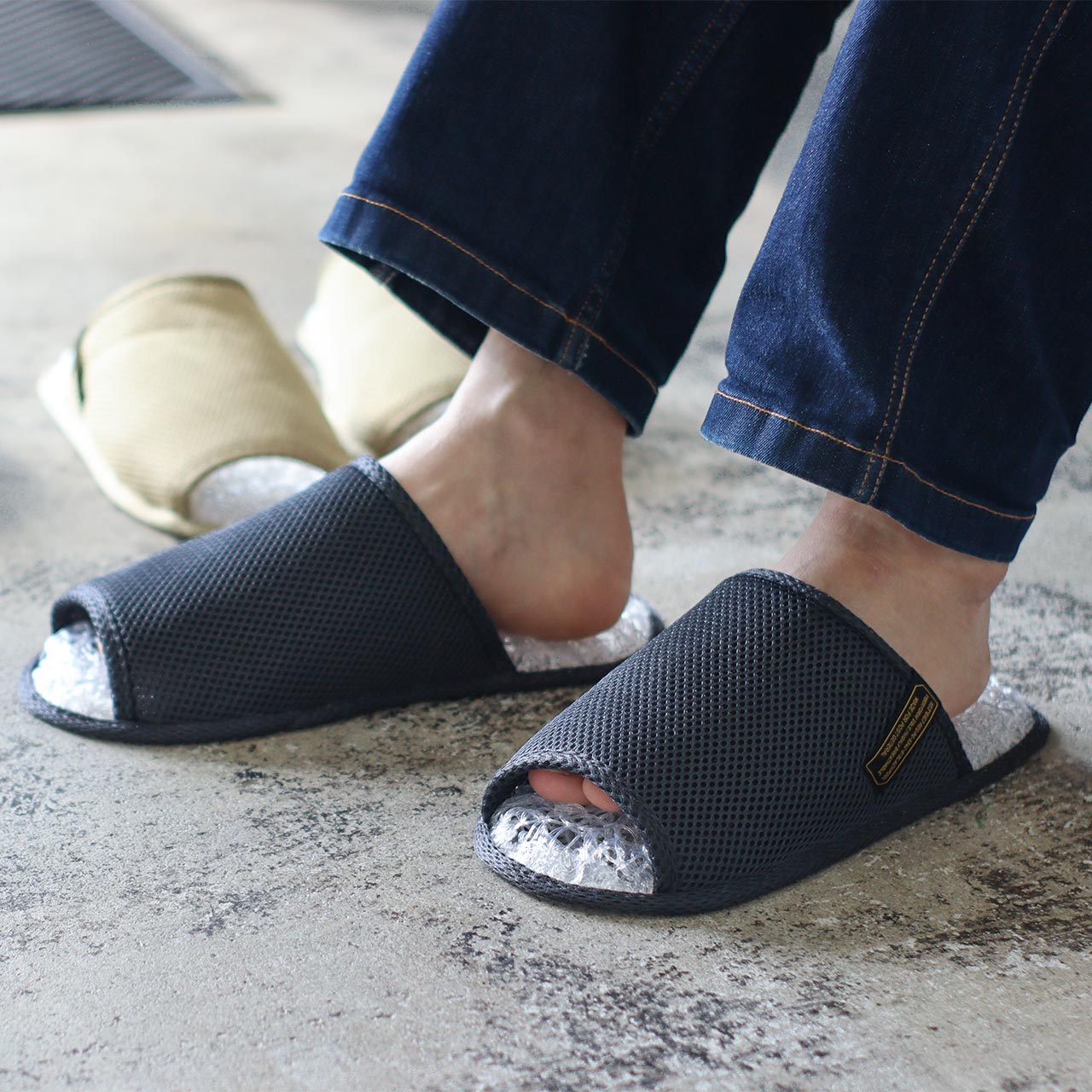 汗による蒸れや匂い、洗えないといったストレスを解消してくれる新発想の高通気性スリッパ。ソールにベッドマットレスなどで使われる高反発ファイバー(ポリオレフィンエラストマー)を使用し、程よい弾力と通気性が素足でも快適な履き心地をキープします。丸洗いも可能なので、いつでも清潔に保てて衛生的。(※手洗いをおすすめしますが、洗濯機をご使用の際は、洗濯ネットに入れて「弱モード」等で洗濯してください。)持ち運びに便利な収納バッグ付きなので、旅行やお子様の学校行事など様々なシーンで活用いただけます。