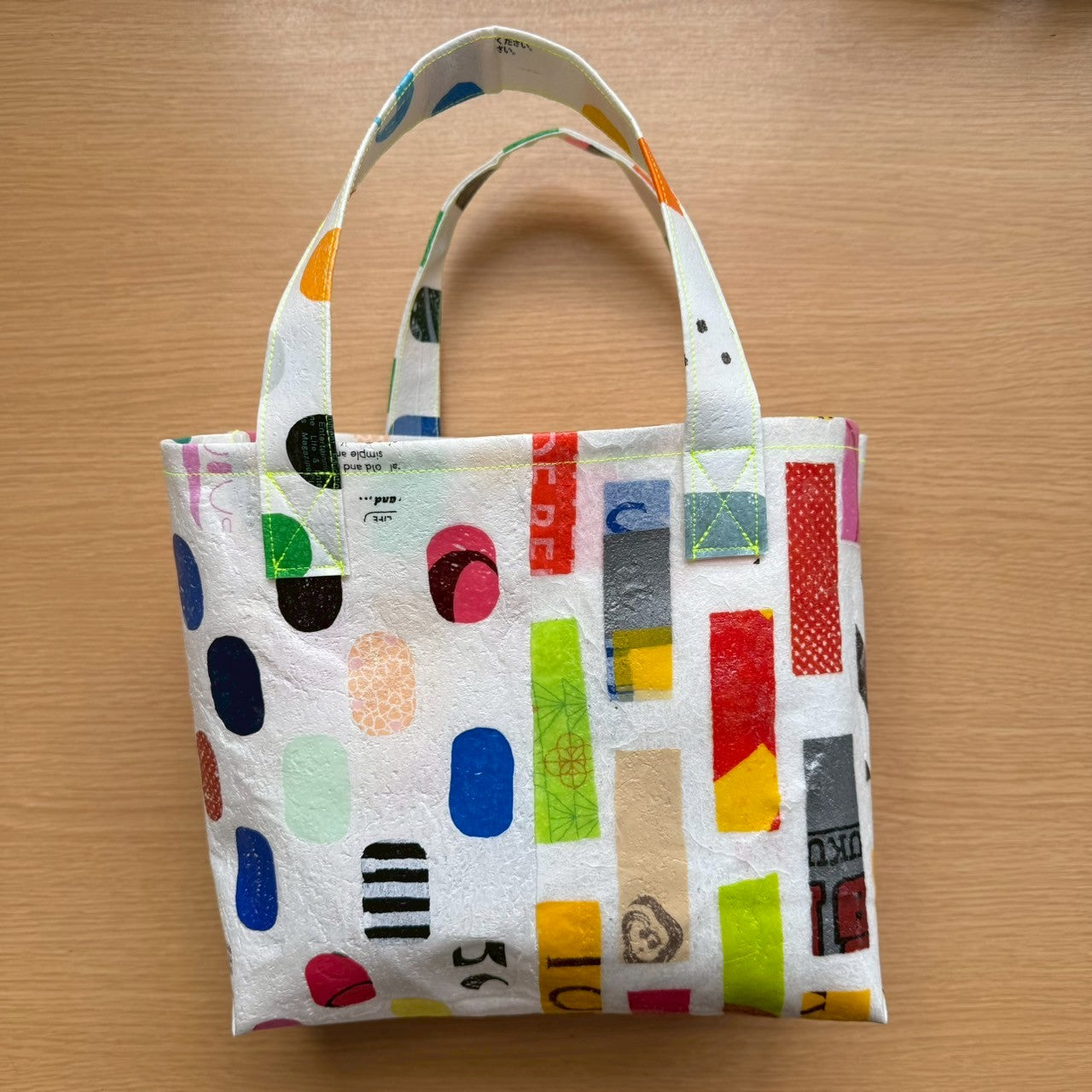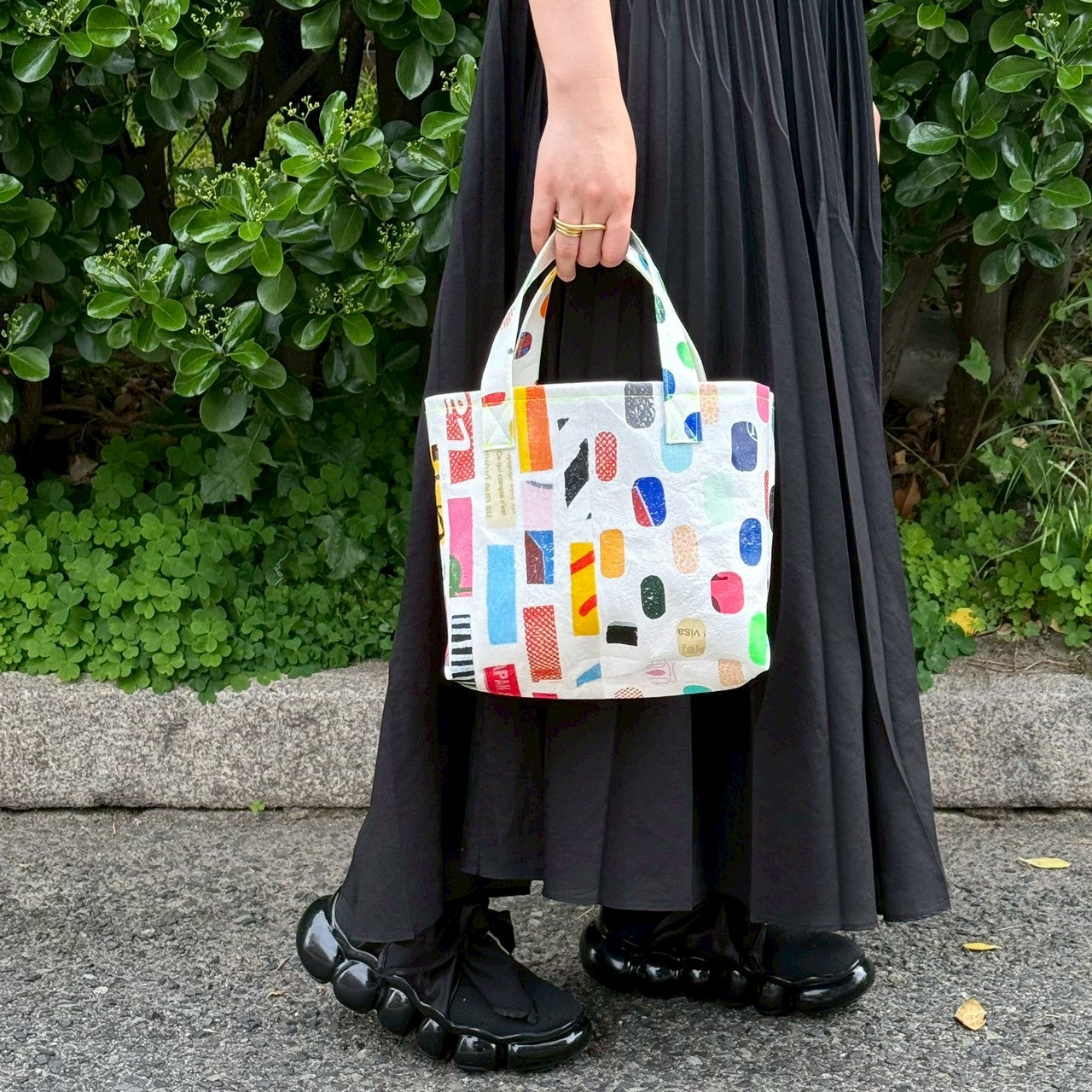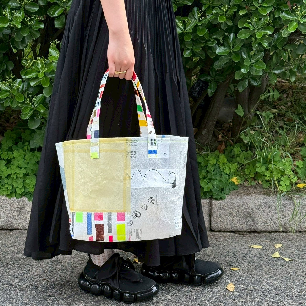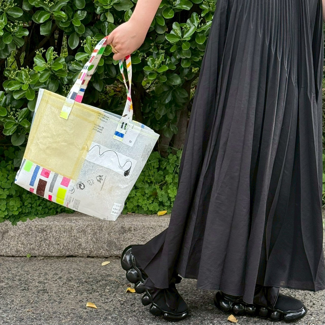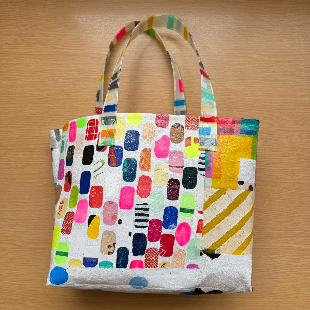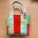 poRiff の主な材料は買い物をしたときにもらうレジ袋です。一見捨ててしまうようなレジ袋をコラージュし、熱で圧着して完成するシートを使ってプロダクトに変えています。このかばんは、軽量でたくさんのレジ袋を組み合わせて作ったポップなデザインです。水に強いので旅行などにもオススメです!