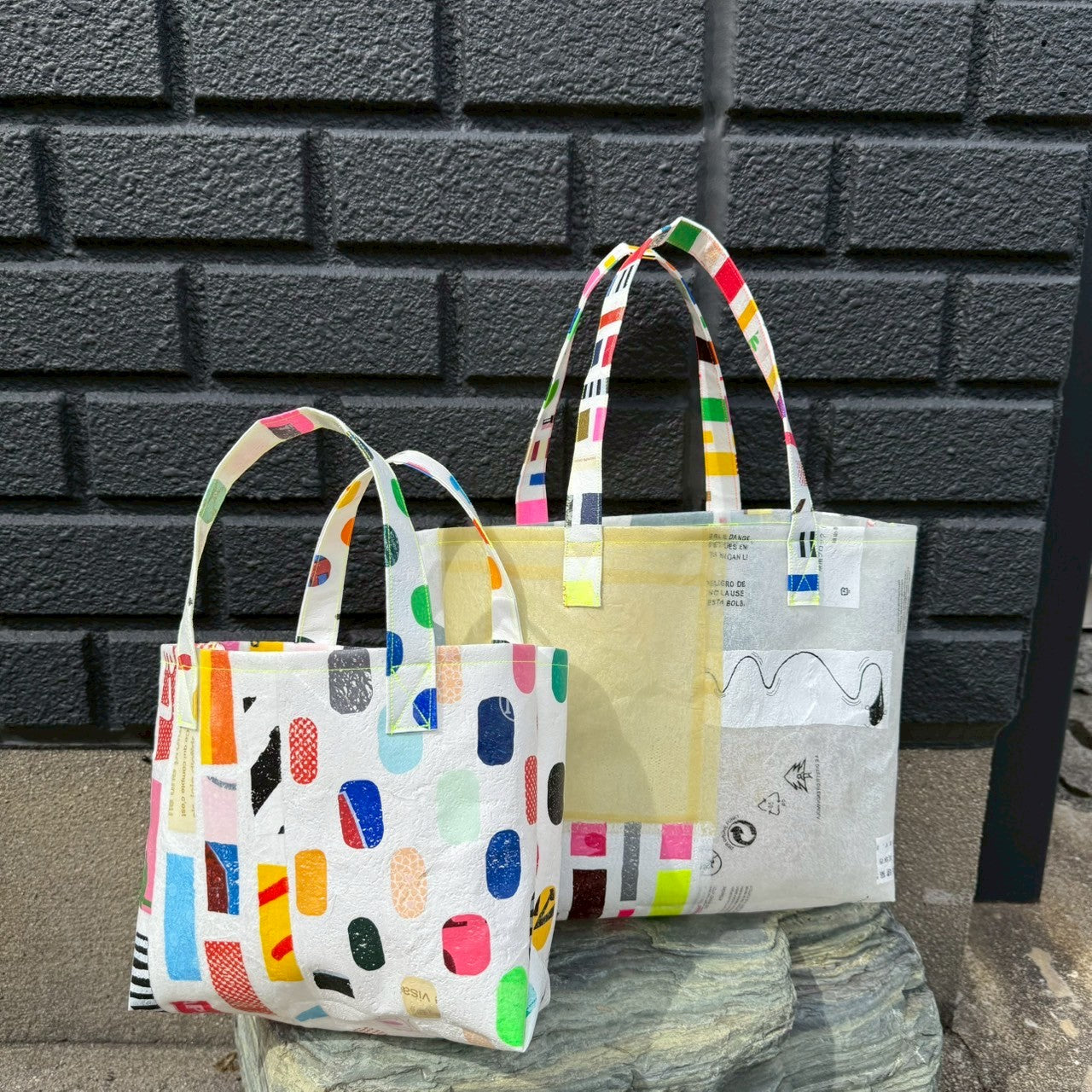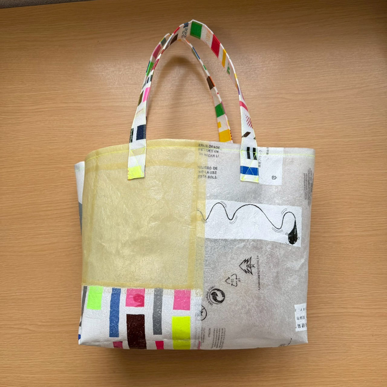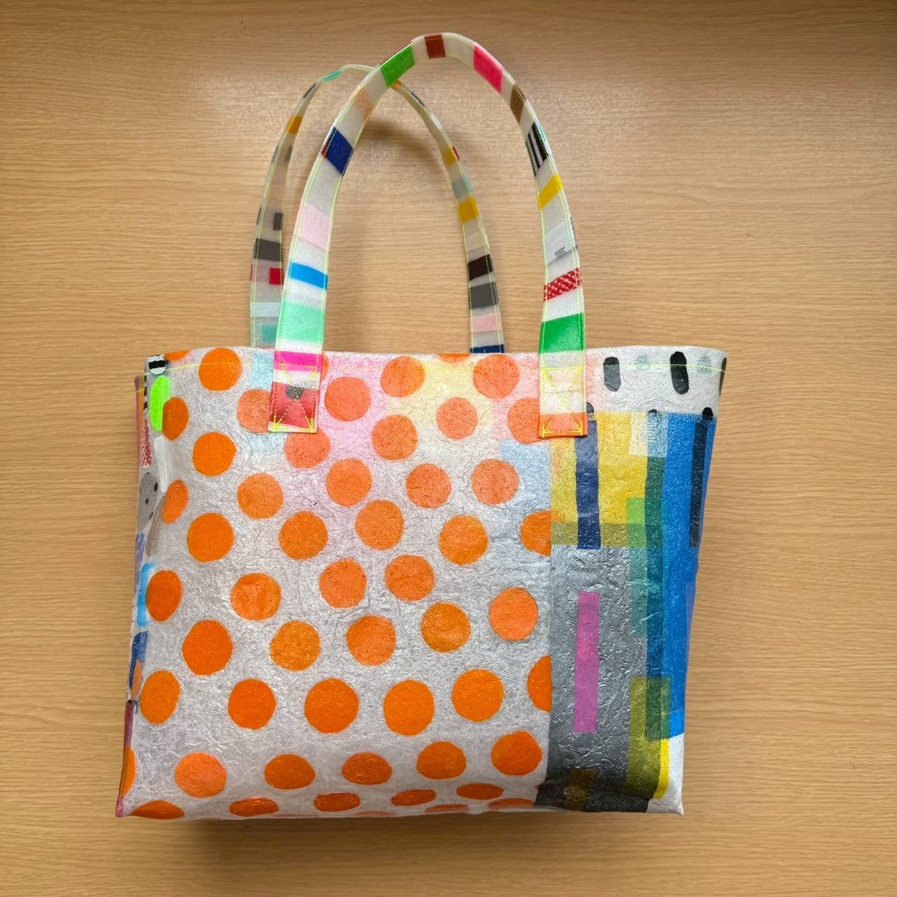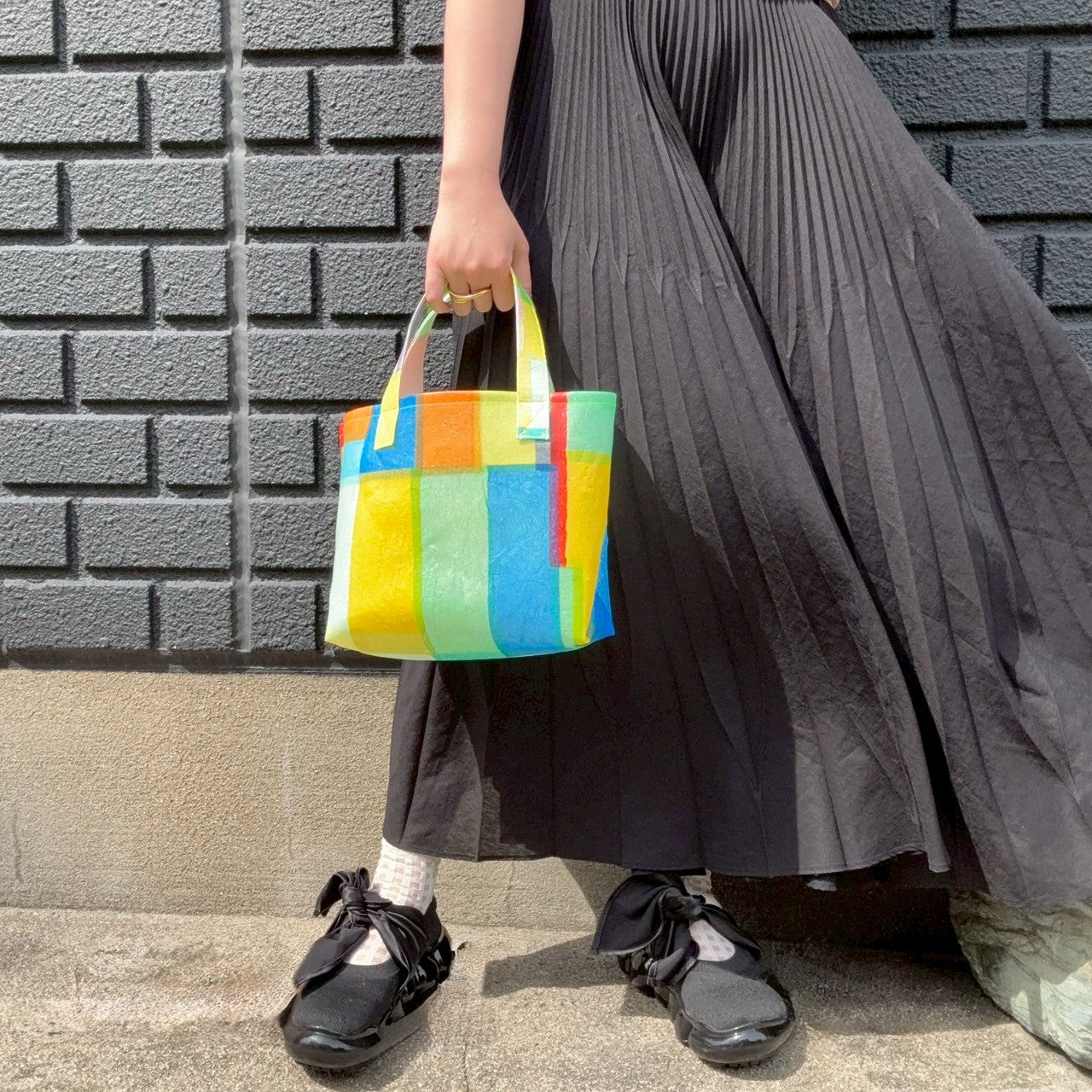 poRiff の主な材料は買い物をしたときにもらうレジ袋です。一見捨ててしまうようなレジ袋をコラージュし、熱で圧着して完成するシートを使ってプロダクトに変えています。このかばんは、軽量でたくさんのレジ袋を組み合わせて作ったポップなデザインです。水に強いので旅行などにもオススメです!