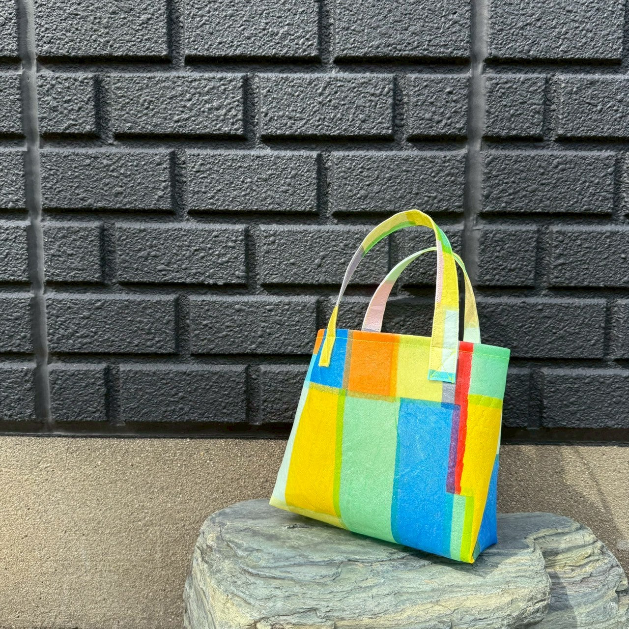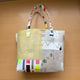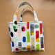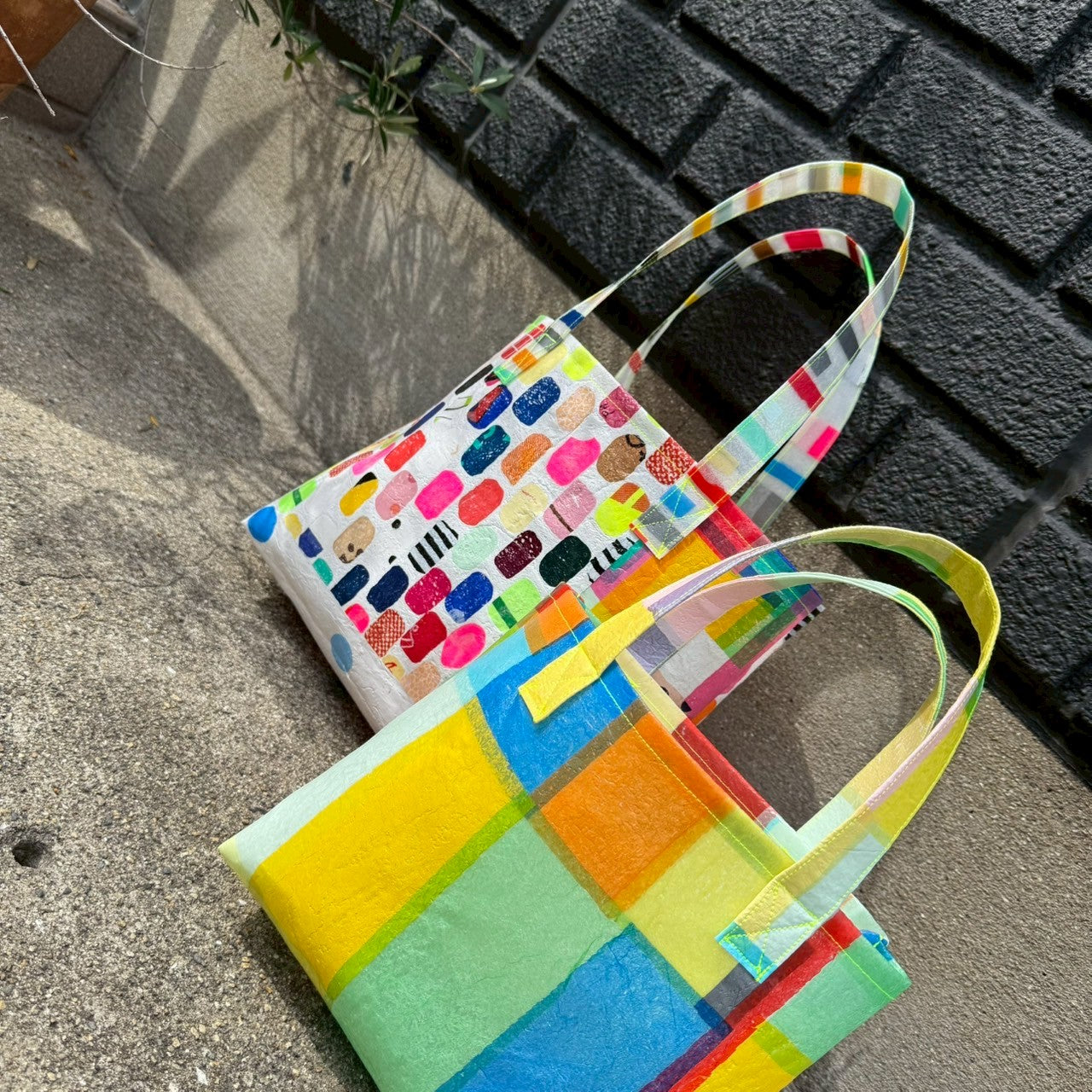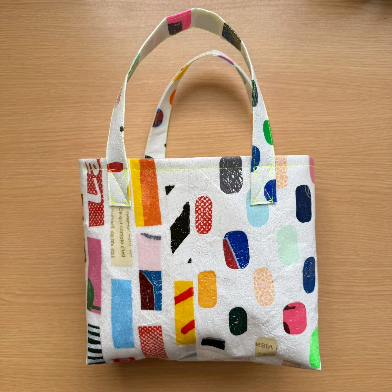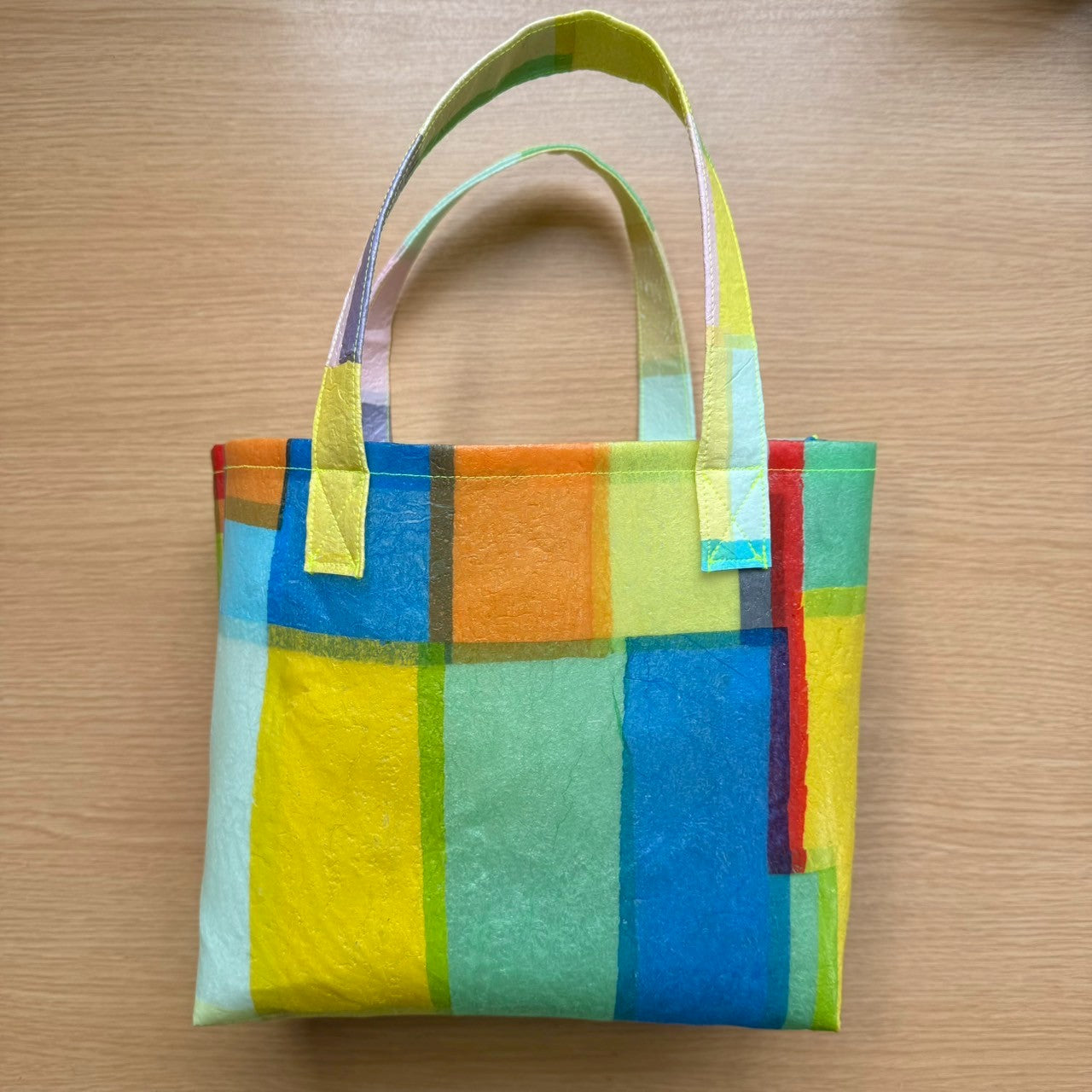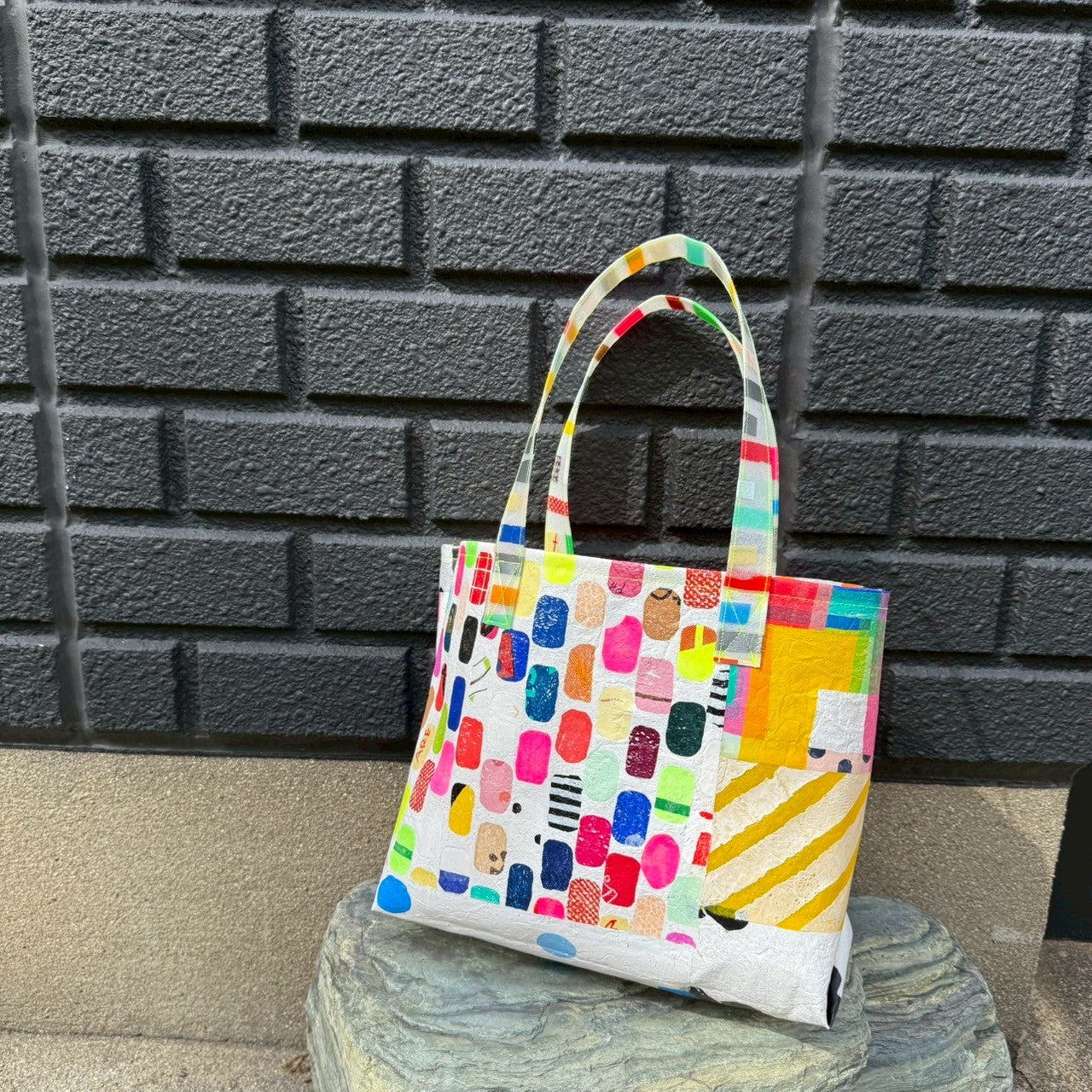 poRiff の主な材料は買い物をしたときにもらうレジ袋です。一見捨ててしまうようなレジ袋をコラージュし、熱で圧着して完成するシートを使ってプロダクトに変えています。このかばんは、軽量でたくさんのレジ袋を組み合わせて作ったポップなデザインです。水に強いので旅行などにもオススメです!