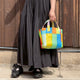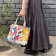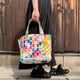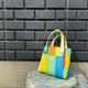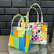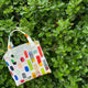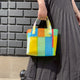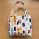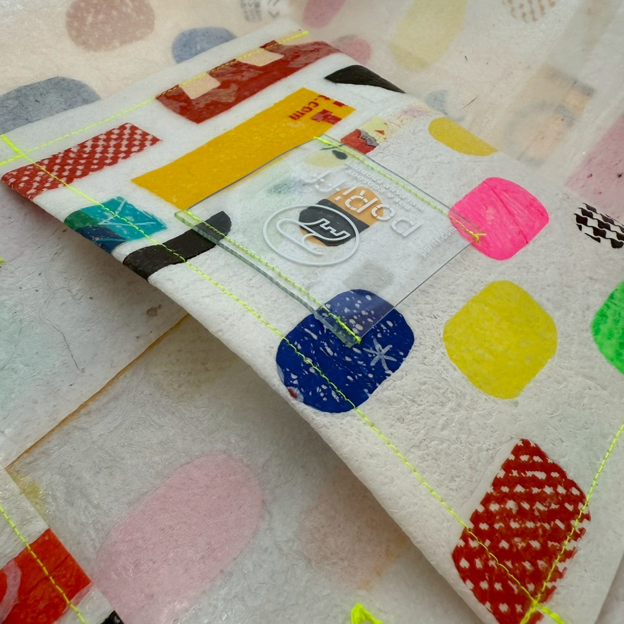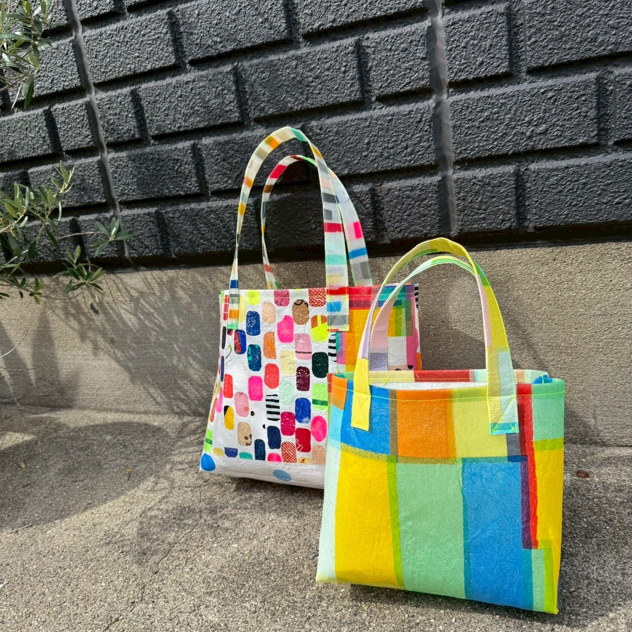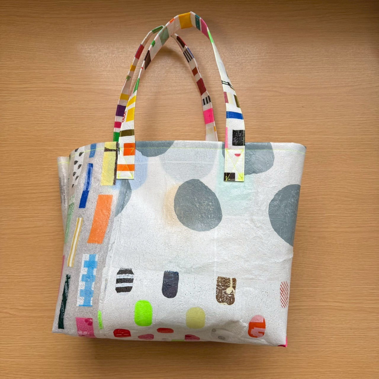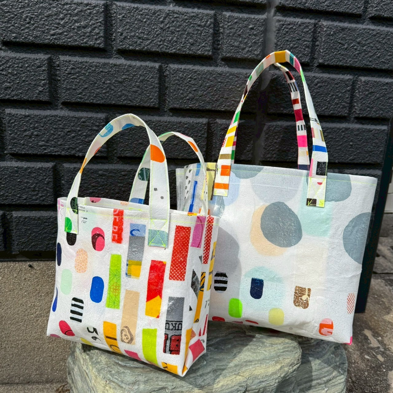 poRiff の主な材料は買い物をしたときにもらうレジ袋です。一見捨ててしまうようなレジ袋をコラージュし、熱で圧着して完成するシートを使ってプロダクトに変えています。このかばんは、軽量でたくさんのレジ袋を組み合わせて作ったポップなデザインです。水に強いので旅行などにもオススメです!