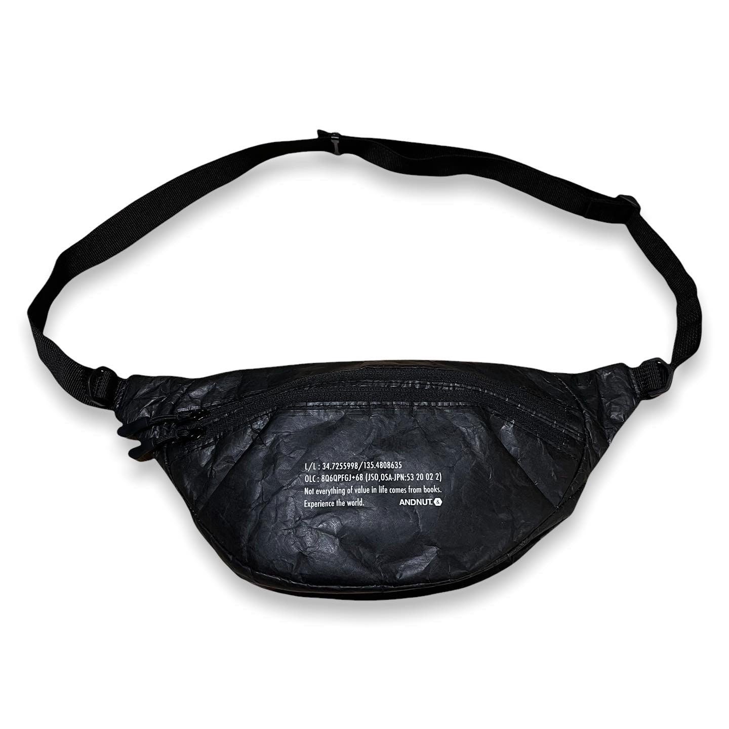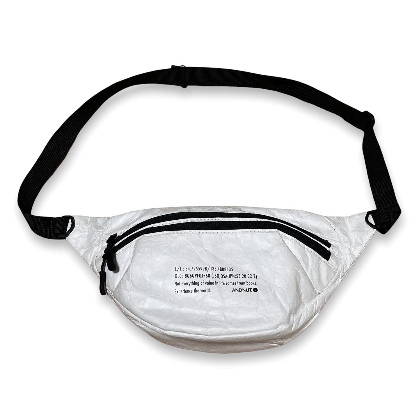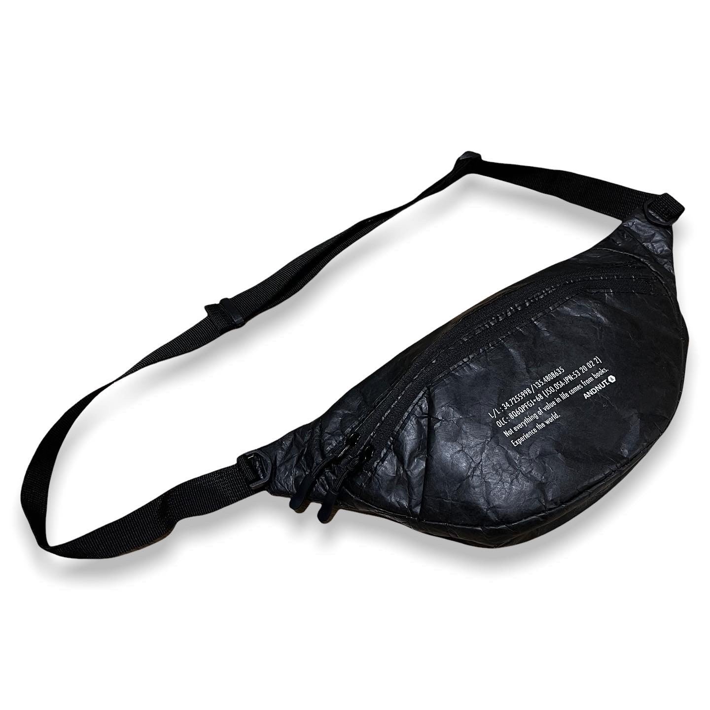 高密度ポリエチレン繊維不織布素材のウエストバッグです。ていうか、高密度ポリエチレン繊維不織布素材ってなんなの?って感じですよね。主な特徴は、軽くて、水に強く、強度があって、ムレにくいこと。最初は紙のような見た目と質感ですが、一度手でほぐすとシワができ柔らかくなり本来の質感になります。軽くて持ち運びがしやすく丈夫なので、エコバッグや旅行ポーチなどにも最適な素材なんです。WAIST BAG自体は、フロントにジップが2本あり内側の大きな荷室とフロントポケットに分かれています。バッグの両脇にDカンが付いているので、カラビナなどを用いキーホルダーやコインパースなどをぶら下げておくこともできます。また本体裏、身体にあたる側にもジップポケットを配置。スマホや、海外旅行などでパスポートを入れておいたりするのにピッタリです。
