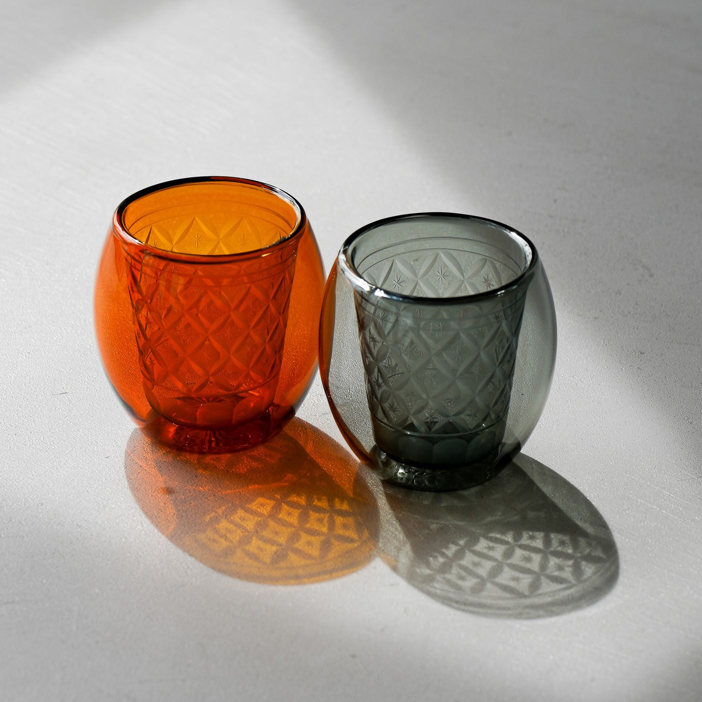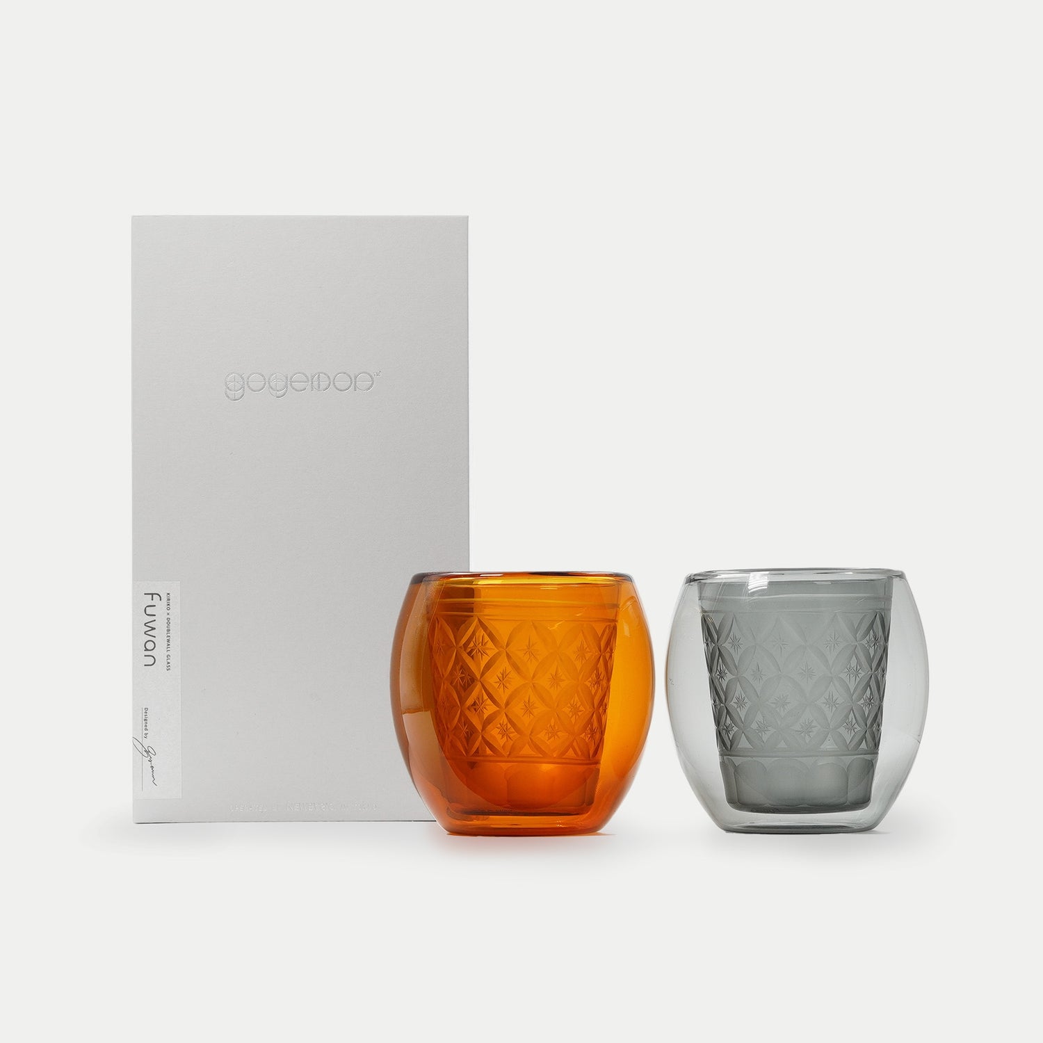 切子の美しさと機能を兼ね揃えた、“まるで浮いているような切子グラス” 。耐熱ガラスでつくられたダブルウォール構造の切子グラスは、電子レンジ対応などの機能性を向上させ、現代の食卓に馴染むよう設計。 切子グラスの魅力を身近に感じられる一品に。琥珀・黒曜ペアセット。