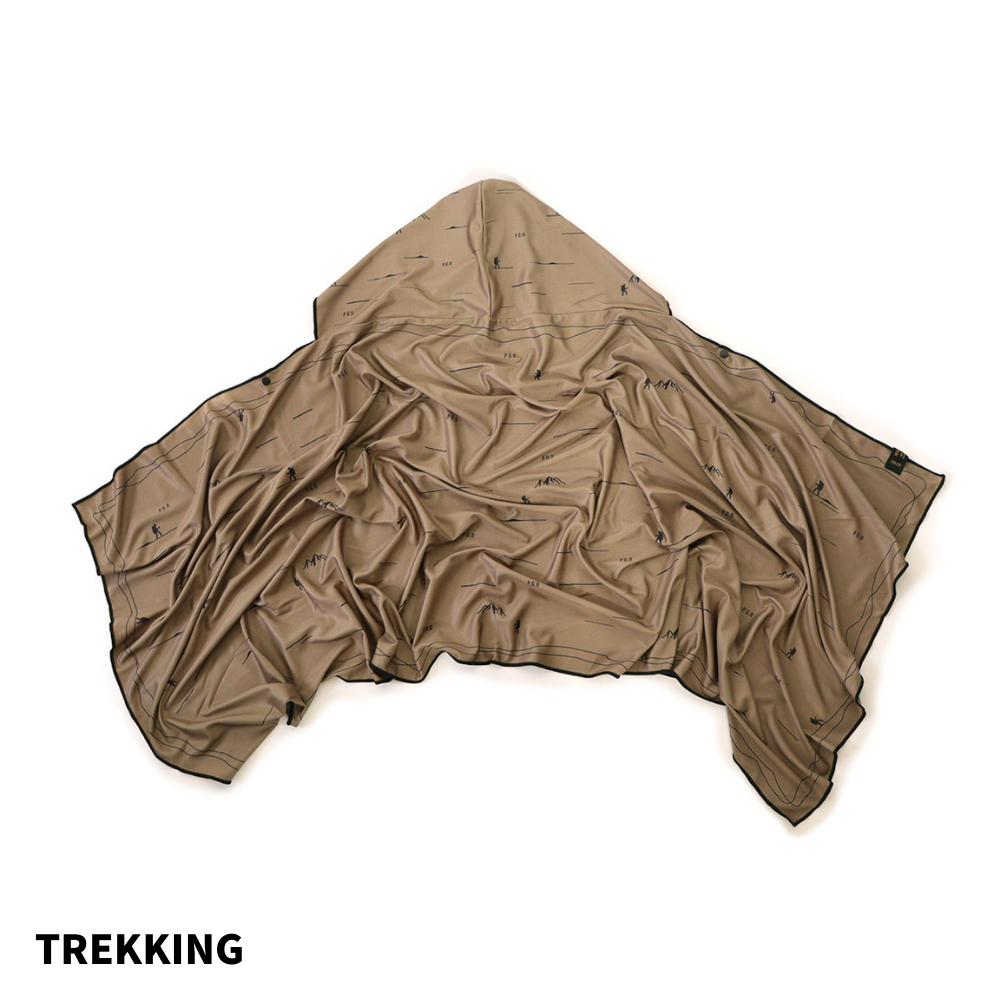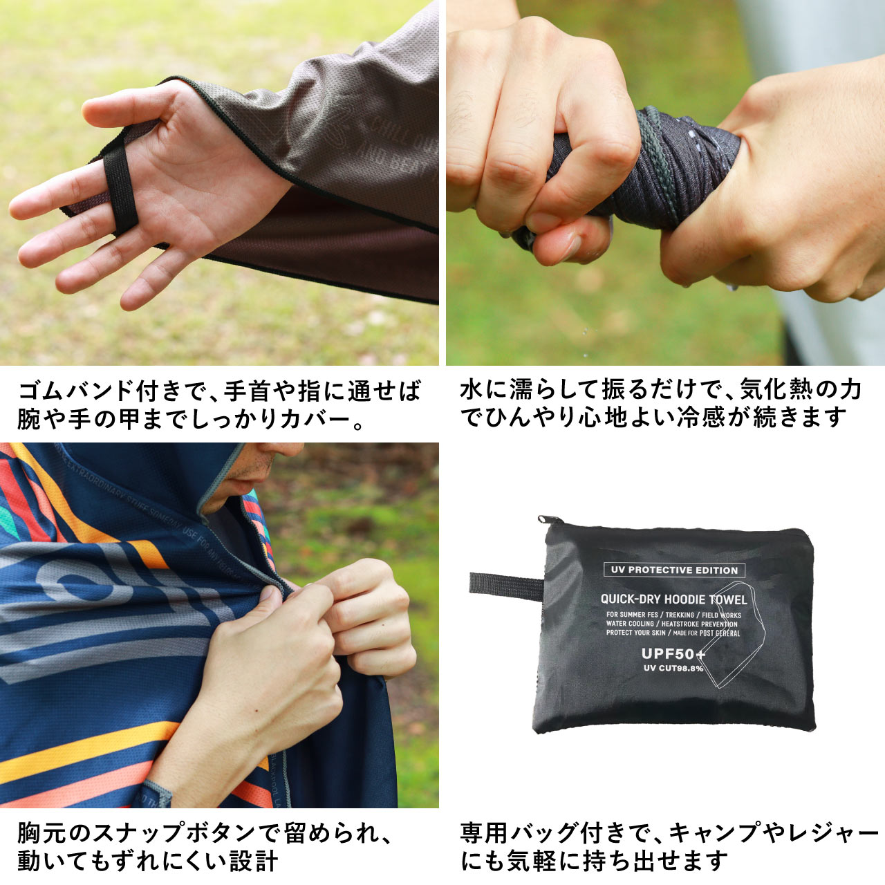 水に濡らして絞り、空気中で軽く振るだけ。気化熱の作用により、ひんやりとした冷感が得られるクーリング機能を備えた、ポンチョのように被れるBIGサイズタイプです。身体をゆったり覆えるサイズ感で、暑い季節でも快適な使い心地を実現します。頭や首元はもちろん、肩まわりまでしっかりカバー。UPF50+(紫外線カット率約98.8%)のUVカット仕様で、日差し対策としても安心してお使いいただけます。タオルの両端には、手首や指を通してずれ落ちを防ぐゴムバンド付き。動いても安定した使い心地で、快適にご使用いただけます。 折りたたんでコンパクトに持ち運べる専用バッグ付き。バッグやリュックにすっきり収納でき、外出先やレジャーシーンでも便利にお使いいただけます。フェスやトレッキング、アウトドア、スポーツ観戦など、猛暑日のさまざまな屋外シーンに。 実用性とデザイン性を兼ね備えた、これからの季節に頼れる一枚です。