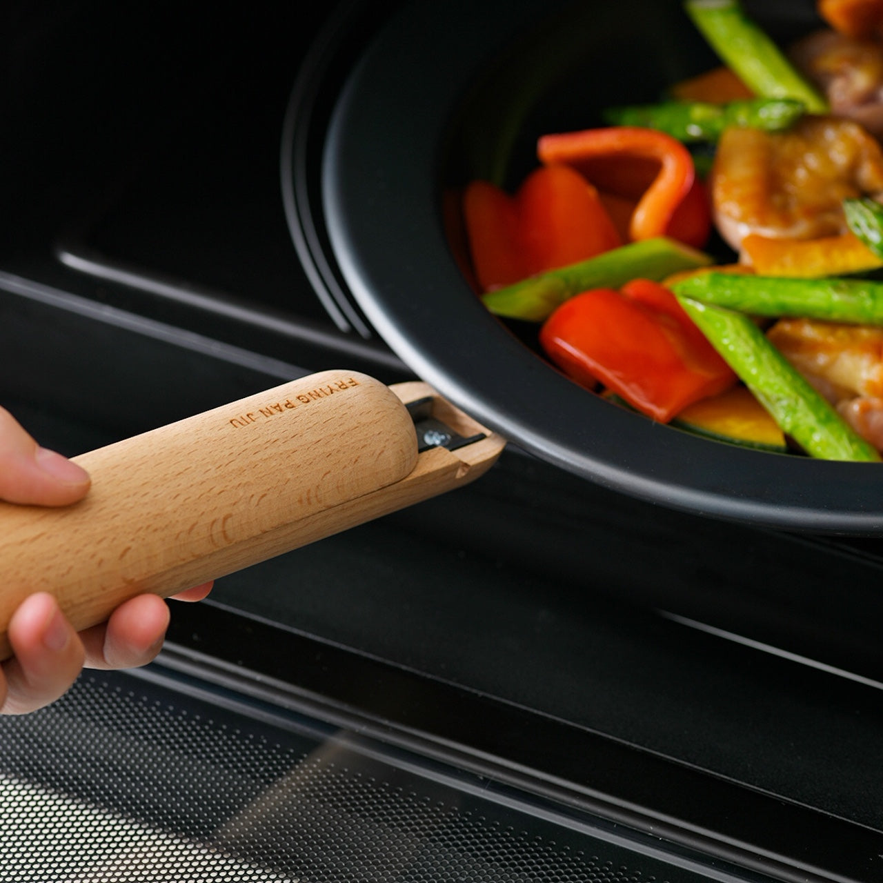 360度どこからでもスムーズに着脱できるスライド式ハンドルにより、収納しやすさと調理しやすさを両立。そのまま食卓に出しても違和感のない「お皿」のような佇まいを実現しています。厚手の鉄板を使っているので、外はカリッと中はモチモチ、簡単に美味しく調理できます。オーブン、ガス火はもちろん、200V(※)のIHにも対応。全ての熱源での使用が可能です。4種類のフライパンサイズと2種類のハンドル樹種から、自由に組み合わせて使用が可能、重ねて収納することもできます。