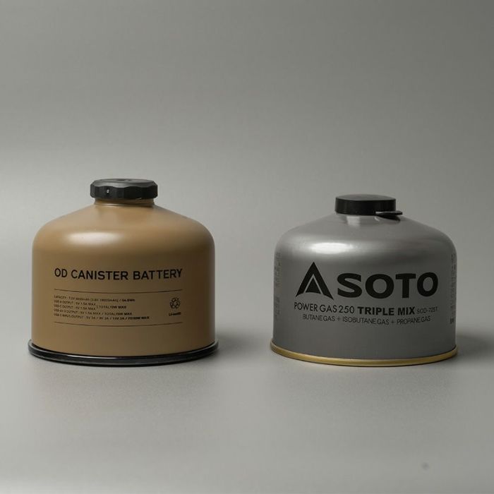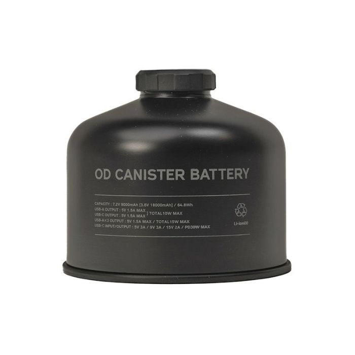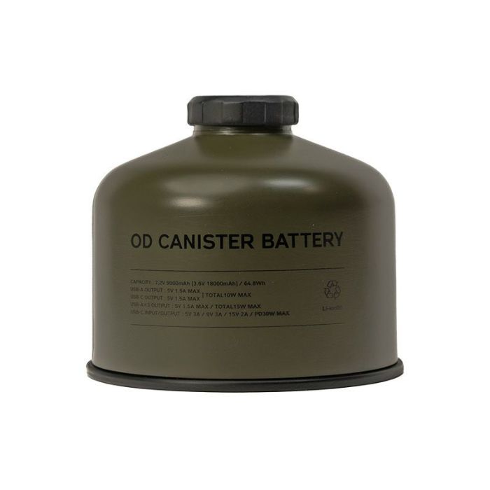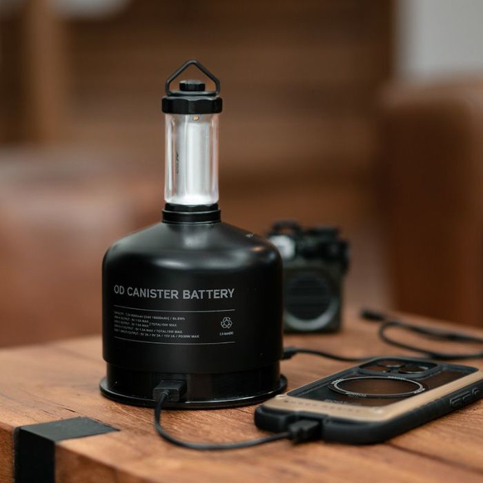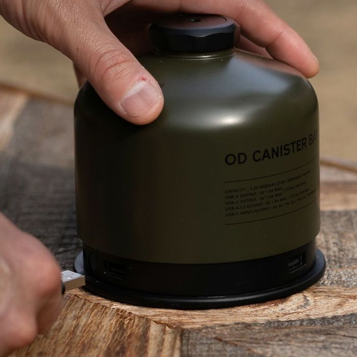 バッテリーの方はっていうと、はい完全に男子が好きなやつ。まず見た目。フォルムもデザインもOD缶とほぼ同じという。色味も質感もギアっぽさ全開なのに、部屋に置いてもこの違和感が逆にしっくりくる絶妙なバランス。友達に、なんでガス缶置いてるの?って必ず突っ込まれます。もちろん外見だけじゃない。バッテリーは19,200mAhの大容量で、スマホを3-4回フル充電できちゃう。USBポートが6つ搭載されていて、360度囲んで使える。