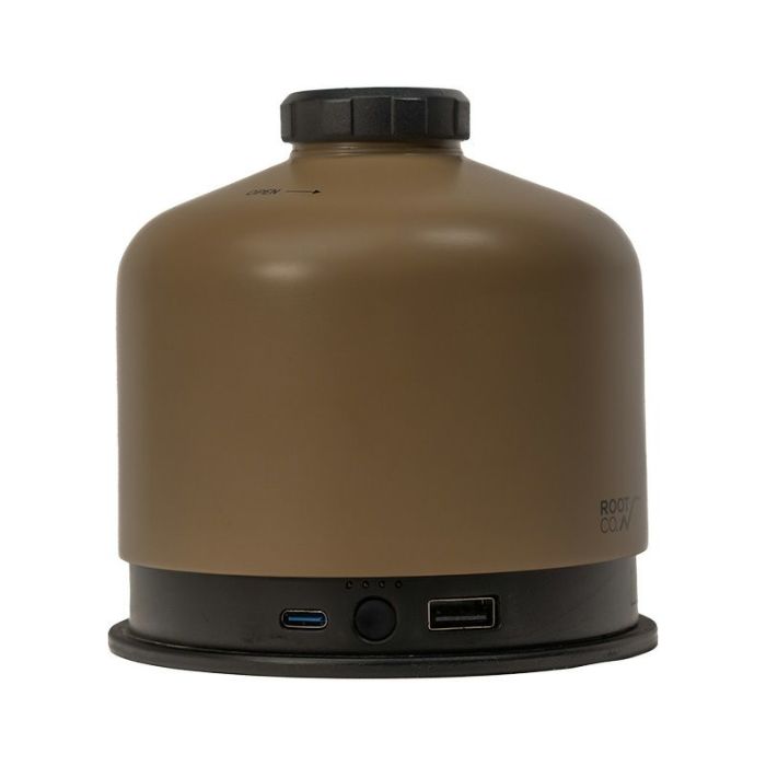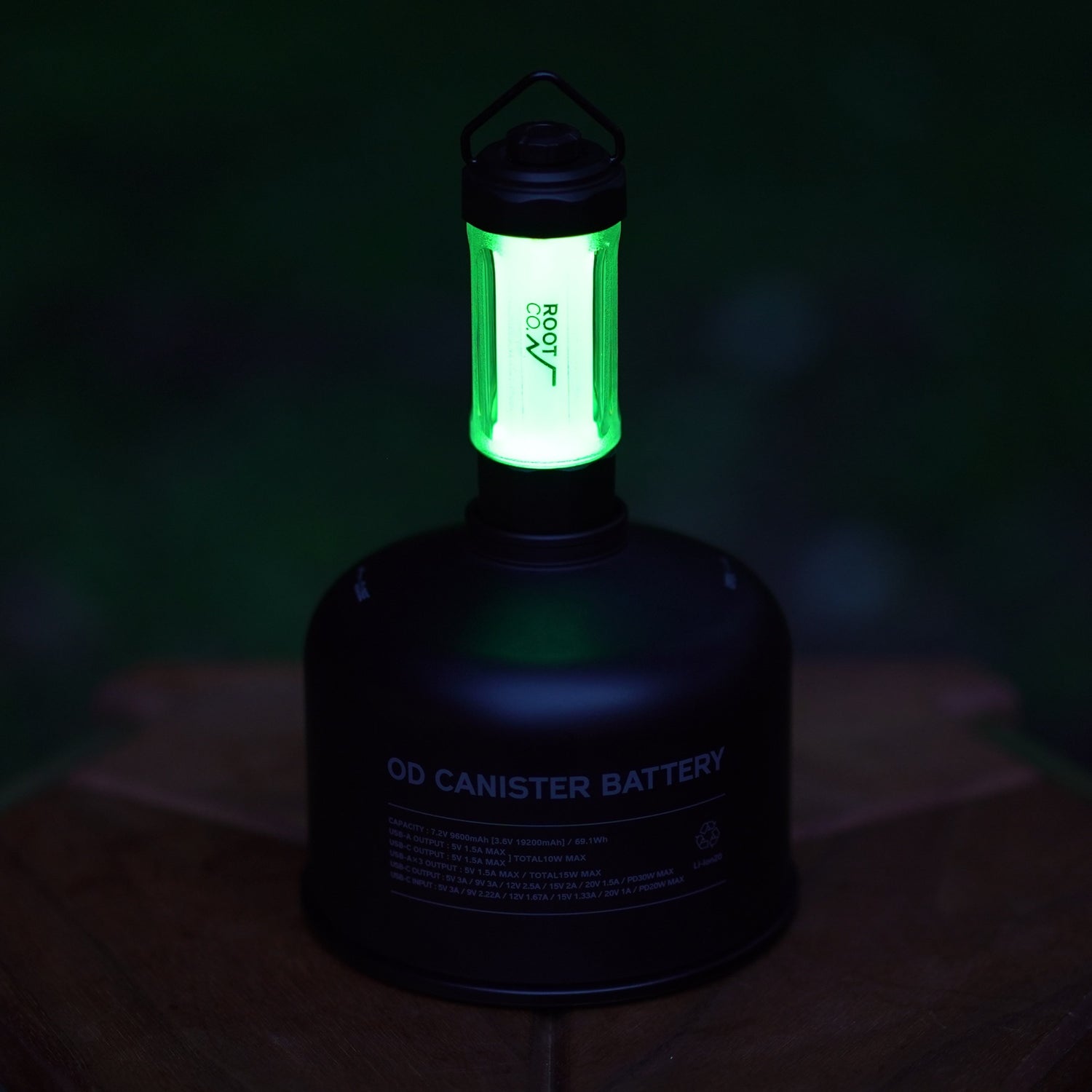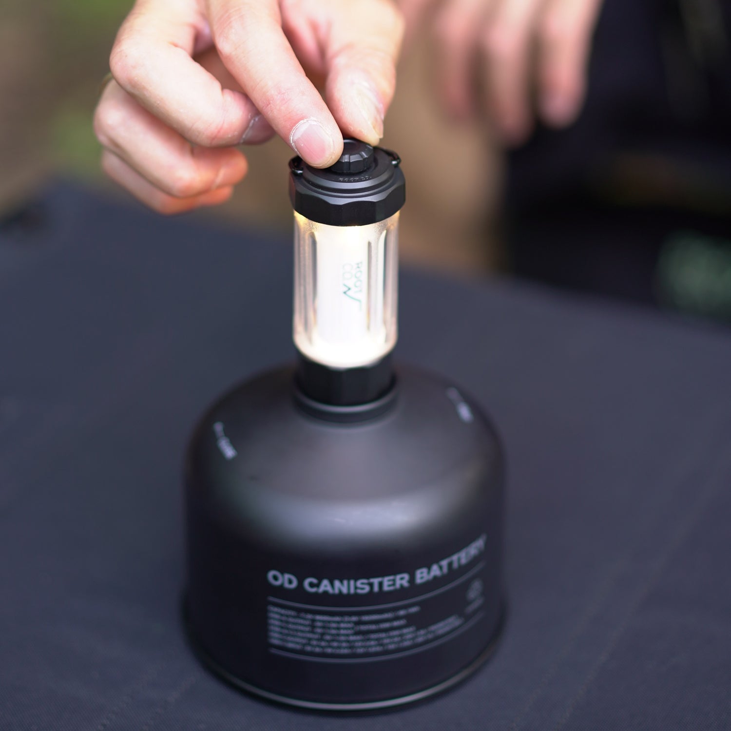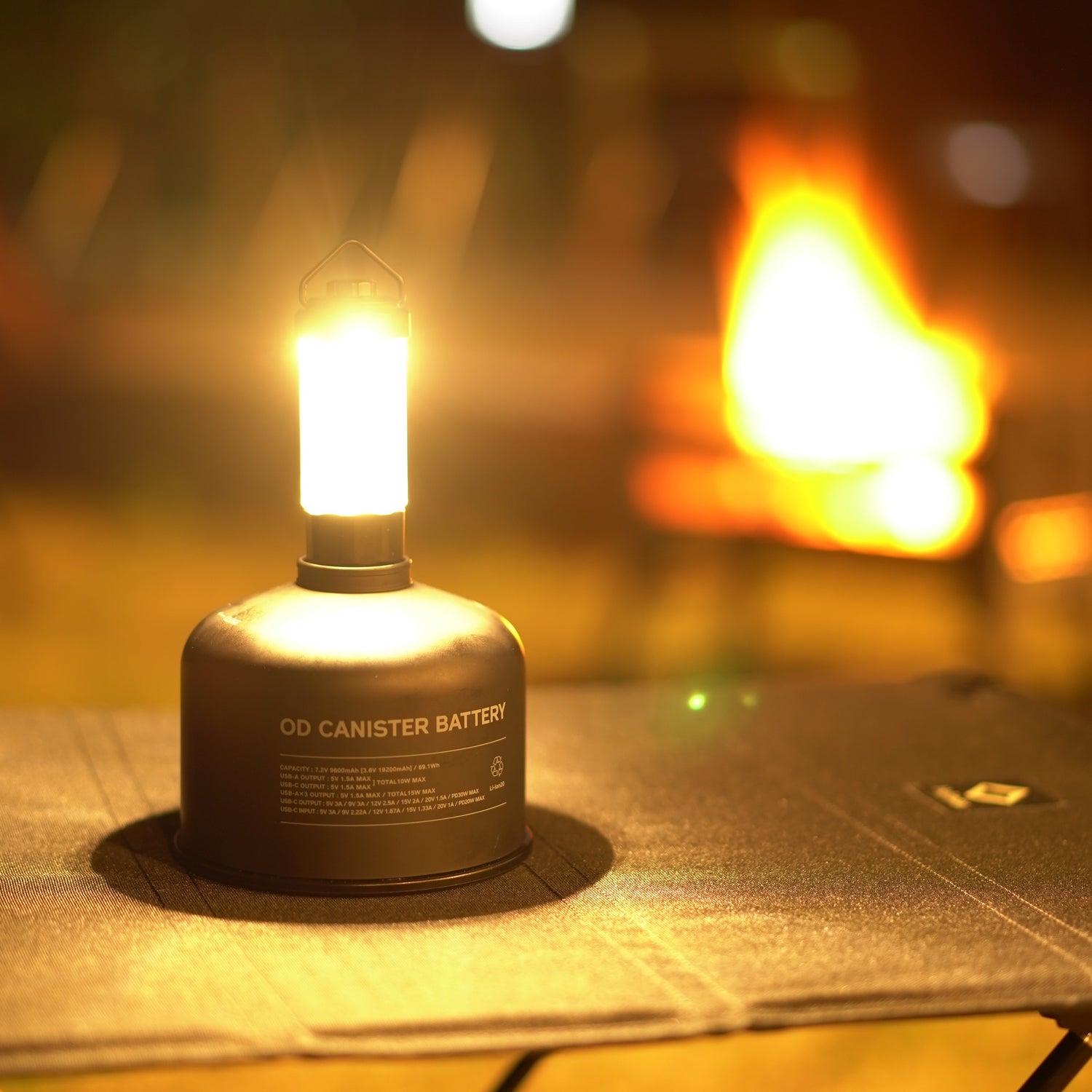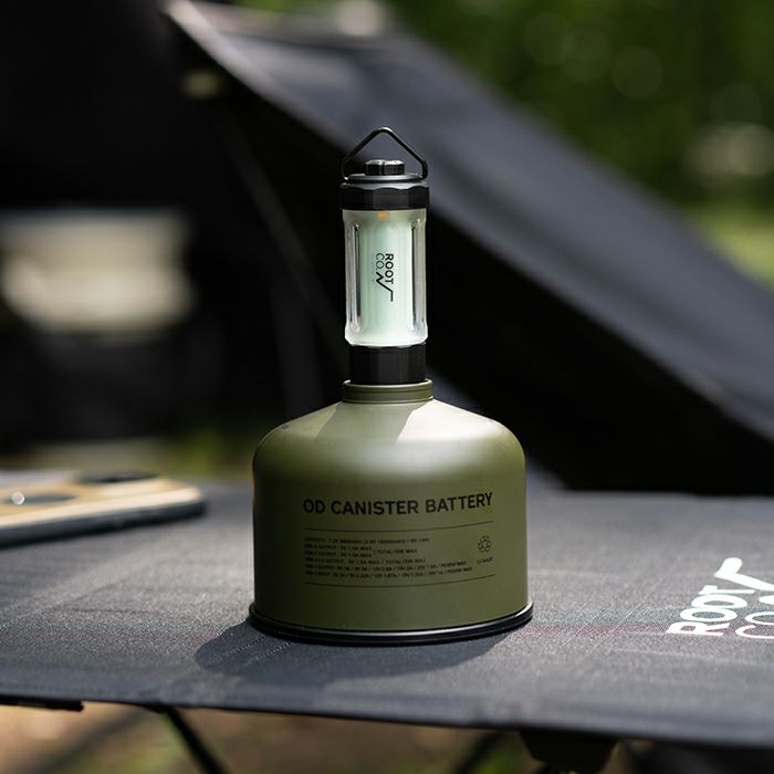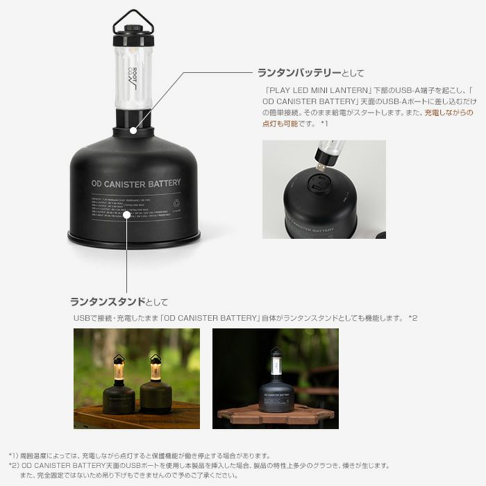 バッテリー容量19,200mAh & 6つのUSBポートを搭載、スマホを3~4回フル充電可能。デザインはアウトドアでおなじみのOD缶と同等フォルムを採用。キャンプシーンとも親和性があり、卓上に置いて使用する際や持ち運びなどの利便性が良いのも特徴です。ソロキャンプではもちろん、360度どの向きからでもアクセスしやすい充電ポートの配置のため、複数人で囲んで“ハブバッテリー”としての使用も可能。また、急速充電にも対応しており様々なスマートフォン・ランタンなどのギア・ガジェット類をチャージ可能です。別売の「ミニLEDランタン」をアタッチメントすることで、スタンド拡張バッテリーとしてもお使いいただけます。