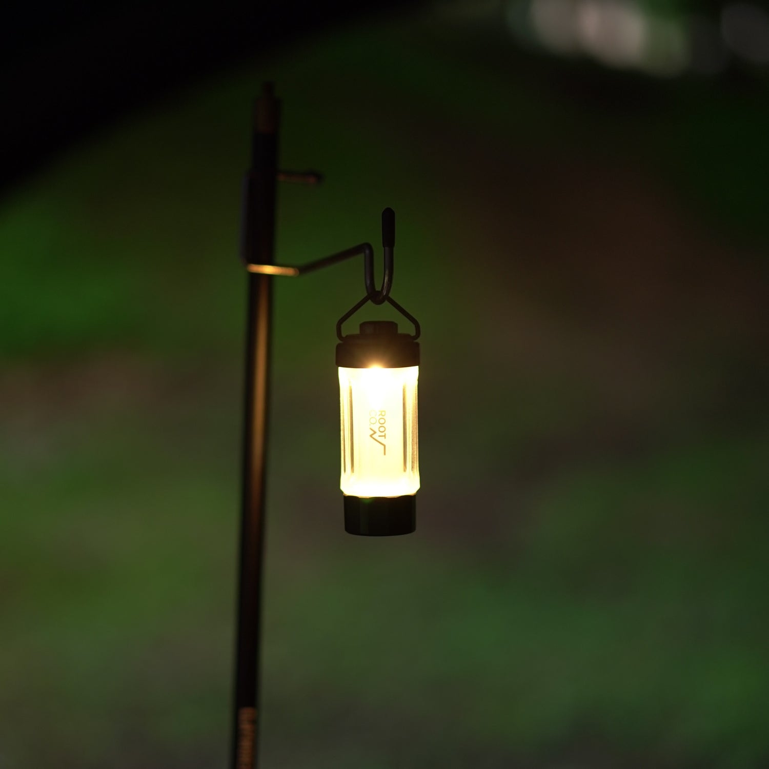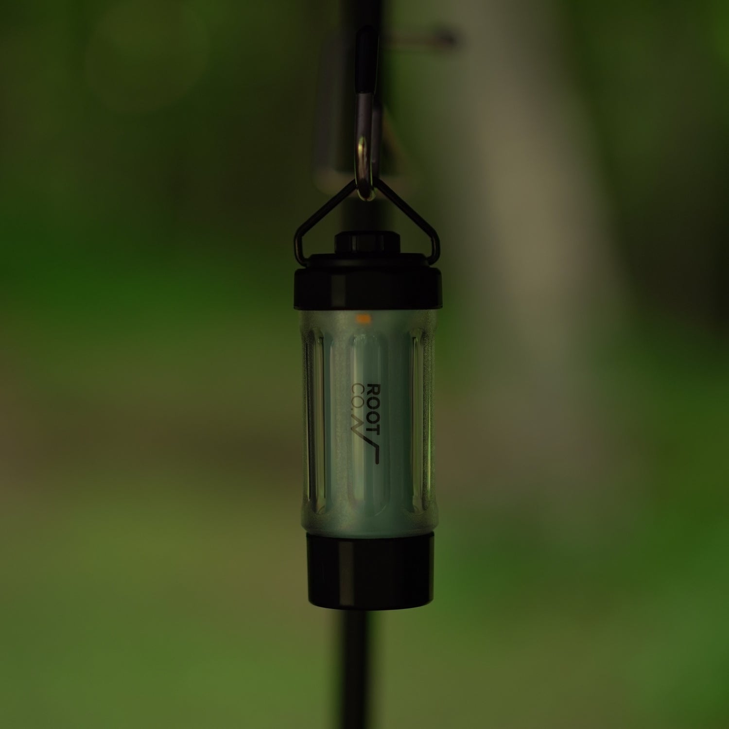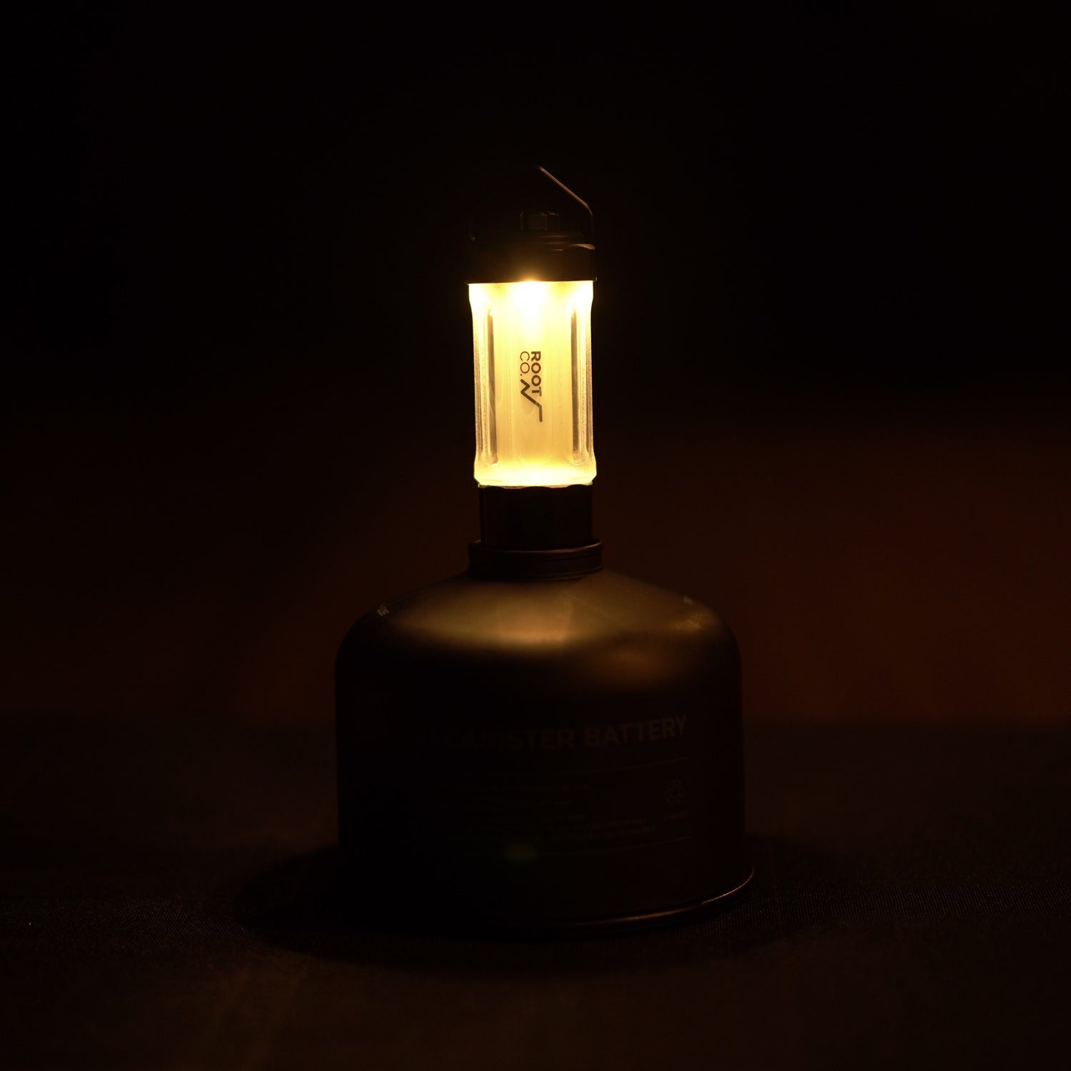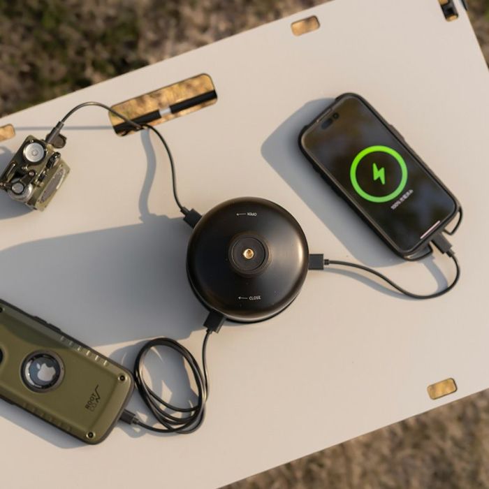 ミニLEDランタンは手のひらサイズなのに、最大120ルーメンの無段階調光。しかも蓄光タイプだから、夜真っ暗でもほんのり光って居場所がわかる。USBで給電できるから、OD缶型のバッテリーにそのまま挿して点灯OK。上にランタン、下にバッテリーっていう構成がハマりすぎてて、置くだけで“照明ギア”として成立してる。もちろん、単体で吊るしたり、テーブルにそのまま置いても雰囲気あっていい。