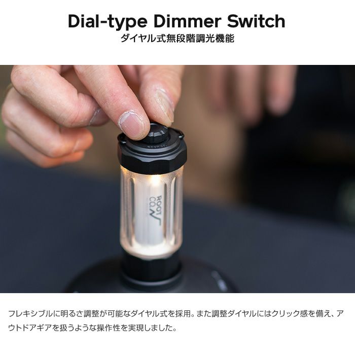 フレキシブルに明るさ調整が可能なダイヤル式を採用。また調整ダイヤルにはクリック感を備え、アウトドアギアを扱うような操作性を実現しました。