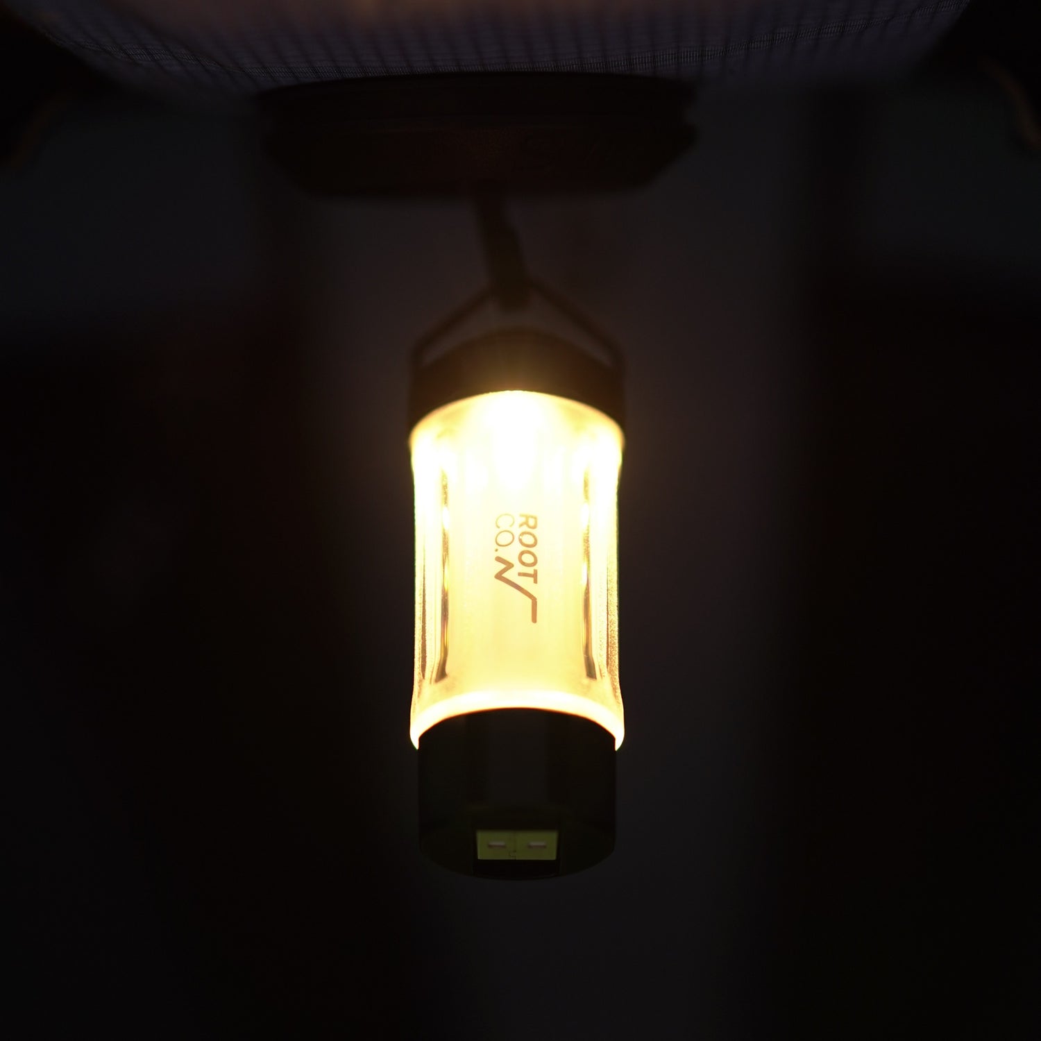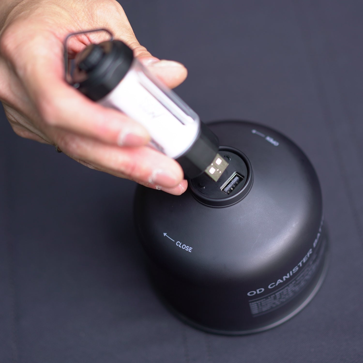 USBで接続・充電したままポータブルハブバッテリー自体がミニLEDランタンのランタンスタンドとしても機能します。 ※ポータブルハブバッテリー天面のUSBポートを使用し本製品を挿入した場合、製品の特性上多少のグラつき、傾きが生じます。また、完全固定ではないため吊り下げもできませんので予めご了承ください。