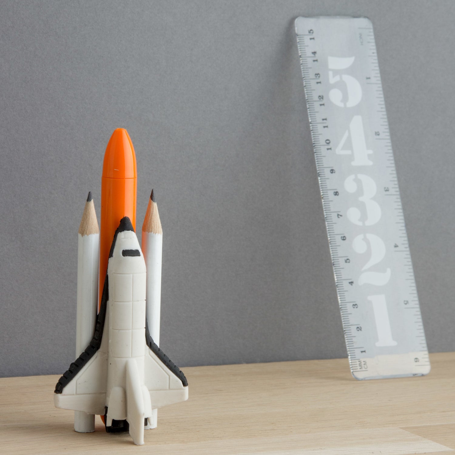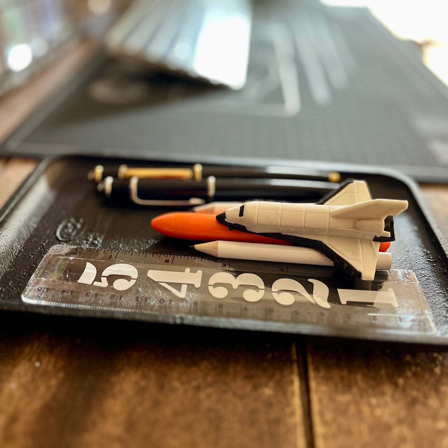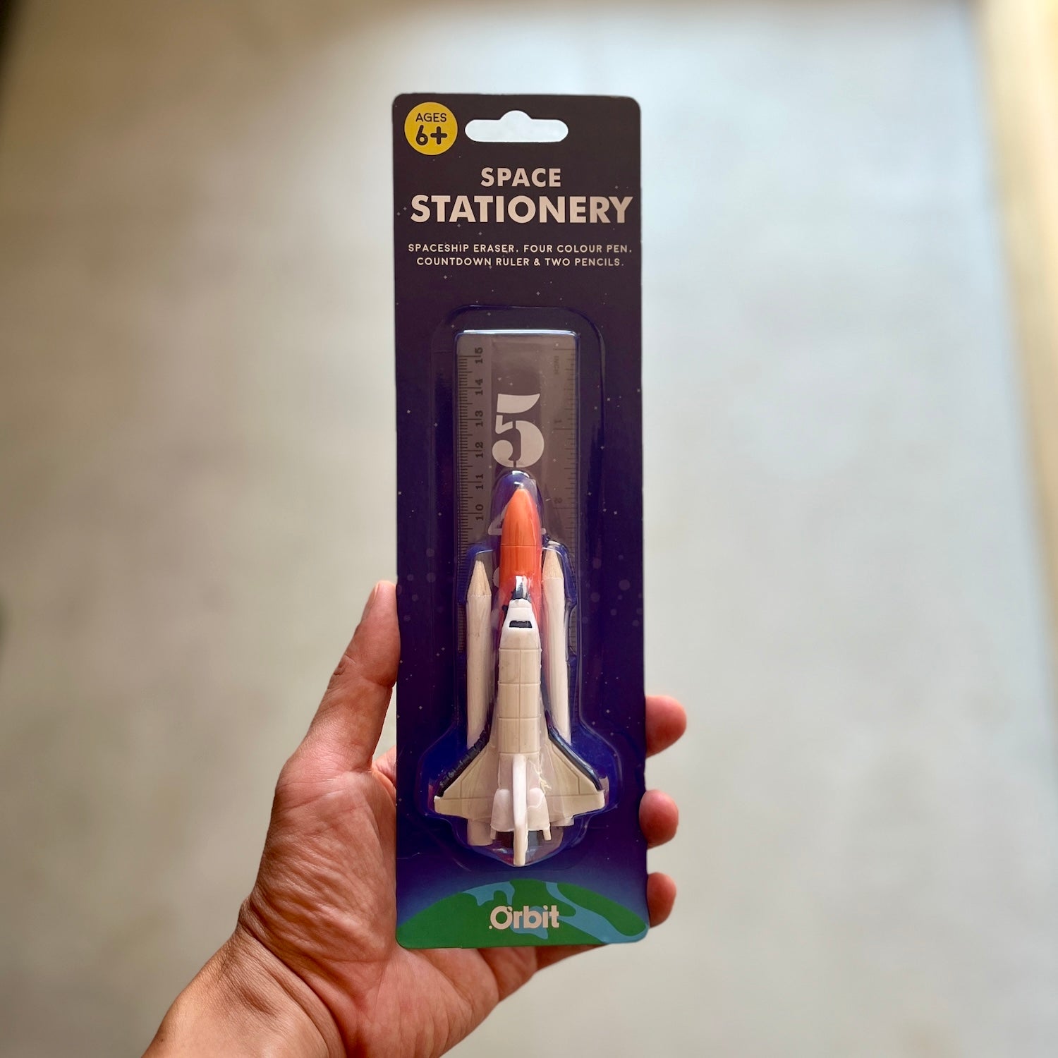 パッケージ買い、とはこれのこと。なぜか小学生の頃に流行った多機能筆箱を思い出した。宇宙をテーマにしたステーショナリーセットなんだけど、ちょっとした宇宙ミッションキット。スペースシャトル型の消しゴムに、ブースターみたいに連結できる鉛筆2本、燃料タンク感ある4色ボールペン、そしてカウントダウン定規。開けた瞬間のワクワク感は、子どもの頃そのまま。実用性より先に、心を打ち上げてくれる文房具です。