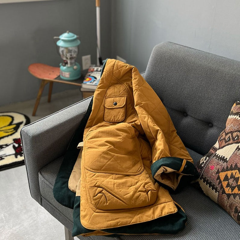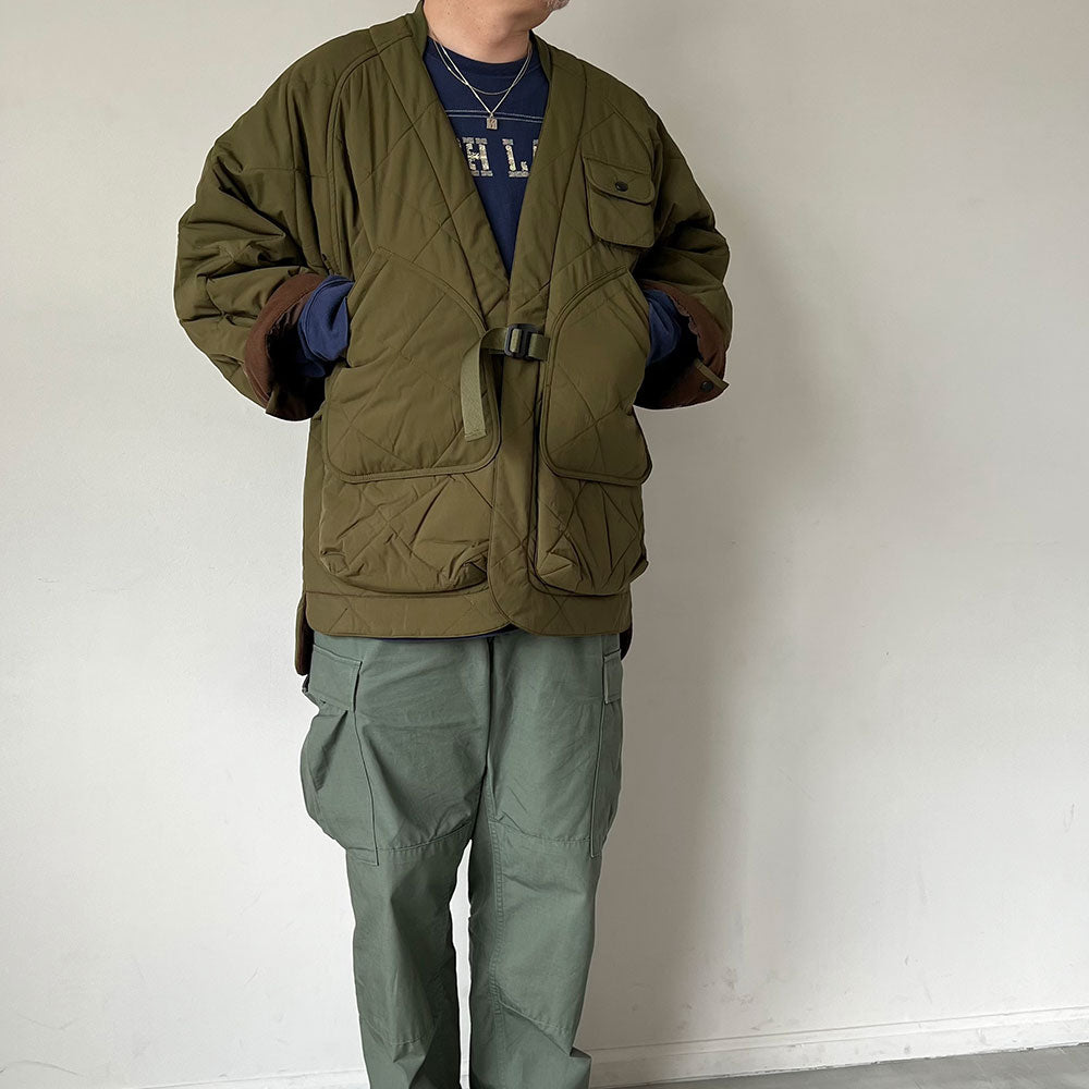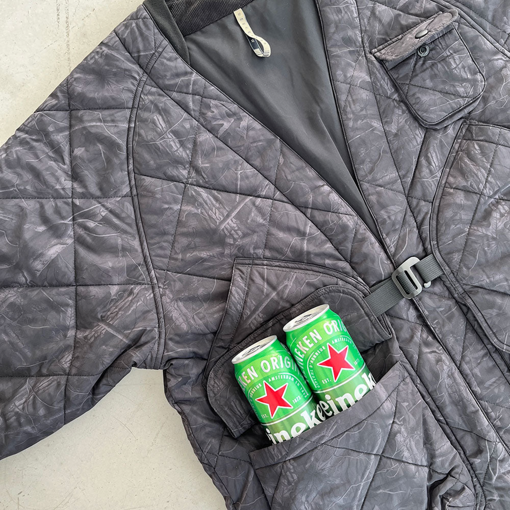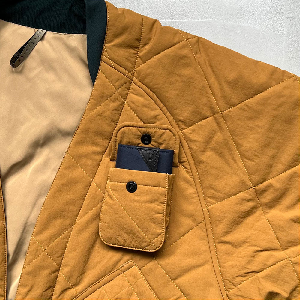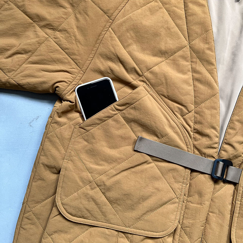 「コンビニまで晩酌用のビールとつまみを手ぶらで買いに行く」をコンセプトに、買ったモノを入れるポケットのベストなサイズ感と、寒い時に手を突っ込めるハンドウォーマーポケットなど、ハンティングジャケットの仕様をオマージュすることで機能的にも理想的な家呑み愛好家用"DAN-TEN"がデザインされました。