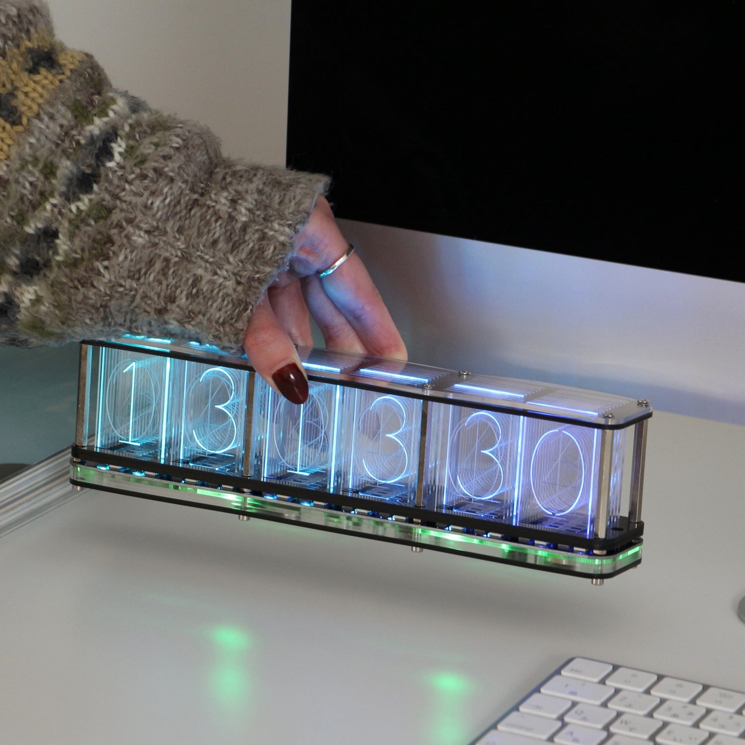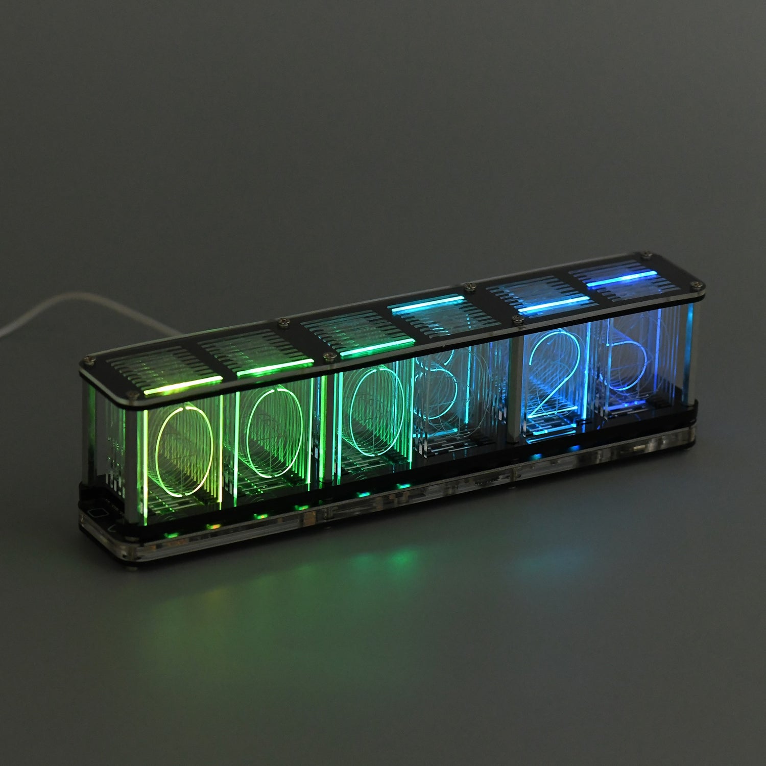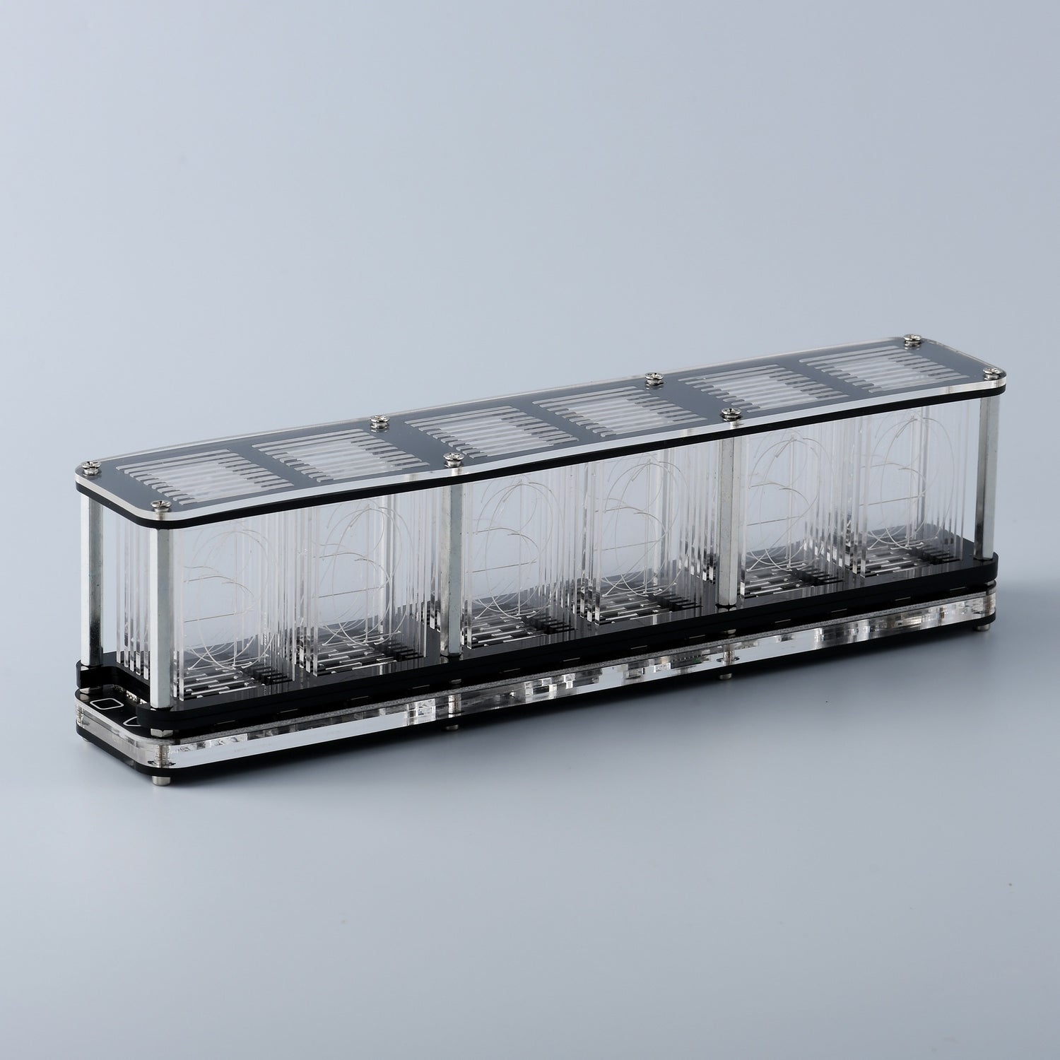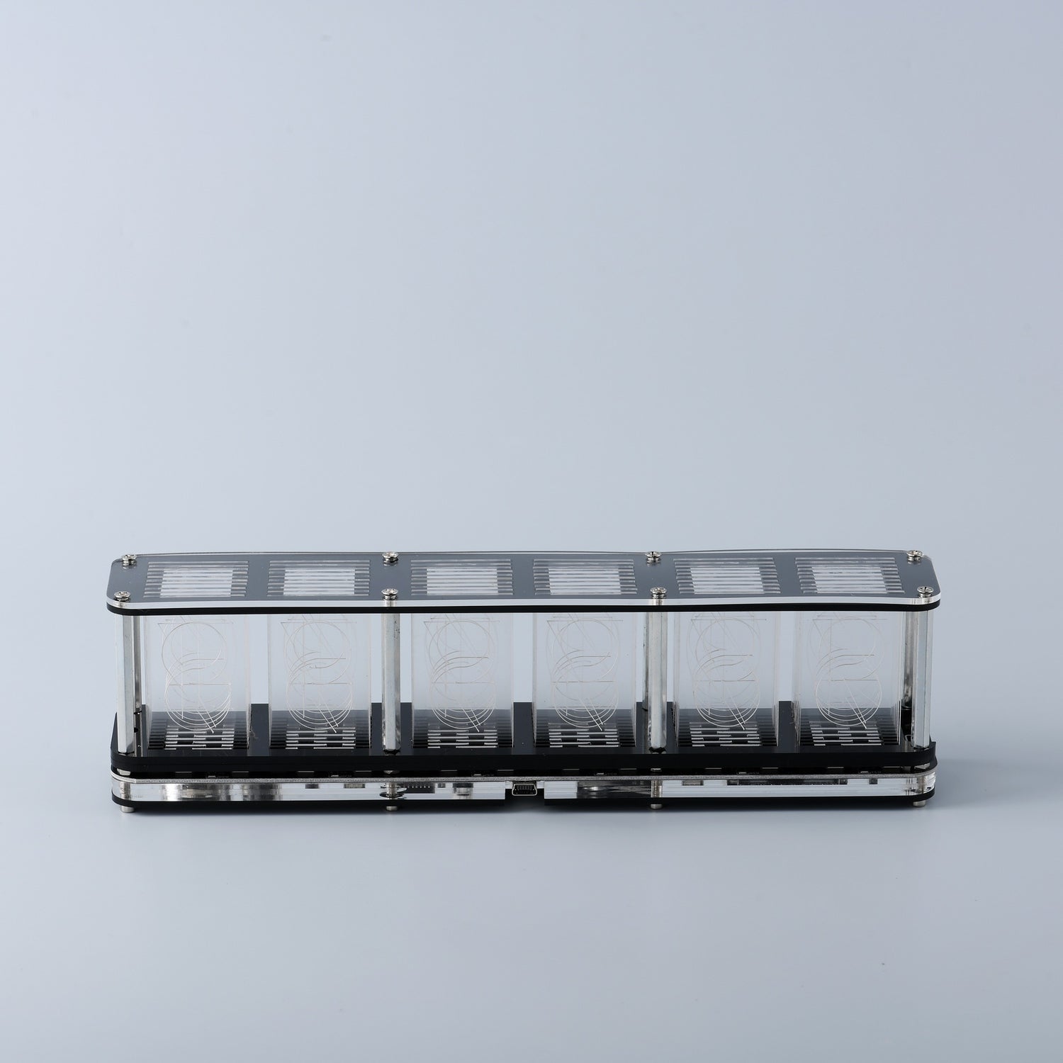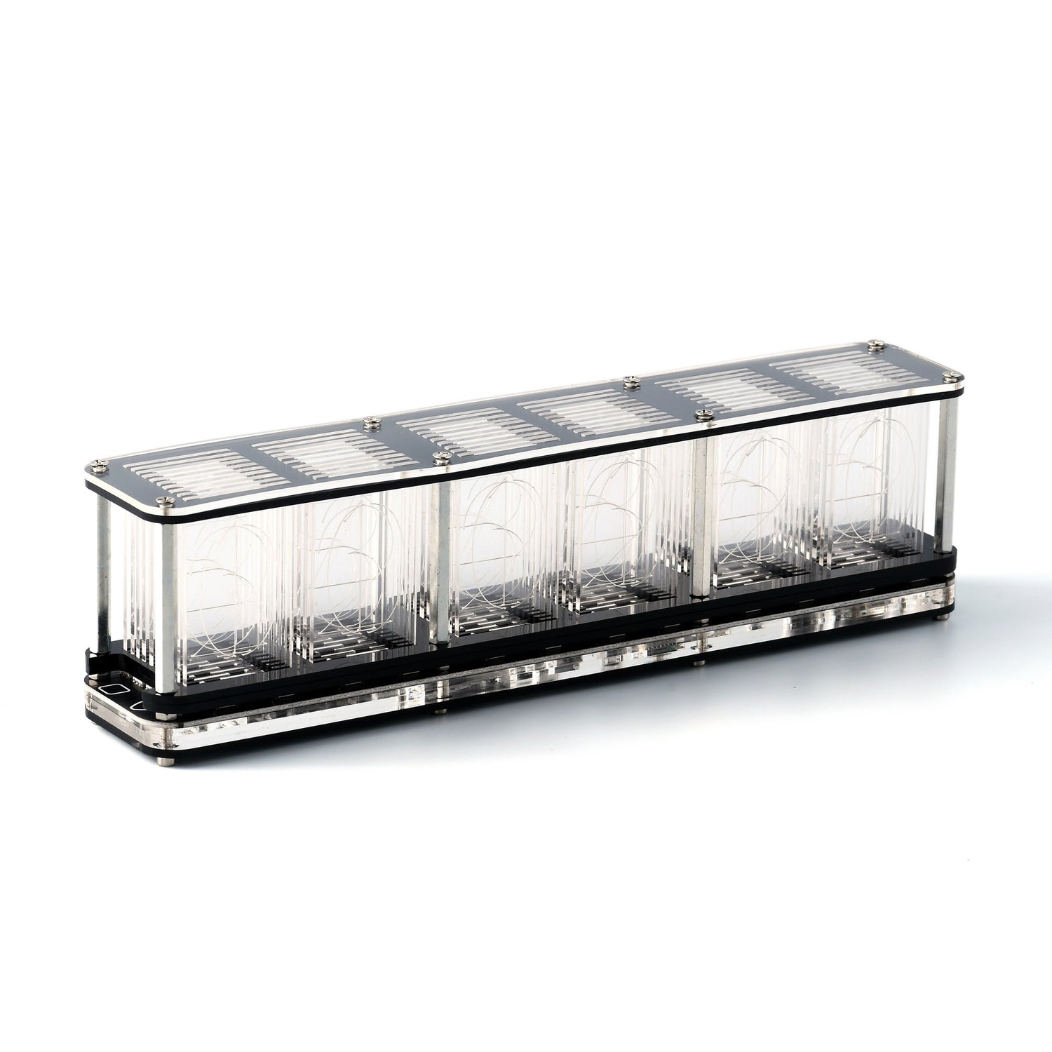 6つのディスプレイは、バックライトを組み込んだ多層アクリルで構成されており、立体的な視覚効果を生み出します。アラーム、タイマー、ストップウォッチなどの機能を備え、音楽スペクトラム表示機能も搭載。また高精度のDS3231クロックチップにより、正確な時間表示が可能となっています。