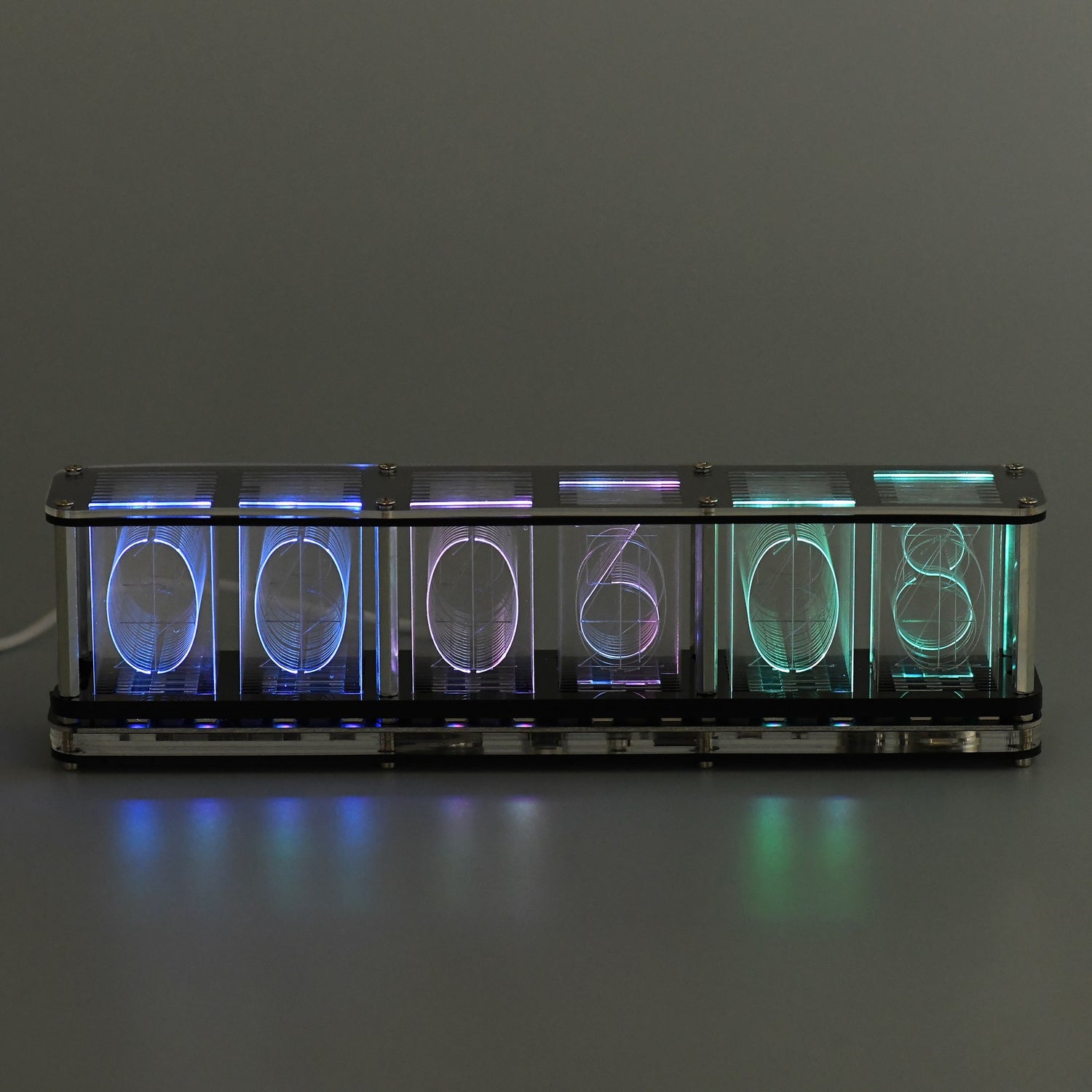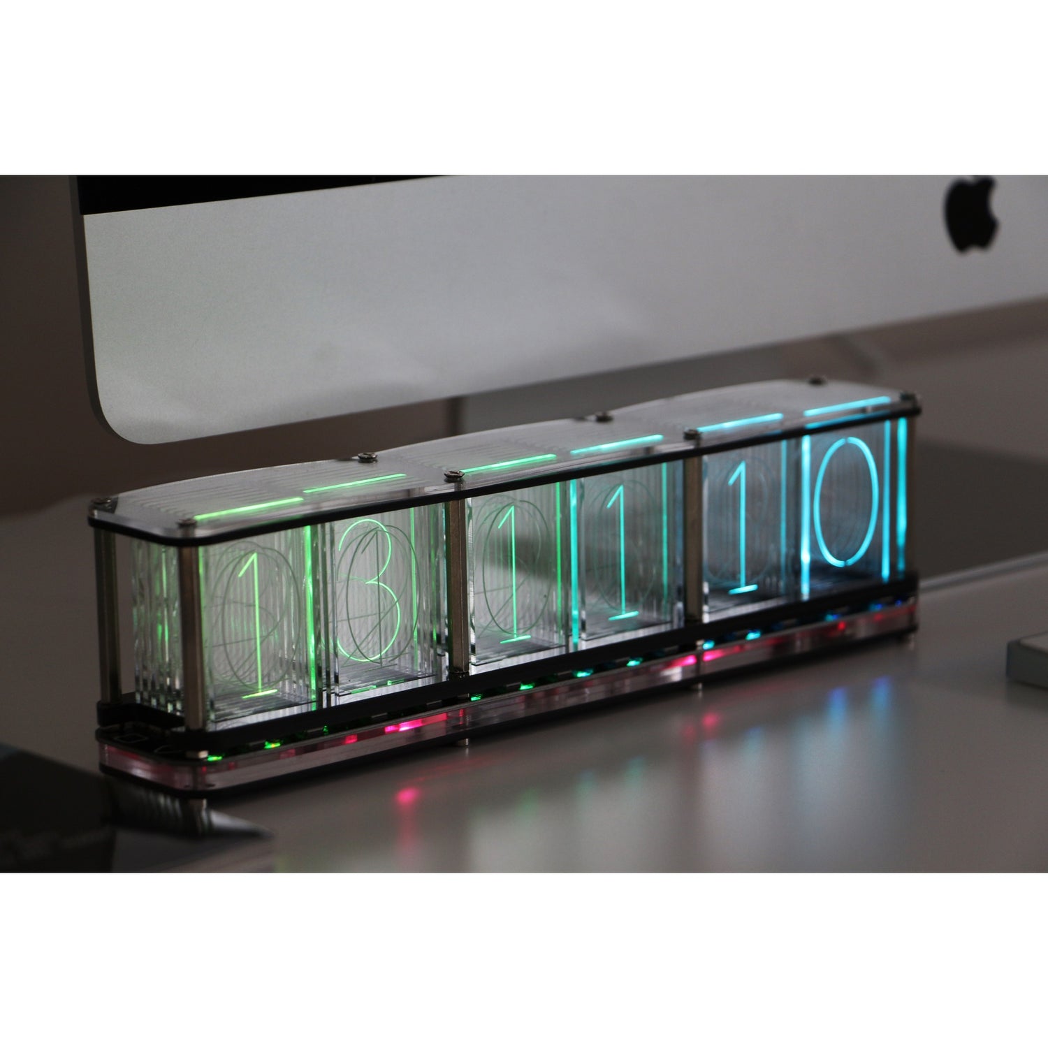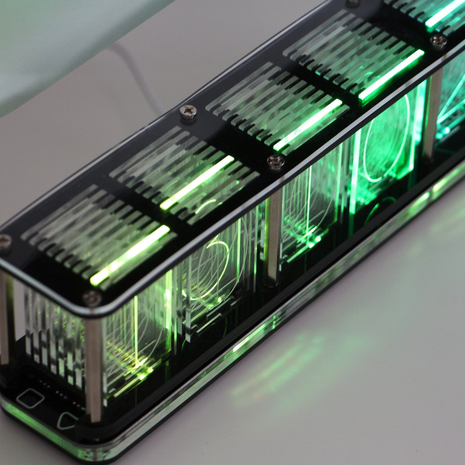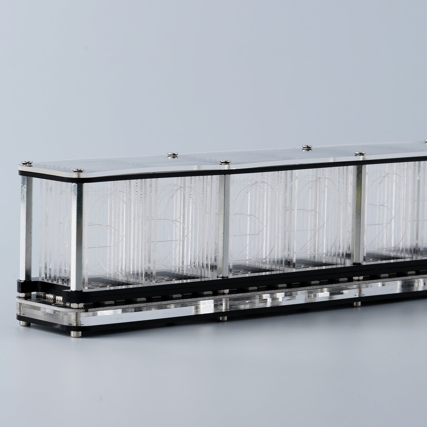6つのディスプレイは、バックライトを組み込んだ多層アクリルで構成されており、立体的な視覚効果を生み出します。アラーム、タイマー、ストップウォッチなどの機能を備え、音楽スペクトラム表示機能も搭載。また高精度のDS3231クロックチップにより、正確な時間表示が可能となっています。