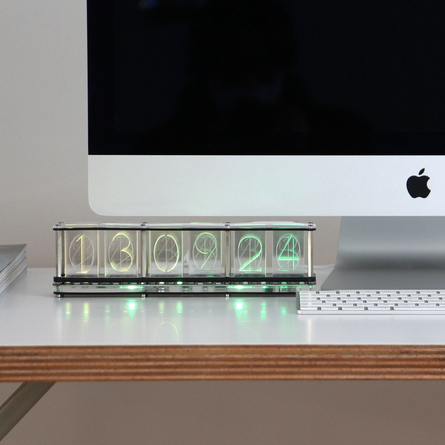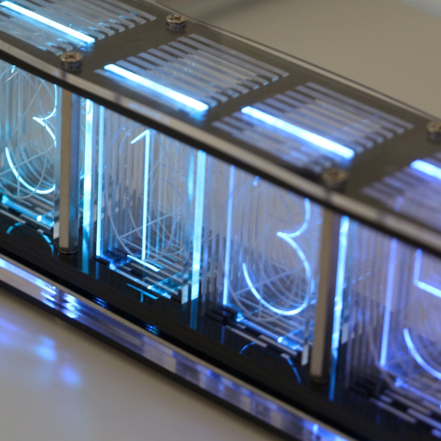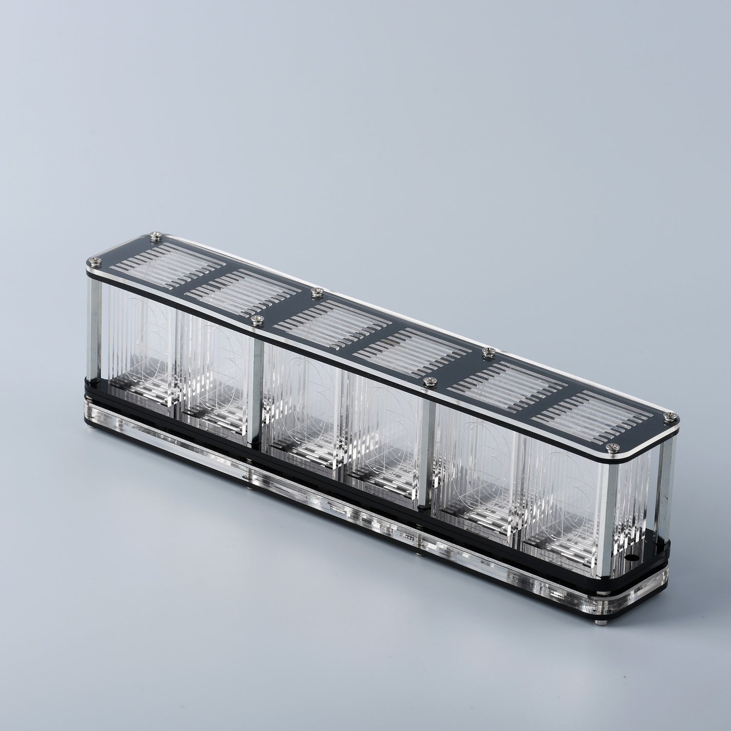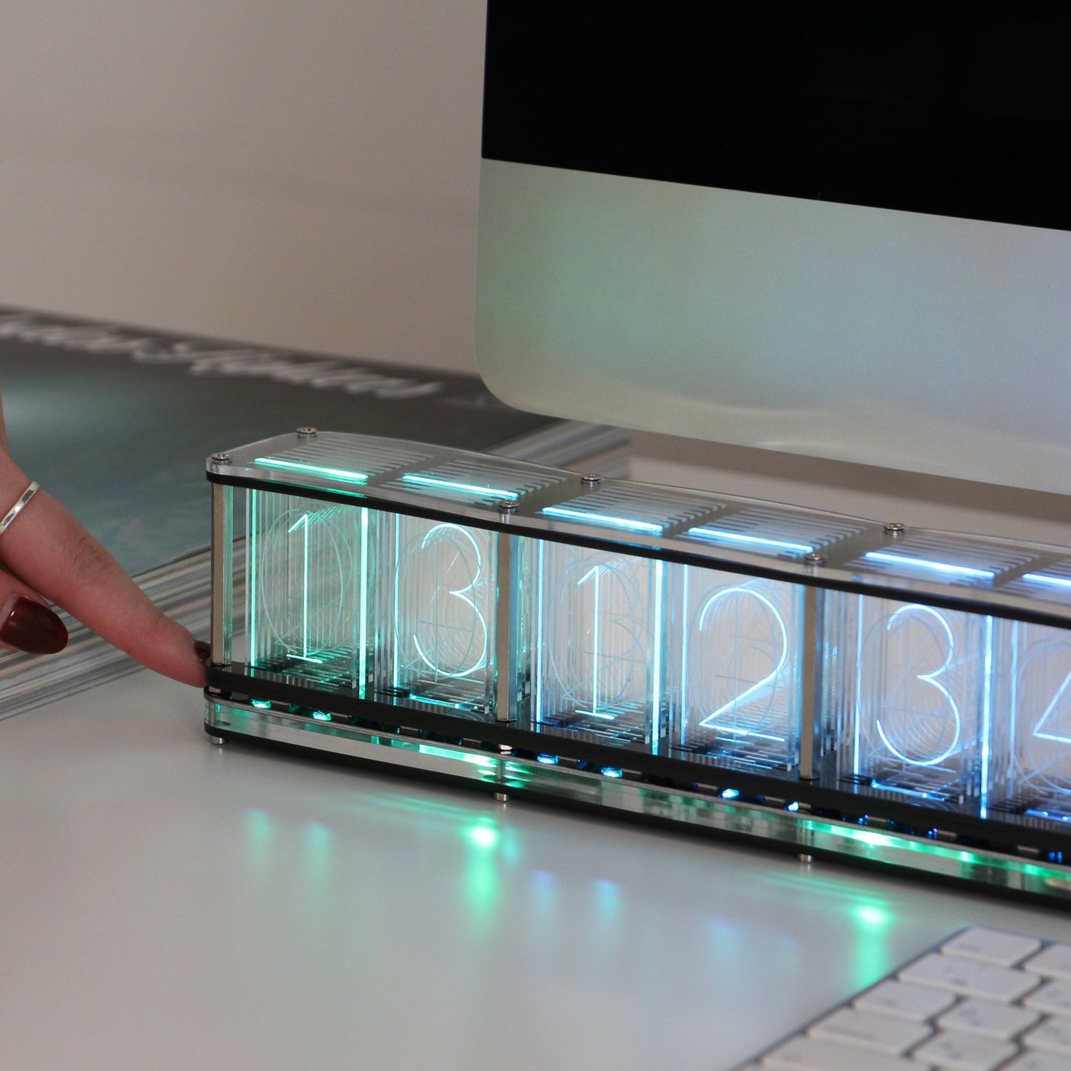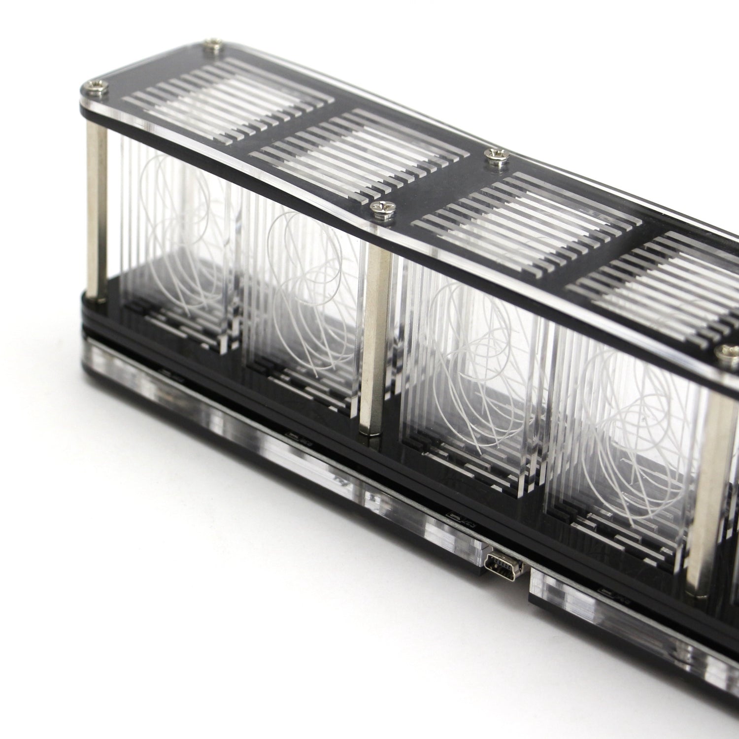 6つのディスプレイは、バックライトを組み込んだ多層アクリルで構成されており、立体的な視覚効果を生み出します。アラーム、タイマー、ストップウォッチなどの機能を備え、音楽スペクトラム表示機能も搭載。また高精度のDS3231クロックチップにより、正確な時間表示が可能となっています。