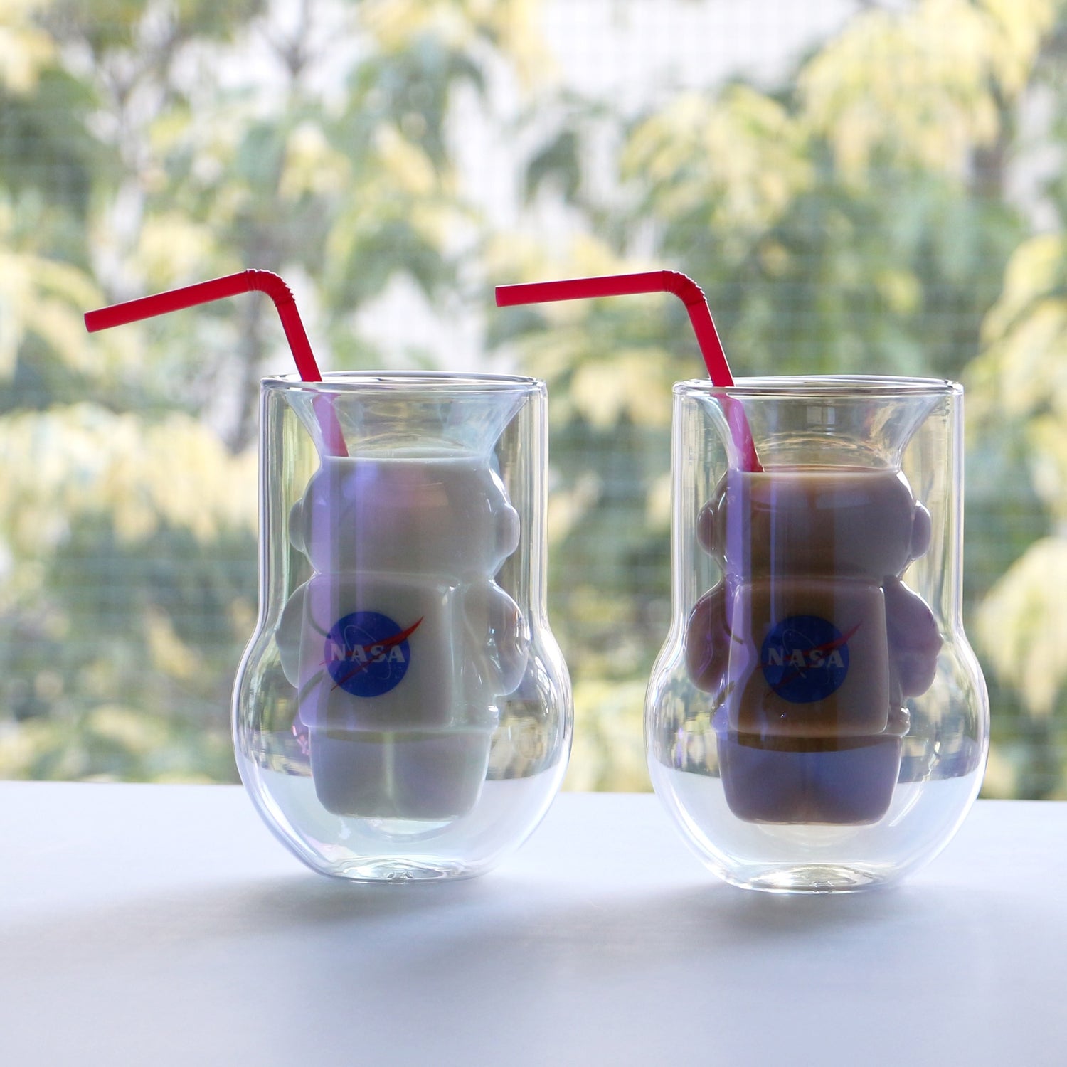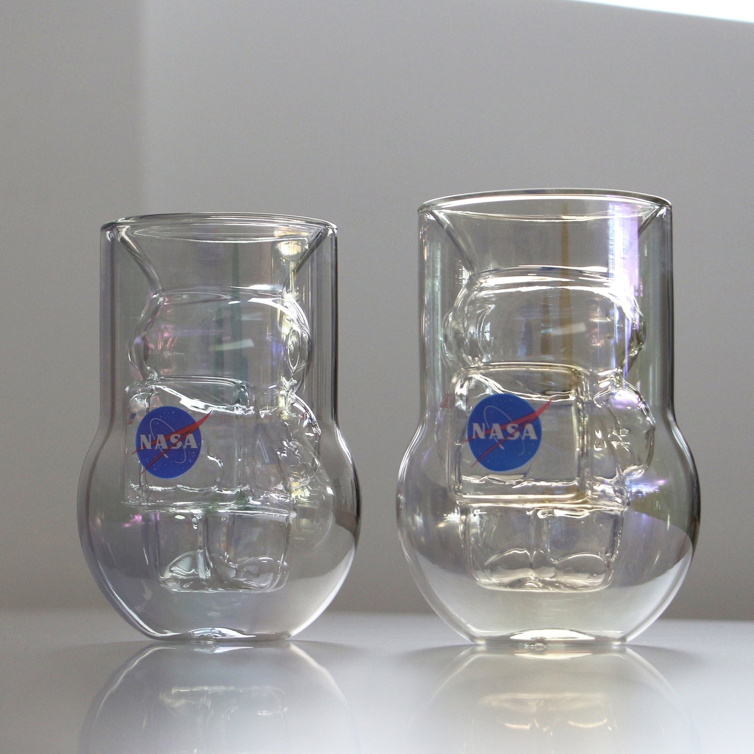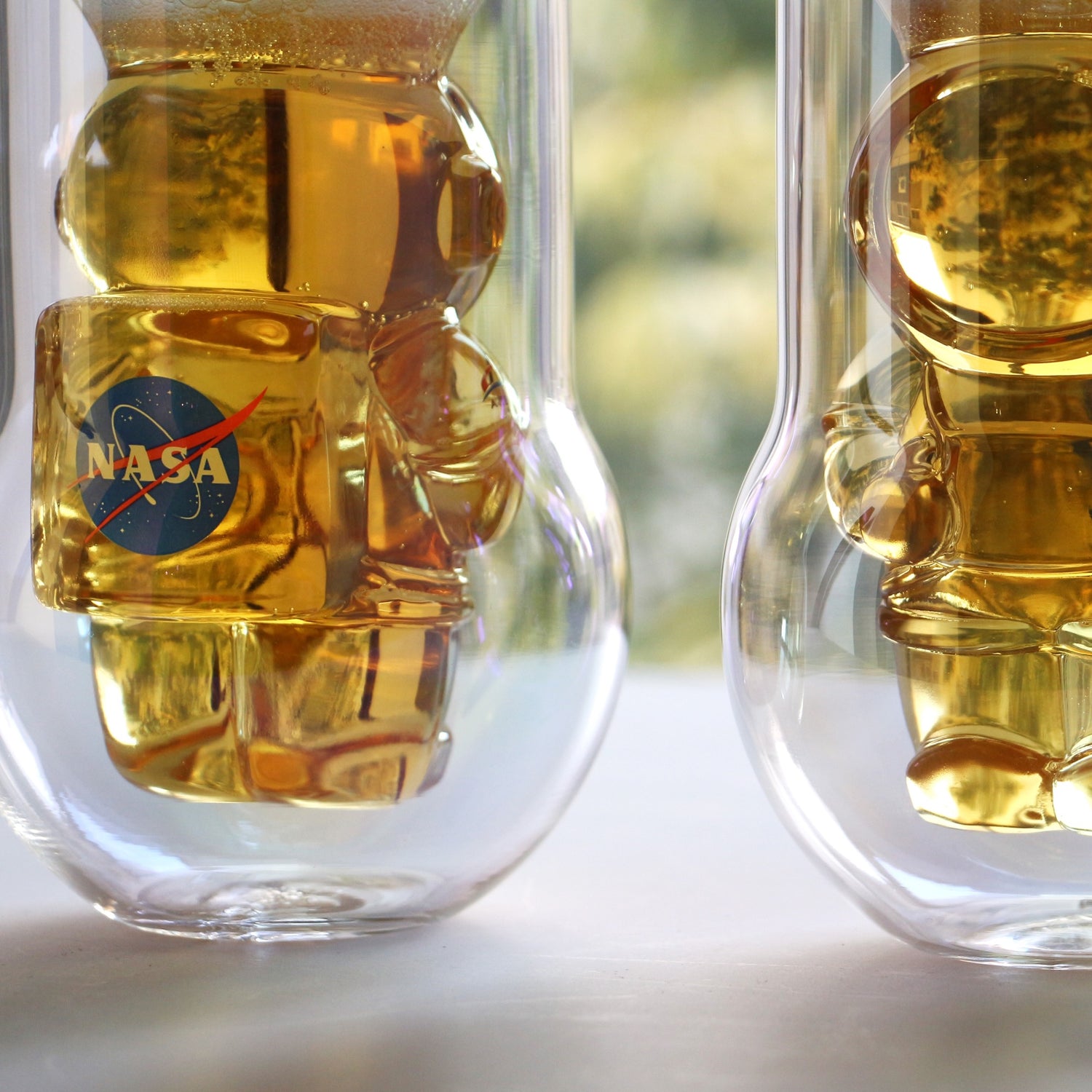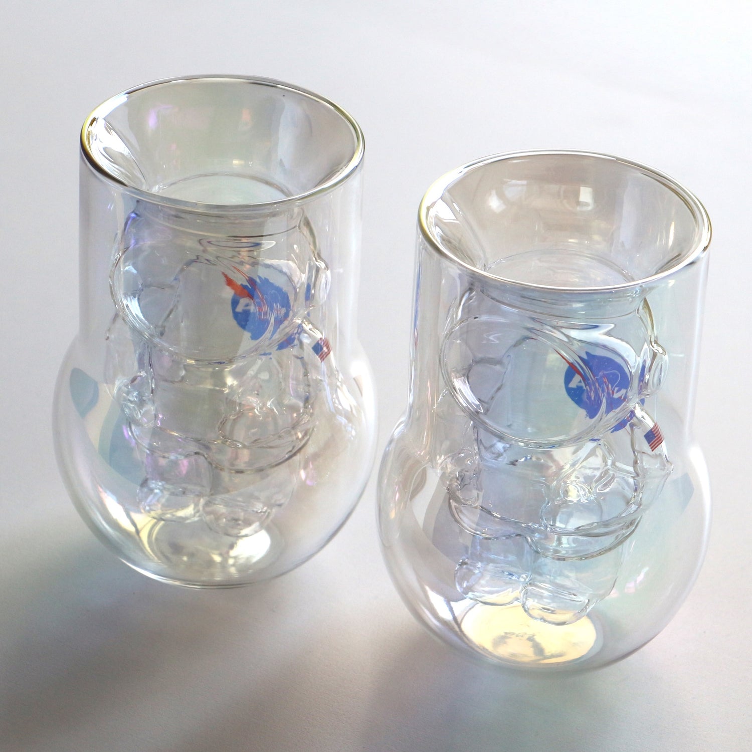 デフォルメされた宇宙飛行士のシルエットながらも、左肩にはアメリカ国旗、右肩にはアルテミス計画(※)のマークが施されるなど本格的。宇宙空間で行う船外活動の際に背負う生命維持装置にNASAのロゴプリントが施されているのはコラボレーションの証です。 日常使いにちょうどいい 8オンス (約240ml)の容量で、注いだドリンクの温度を保つダブウォール構造と機能的。ビールやミルクなど注ぐドリンクによって違う表情の宇宙飛行士が現れるユニークさは大人から子供まで惹きつけます。手に持ってもドリンクの温度が伝わりやすいので、お子様でも安心なグラスです。2個セットでそのままギフトとしても差し上げられるパッケージデザインです。
