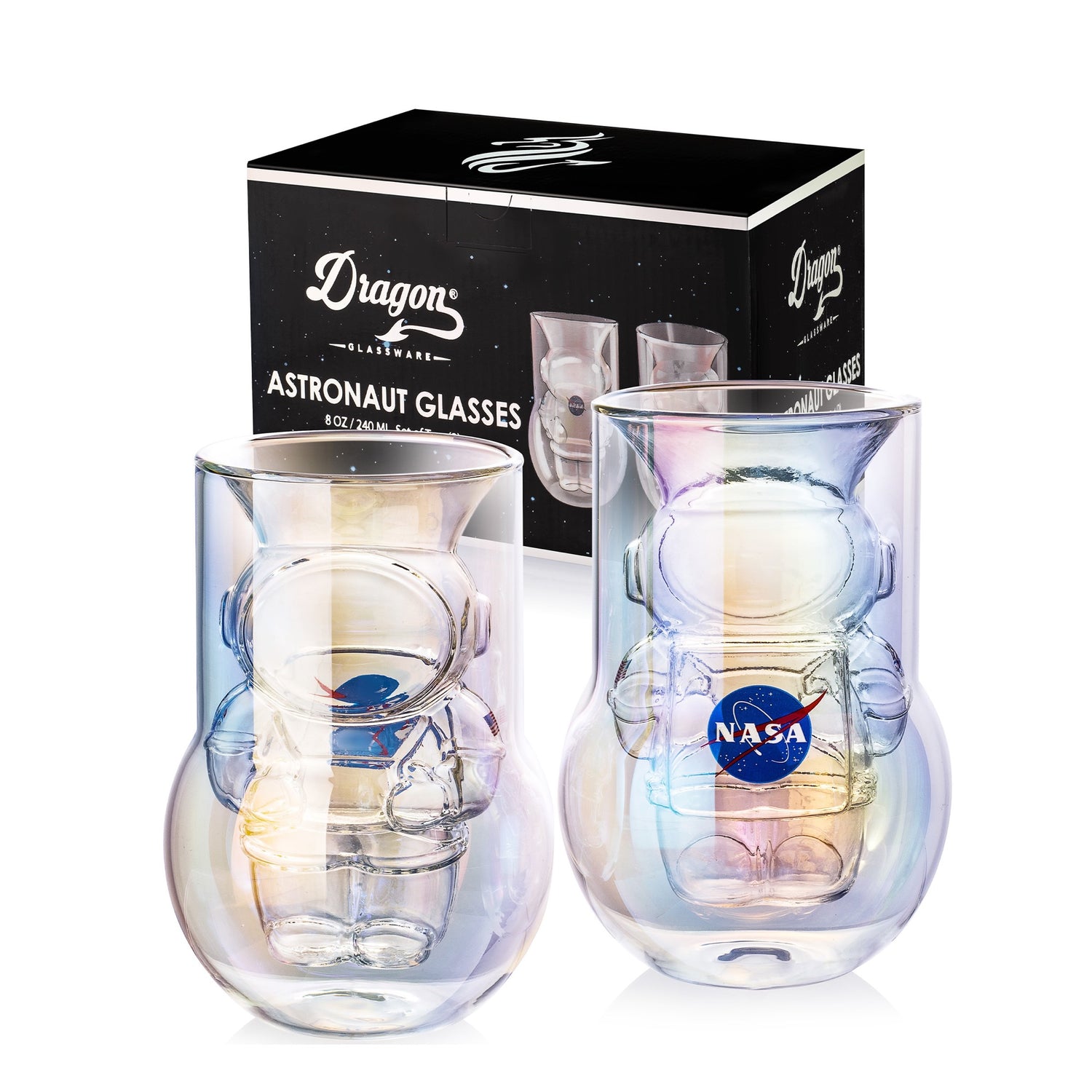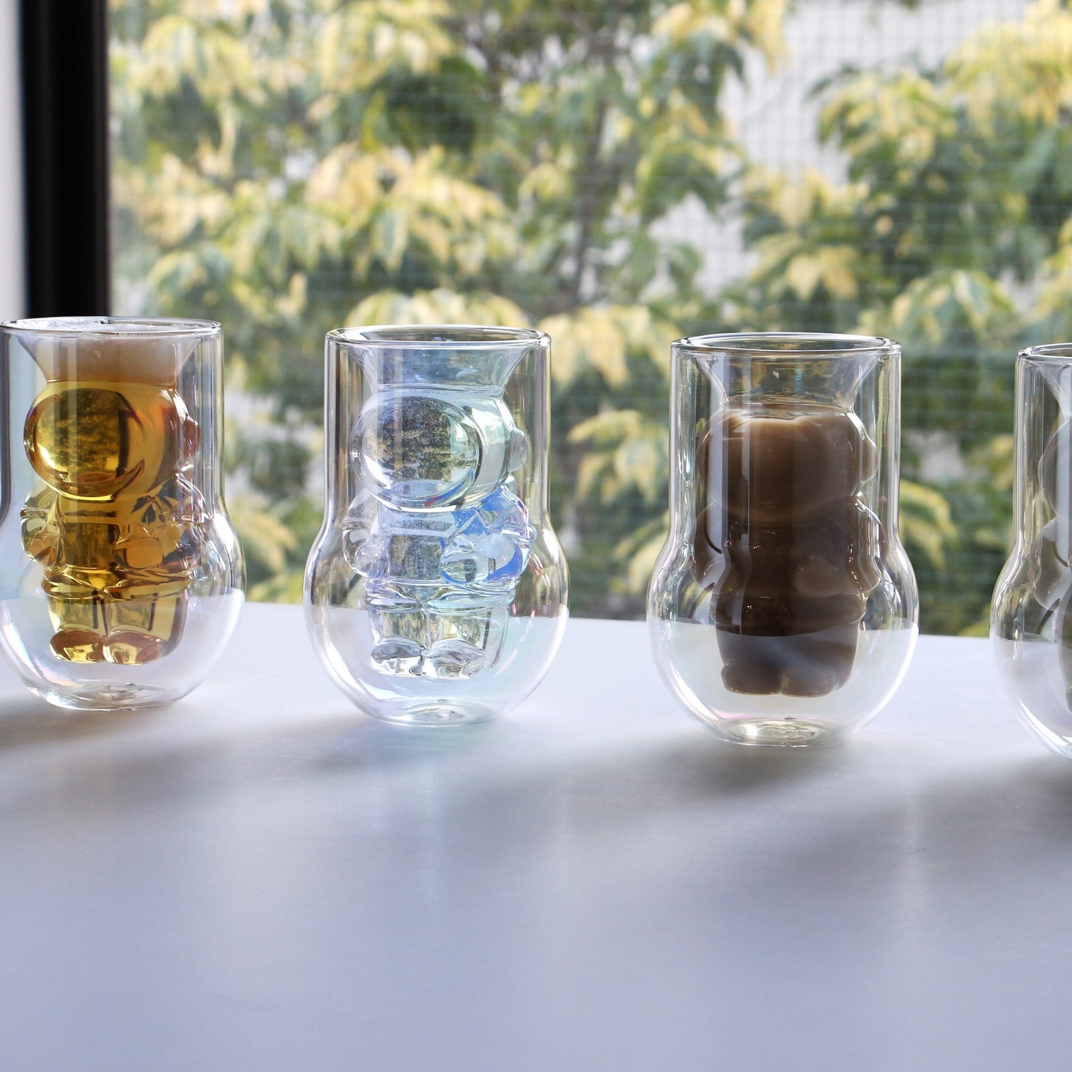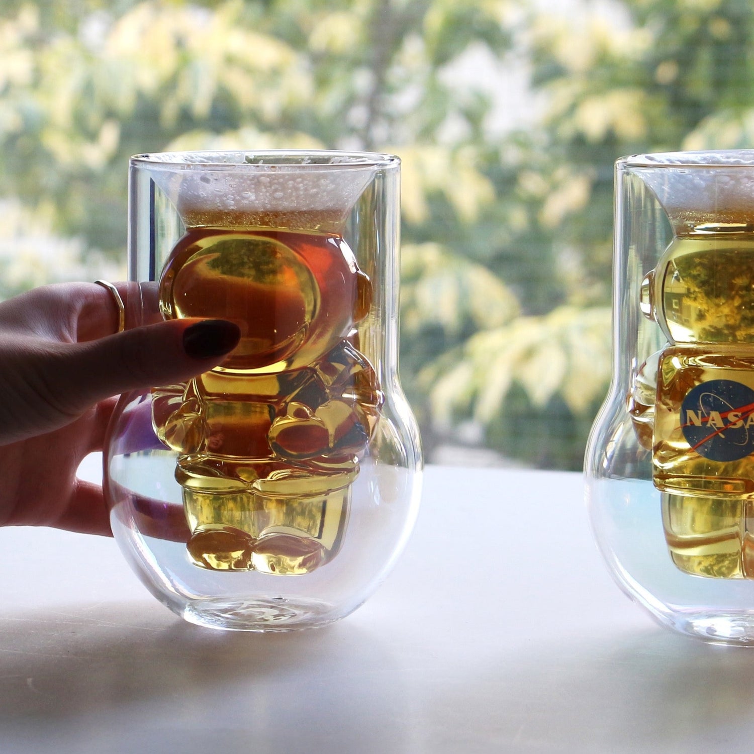 デフォルメされた宇宙飛行士のシルエットながらも、左肩にはアメリカ国旗、右肩にはアルテミス計画(※)のマークが施されるなど本格的。宇宙空間で行う船外活動の際に背負う生命維持装置にNASAのロゴプリントが施されているのはコラボレーションの証です。 日常使いにちょうどいい 8オンス (約240ml)の容量で、注いだドリンクの温度を保つダブウォール構造と機能的。ビールやミルクなど注ぐドリンクによって違う表情の宇宙飛行士が現れるユニークさは大人から子供まで惹きつけます。手に持ってもドリンクの温度が伝わりやすいので、お子様でも安心なグラスです。2個セットでそのままギフトとしても差し上げられるパッケージデザインです。