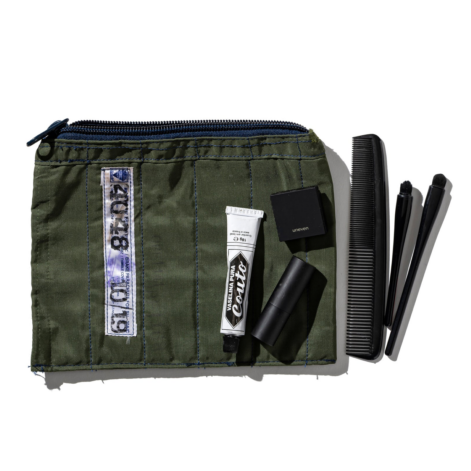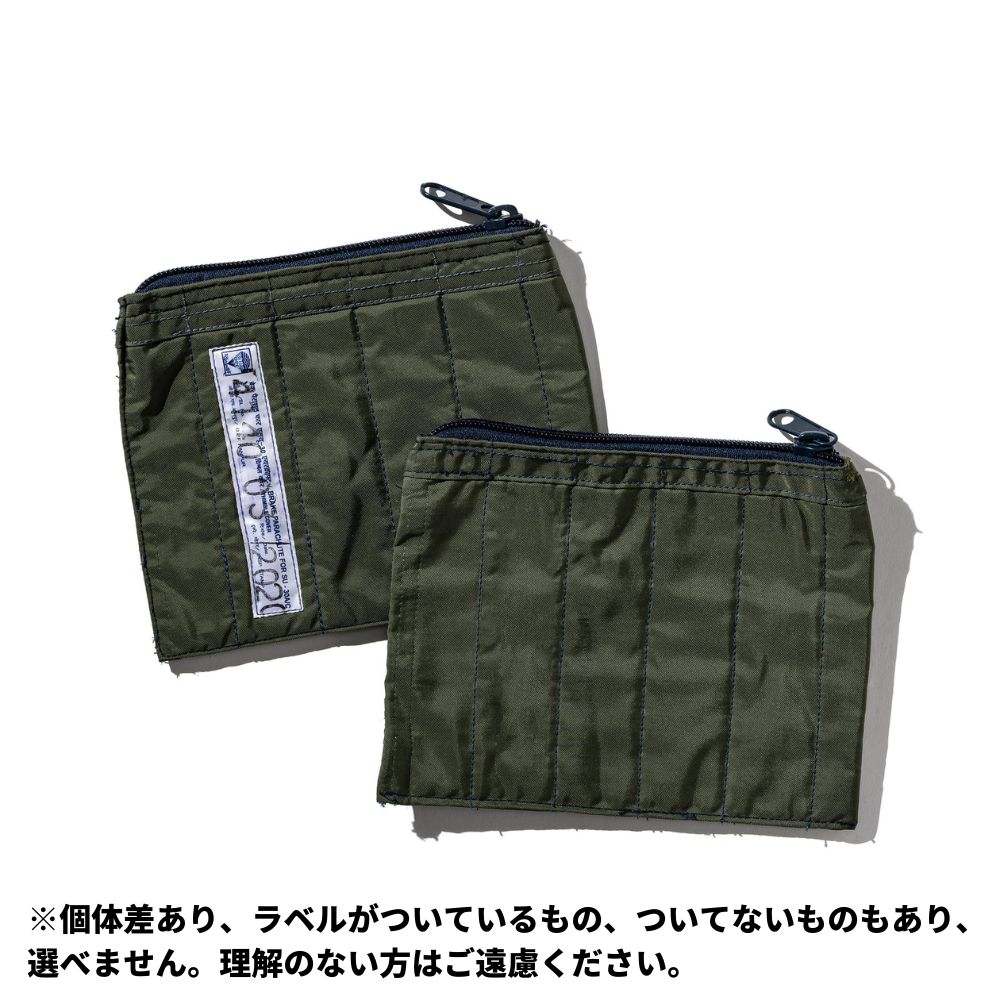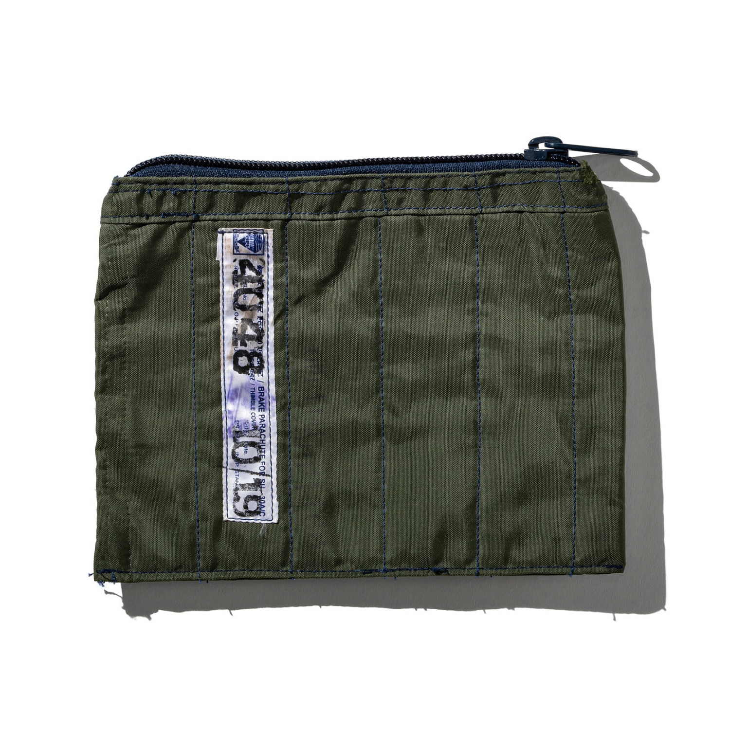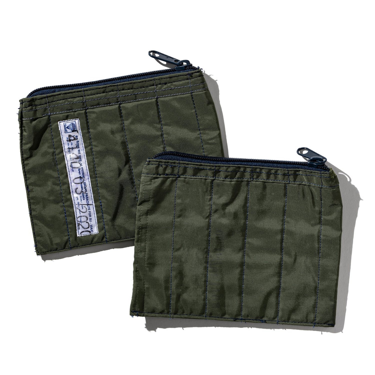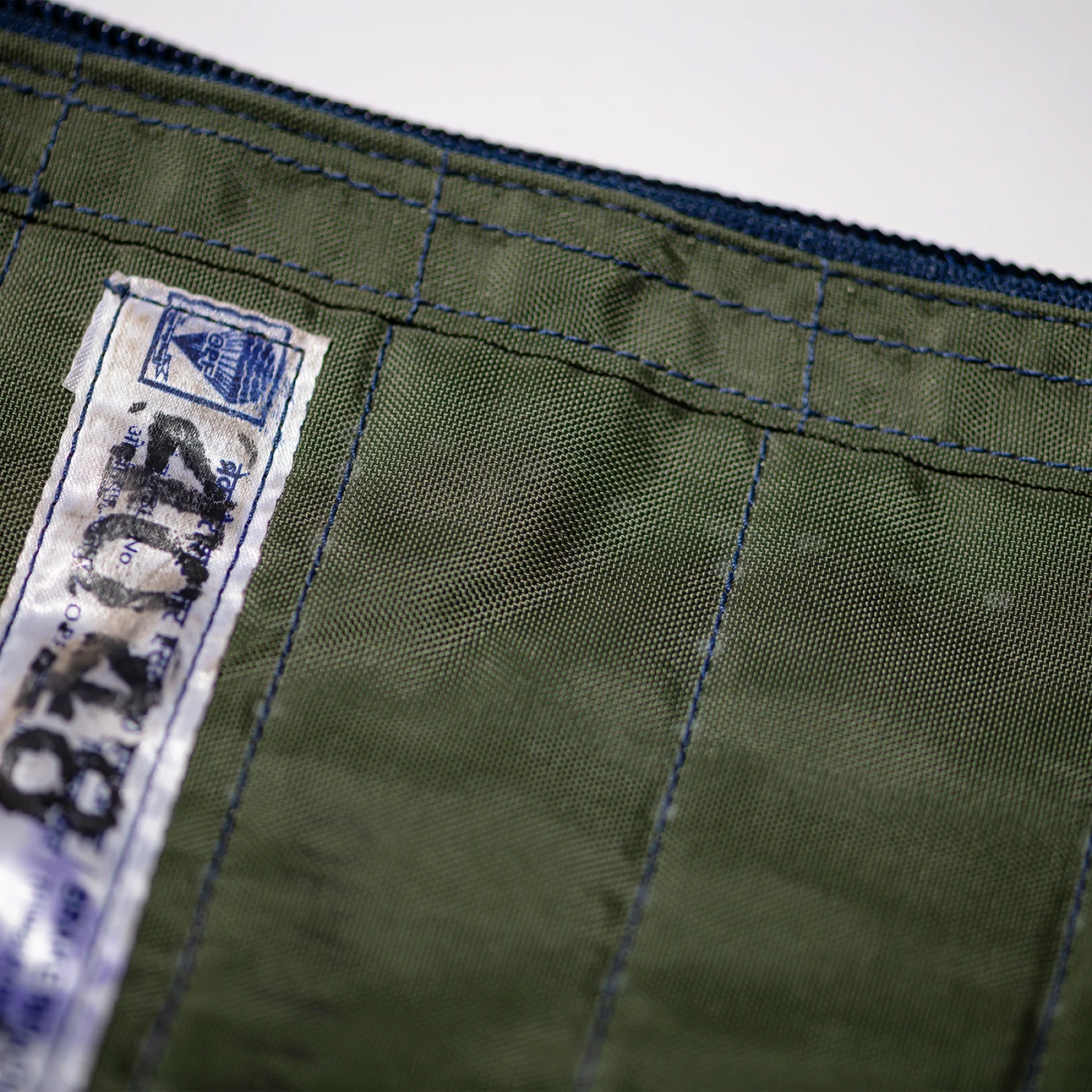 ミリタリーらしい無骨さと、使い込まれた素材の風合いが絶妙のポーチ。ヴィンテージのパラシュート生地をキルティングして仕立てられたものです。生地の取り都合で、サイズが少しずつ違っていたり、色味や風合いに個体差があって、ラベルが付いていたりいなかったり。選べないからこそ、自分に届いたものが“たったひとつの相棒”になる感覚。同じものを持っているようで、誰ともかぶらない。そんな一点ものの魅力を味わえるポーチです。(※ご購入前に必ずアイテム説明欄をご確認ください。この風合いも含めてブランドの魅力なので、ご理解いただけない方はご遠慮ください。)