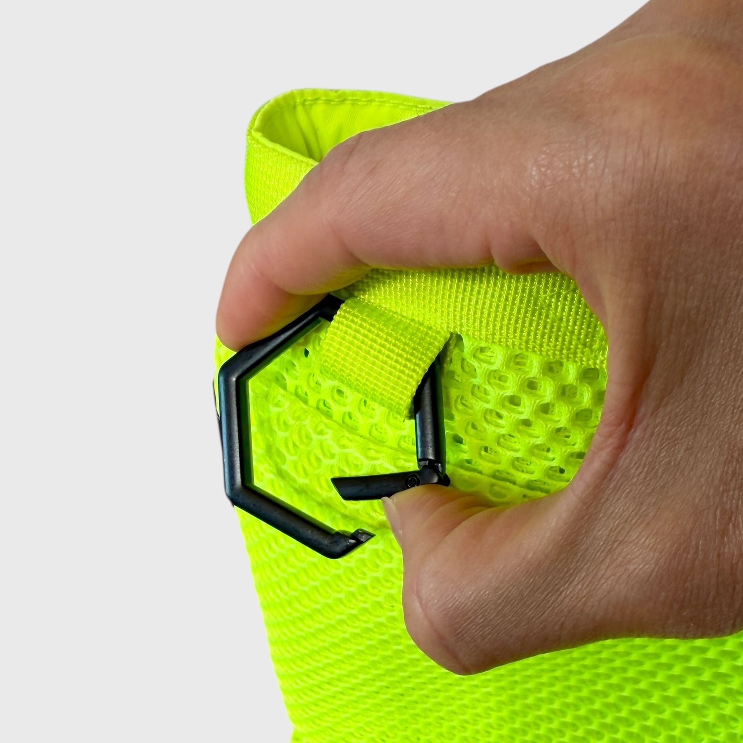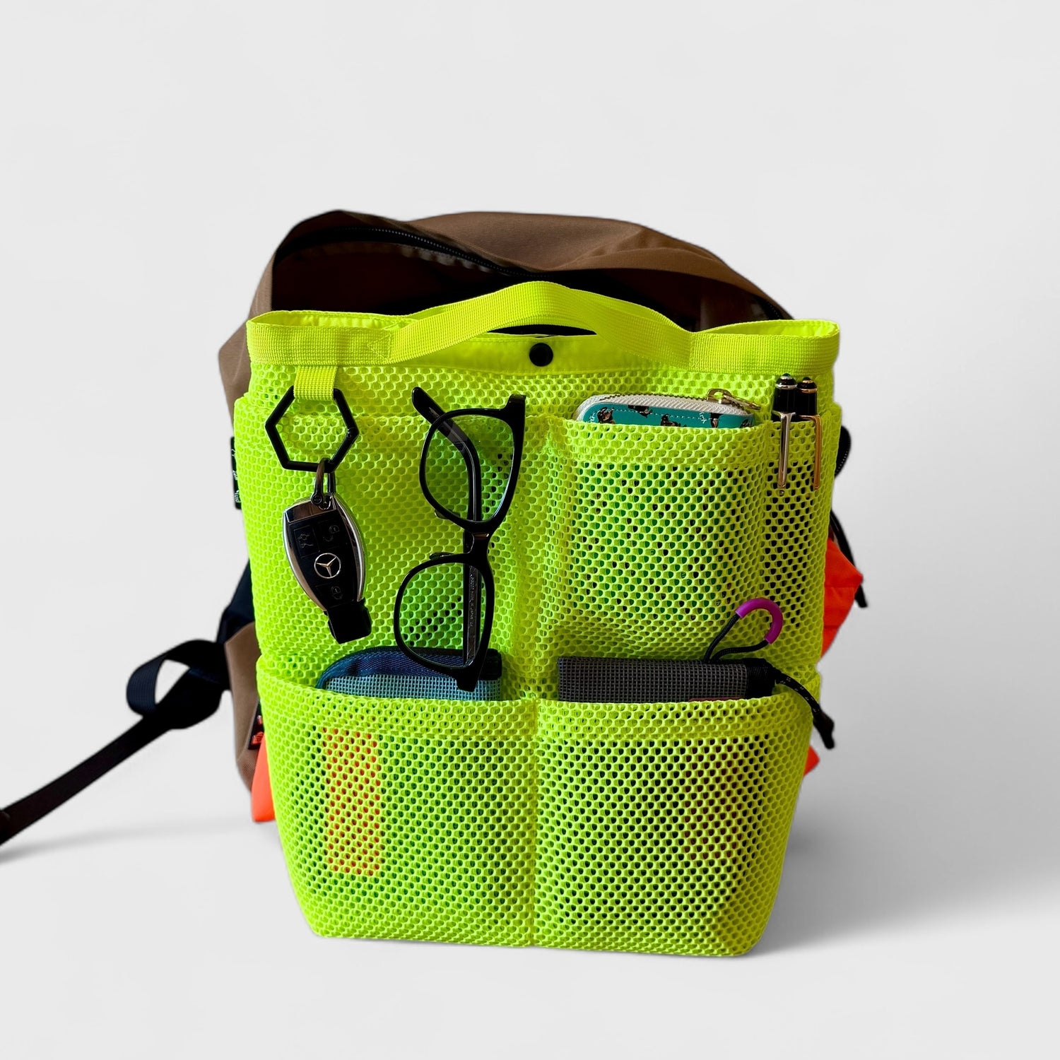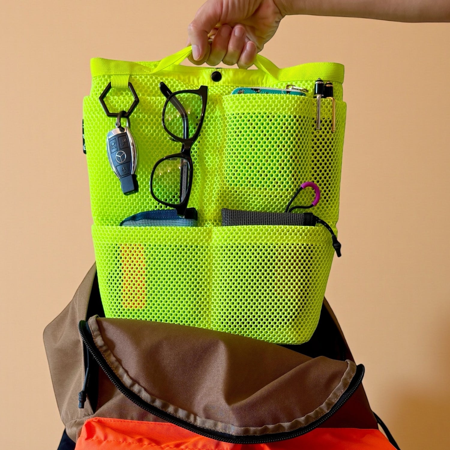 HATCHオリジナルで人気のバックパックと一緒に使って欲しい、理想の縦型バッグインバッグが完成しました。まずは見た目。こんなオシャレで発色のいいバッグインバッグ、見たことありますか?メッシュ×蛍光イエローの組み合わせが、とにかく可愛い。でも、ただ可愛いだけでこの素材と色を選んだわけじゃありません。バッグの内側と同化しないから、夜でも中身が探しやすい。つまり、見た目と機能性をちゃんと両立しています。使い勝手も抜群。外ポケットは表に4つ、ペンポケットが1つ、裏には大きいのが2つ。内ポケットは8つで収納力ばっちり。もちろん、自立します。引き手付きだから、バッグ間の入れ替えもサクッと完了。マグネットボタン+ファスナー付き。そしてこだわったのが、六角形(そう、蜂の巣は六角形!)のブラックカラビナ。全体をビシッと締めてくれて、鍵の取り外しもスムーズです。これでHATCHでバッグをいくつ買っても、中身の入れ替えは一瞬。使うたびに、「これ、買ってよかったな」って思ってもらえる、自信の一作です。横型バッグインバッグはこちら。
