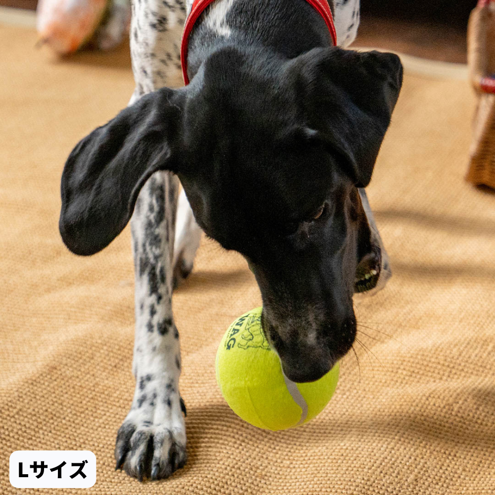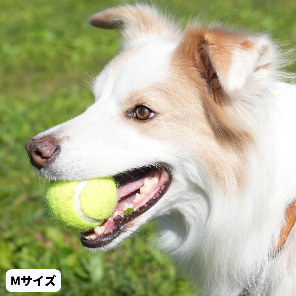 ボールを投げて!と言わんばかりの愛らしいロゴが入った犬用テニスボール。小型犬向けのSサイズから超大型犬でも遊べるXXLサイズまで、幅広いサイズ展開です。3mm厚の天然ゴム層とフェルト生地で愛犬の歯にも優しく、丈夫で耐久性もあります。家の中、ドッグランや公園など、アクティブな愛犬と過ごす時間に。本製品は犬のおもちゃです。窒素ガス充填をしていませんので安全に遊んでいただけます。