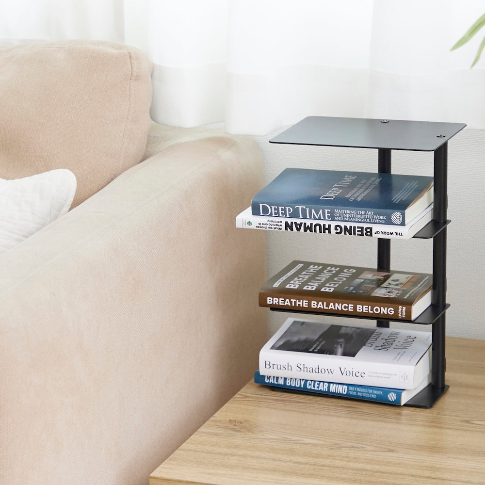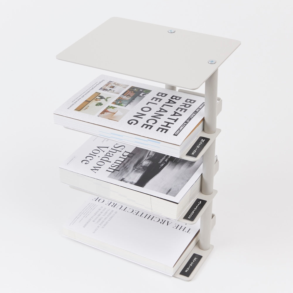 「積読」の問題点のひとつ目は、本の上に本を無限に積んでいくため、形が崩れやすく、見た目がキレイになりにくいことです。また、一番上に積んだ本は容易に取り出せますが、本の上に本が積み重なっているため、途中の本が取り出しづらくなってしまいます。また、本の視認性もわるくなり、どんな本を積んだのか、その存在自体も忘れてしまいがちです。積読ホルダーでは、3つの棚板を設けることで、本をキレイに積むことができると共に、本が取り出しやすい構造になっています。