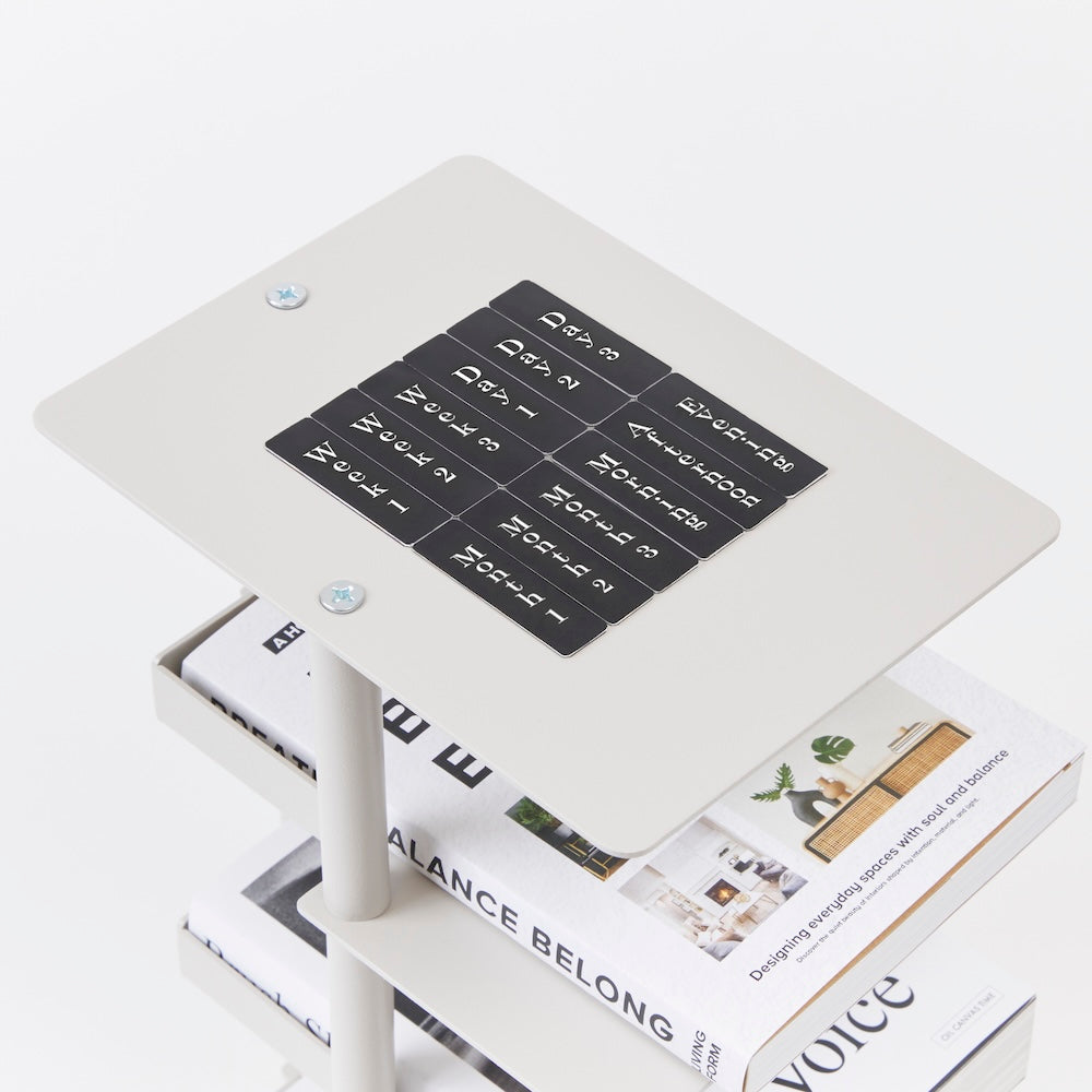 「積読ホルダー」には特製のマグネットシートが付属しています。シート上のひとつひとつのマグネットにはそれぞれ本を読むタイミングが記されています。スチール製の棚にマグネットは容易につけることができるため、自分のペースに合わせて、本を読むタイミングを決めて、本を読み進めることもできます。