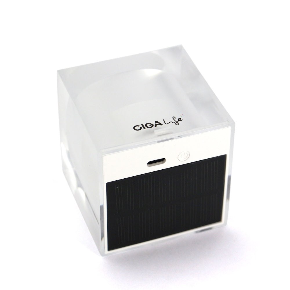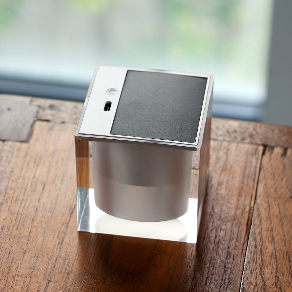 高い透明性を誇るPMMA(アクリル樹脂)で覆われた、環境にやさしいソーラー充電式LEDキャンドル。やさしく揺れる炎のような灯りが、空間に温かく幻想的な雰囲気をもたらします。火を使わないため安全性にも優れ、リラックスタイムや就寝前にも安心。電源が入っている状態で本体をノックすると反応するタッチセンサー、さらにロゴ部分に息を吹きかけて操作するブレススイッチを搭載。ロウソクを消すように息を吹きかけて消灯する仕草は、デジタルでありながらアナログな温かみを感じさせます。ベッドサイドやリビングはもちろん、アウトドアや防災用としても活躍。底面にはソーラーパネルとUSB Type-Cポート、ON / OFFスイッチを備え、シンプルで洗練されたデザインも魅力です。