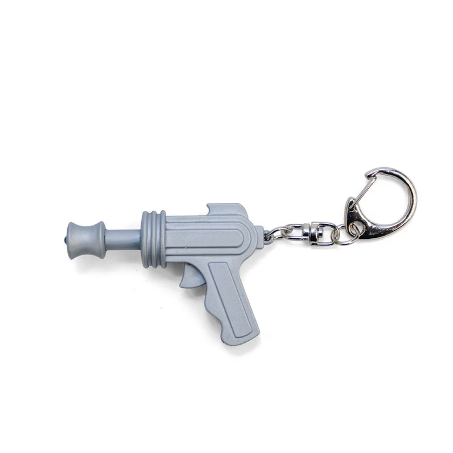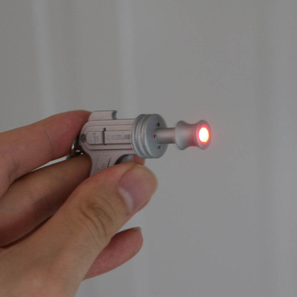 引き金部分のボタンを押すと銃口を光らせて"ピュンピュン"と音が鳴る、スペースガンのノイジーキーリング。さっと構えて引き金を引けば、あっという間にスペースレンジャー気分に浸れます。