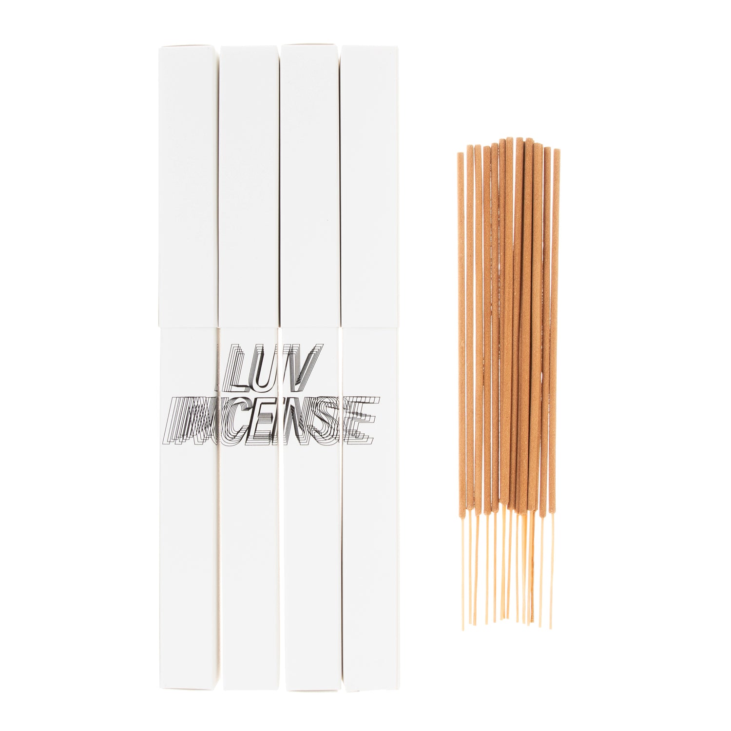 LUV INCENSEは、日常の空間デザインをより良いものに演出するお手伝いをさせて頂きたいという気持ちを込めてincenseを制作しています。原材料は竹、ウッドパウダー、フレグランスオイル。香りの成分はバニラ、ジンジャー、ペッパー、シダー、パチョリのなどのブレンドにより制作。パッケージを4つ並べると1つのデザインになります。