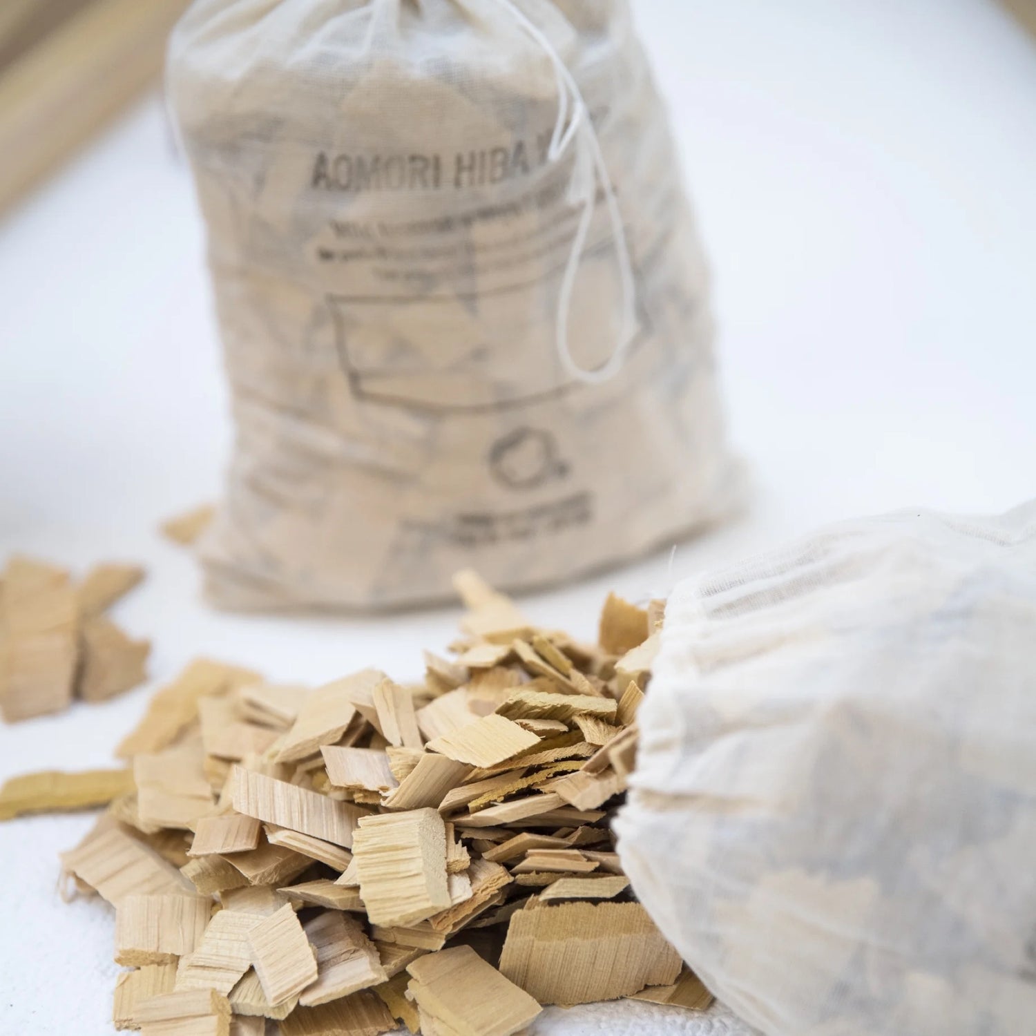湿気が多く、カビやニオイが気になる場所には青森ヒバチップ。ヒバの有効成分が多く含まれる赤身と呼ばれる部分だけを使用したチップです。香りがいいだけではなく、湿気を吸い、消臭もしてくれます。ガラスや陶器の器、ポーチに入れてお部屋の芳香材としてもお使いいただけます。香りの感じ方には、個人差がありますが、約3~6ヶ月ぐらいかけて徐々に薄くなりそして香りにも慣れてきます。はじめのフレッシュな香りが欲しい方は、買い換えていただくことをお勧めします。ポーチは別売りです。