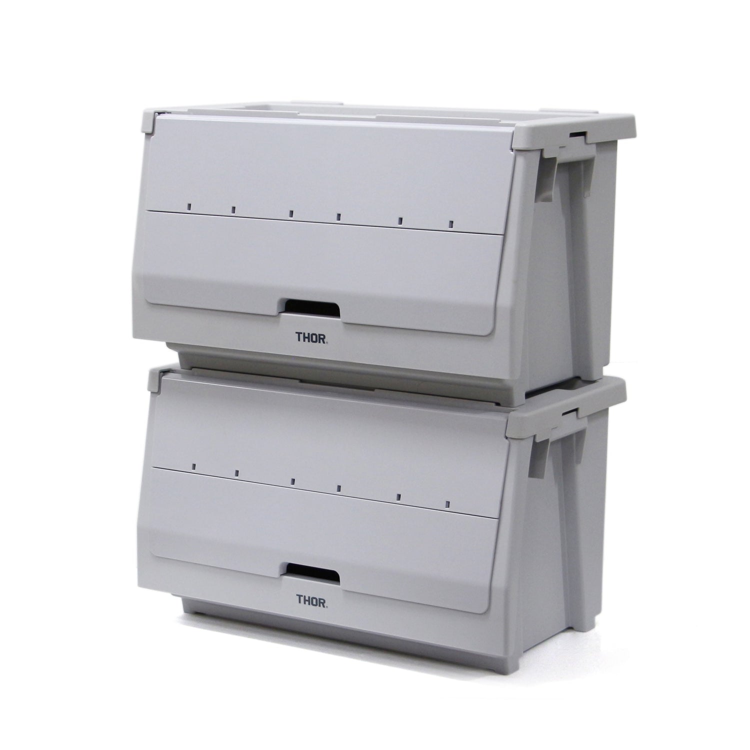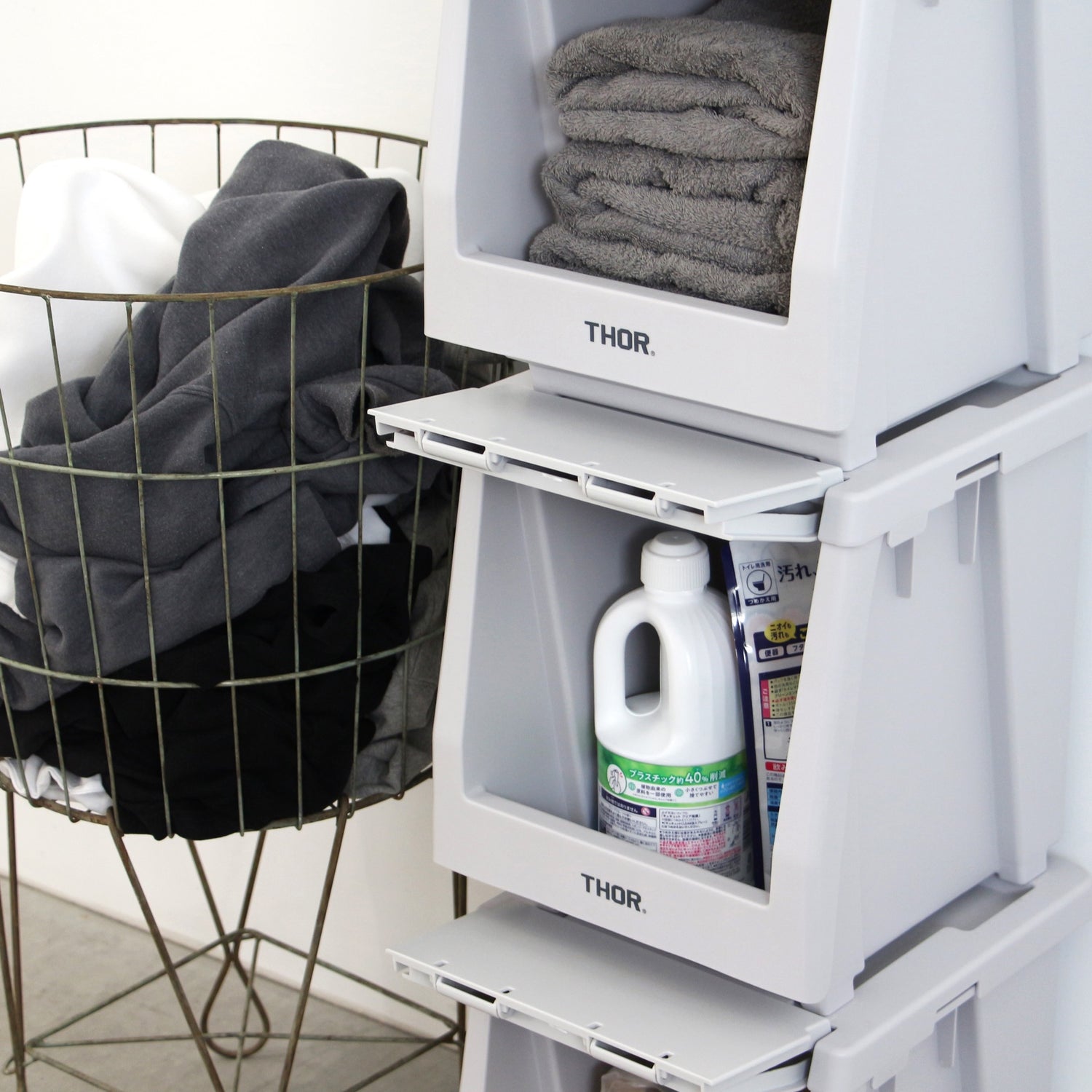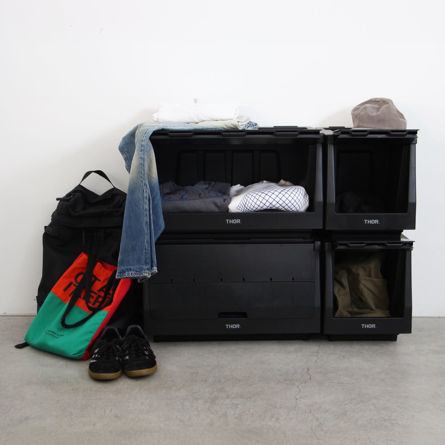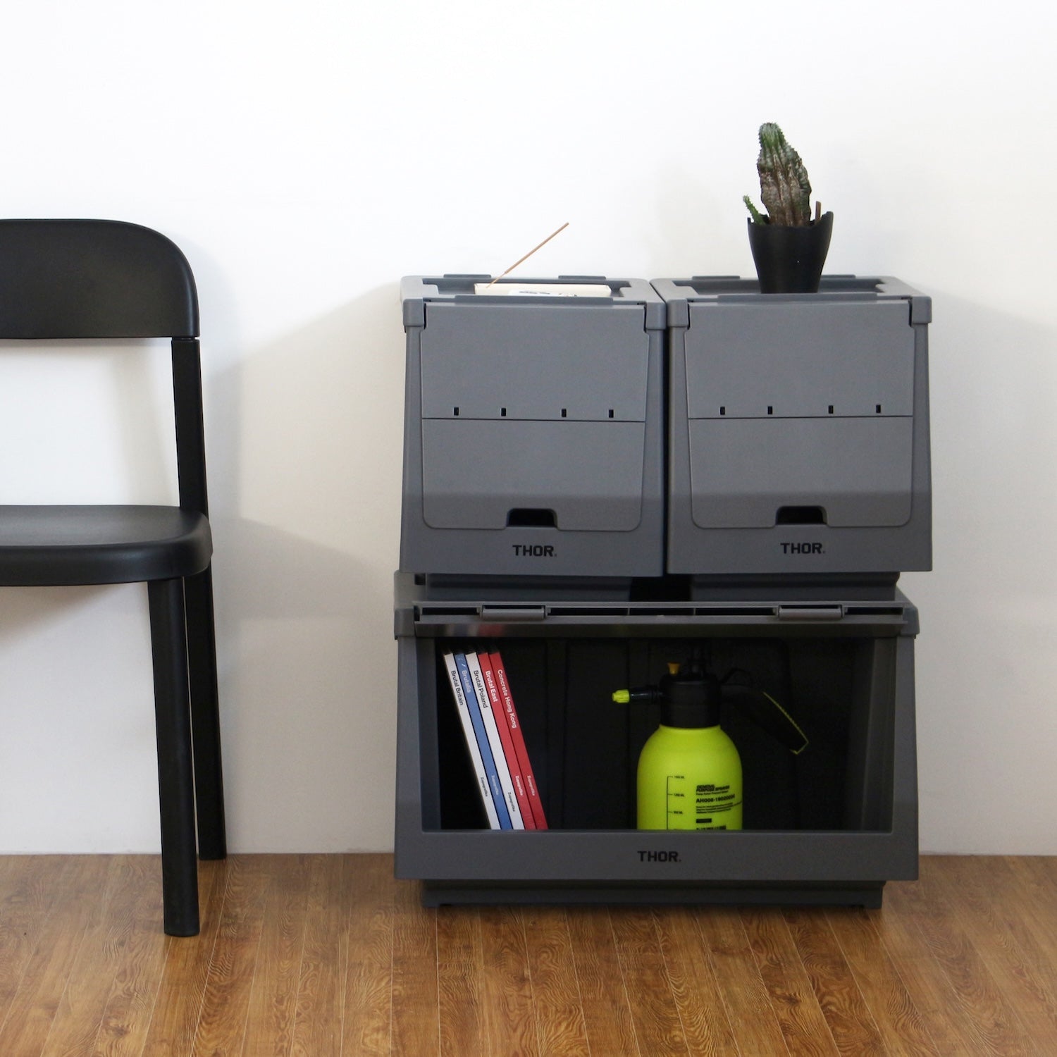 コンテナボックスといえば今や定番のTHORから、室内での収納に特化した「スタッキングシェルフコンテ」が登場したので、我が家にも導入しました。業務用感の強い従来のコンテナに比べて、生活空間にも馴染みやすい仕様。正直、画像だけ見たときは「ちょっと物足りないかも…?」と思ったけど、実際に部屋で使ってみるとこれがちょうどいい。無骨さは残しつつ、ちゃんと生活雑貨に寄り添ってる感じ。前扉は開けっぱなしに固定できて、出し入れもスムーズ。折りたたみコンテナによくある耐荷重20〜30kgとは違い、これは120kgとタフ仕様(さすがTHOR)。アウトドアでももちろん活躍してくれそうです。内寸の高さが33.5cmあるのも地味に優秀で、2Lのペットボトルや雑誌も立てたまま収納できます。ここ、意外と見逃せないポイントかも。20Lと50Lの2サイズ展開で、カラーは3色。20Lはソファ横に置いてサイドテーブルとして使うのもアリ。3段までスタッキングOKなので、50L+20L×2の組み合わせなんかも楽しい。物置部屋の壁一面に並べて、配色を楽しむのもアリです。これは、室内収納の新しい定番になっていく気がしてます。