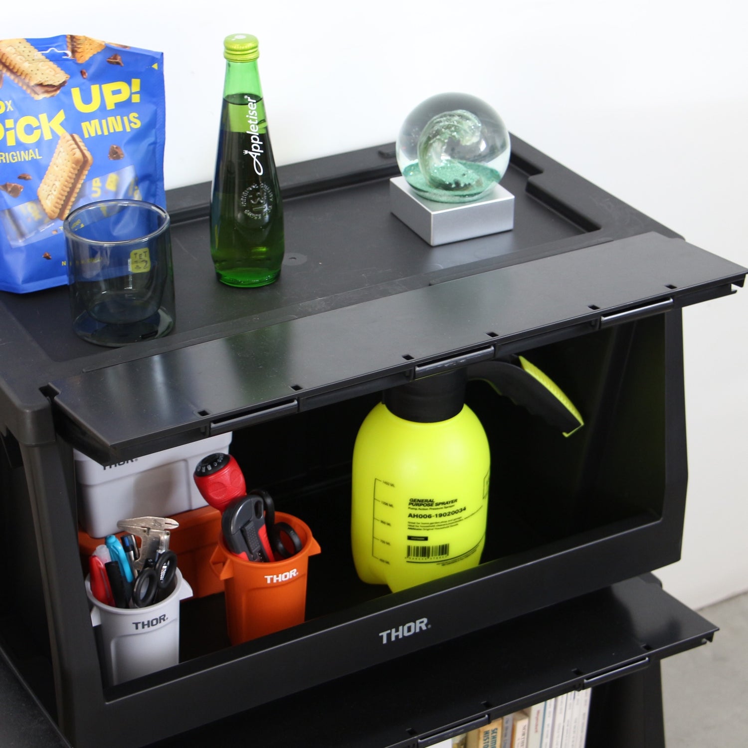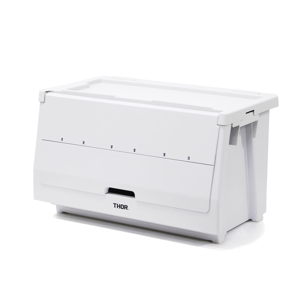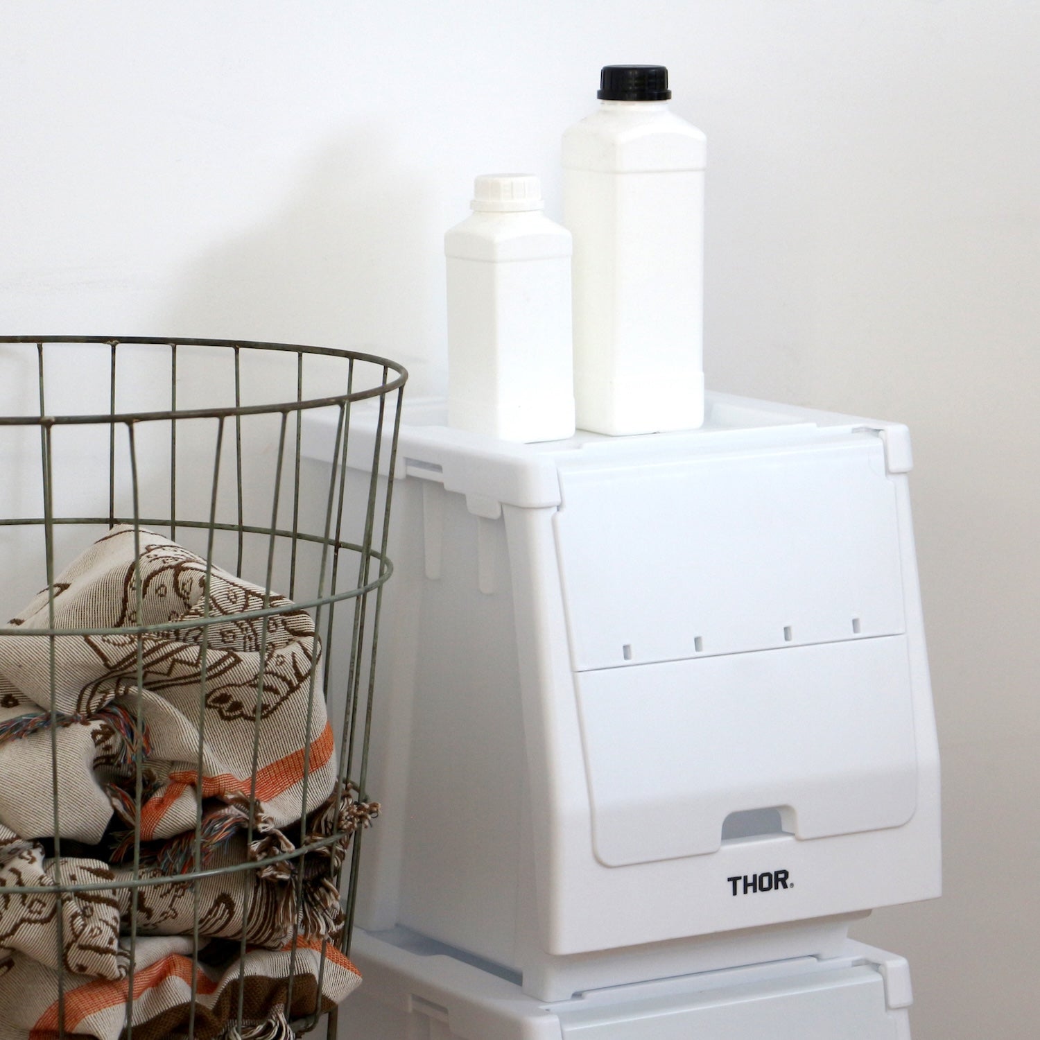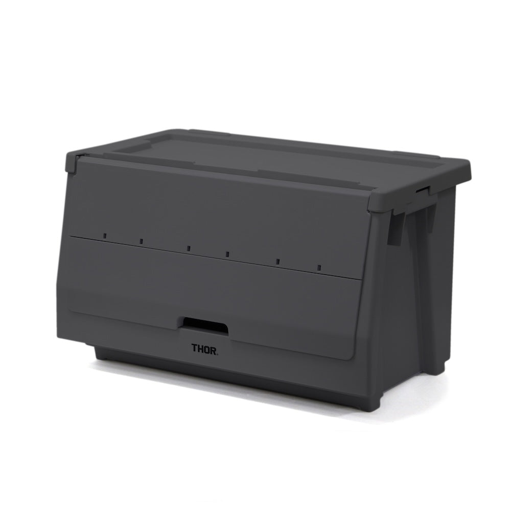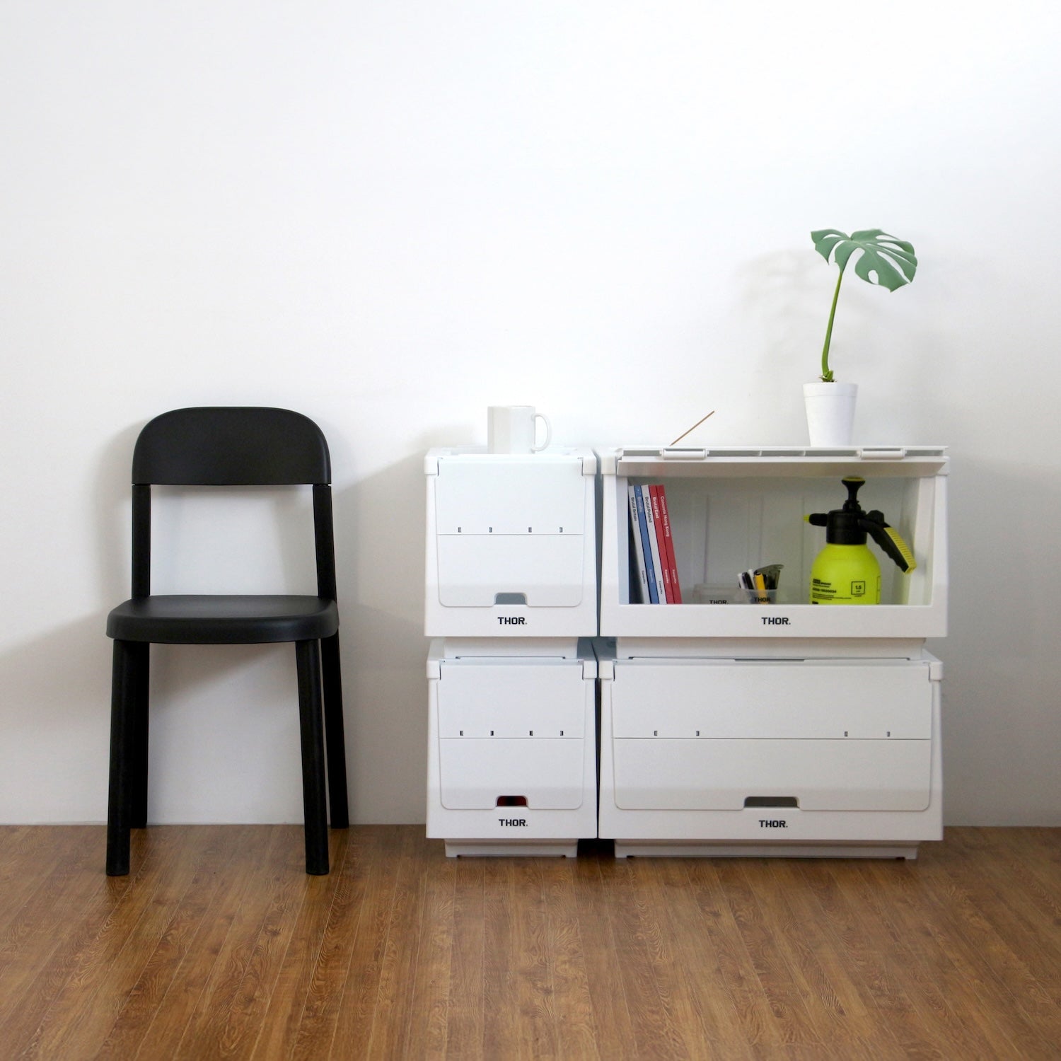 コンテナボックスといえば今や定番のTHORから、室内での収納に特化した「スタッキングシェルフコンテ」が登場したので、我が家にも導入しました。業務用感の強い従来のコンテナに比べて、生活空間にも馴染みやすい仕様。正直、画像だけ見たときは「ちょっと物足りないかも…?」と思ったけど、実際に部屋で使ってみるとこれがちょうどいい。無骨さは残しつつ、ちゃんと生活雑貨に寄り添ってる感じ。前扉は開けっぱなしに固定できて、出し入れもスムーズ。折りたたみコンテナによくある耐荷重20〜30kgとは違い、これは120kgとタフ仕様(さすがTHOR)。アウトドアでももちろん活躍してくれそうです。内寸の高さが33.5cmあるのも地味に優秀で、2Lのペットボトルや雑誌も立てたまま収納できます。ここ、意外と見逃せないポイントかも。20Lと50Lの2サイズ展開で、カラーは3色。20Lはソファ横に置いてサイドテーブルとして使うのもアリ。3段までスタッキングOKなので、50L+20L×2の組み合わせなんかも楽しい。物置部屋の壁一面に並べて、配色を楽しむのもアリです。これは、室内収納の新しい定番になっていく気がしてます。