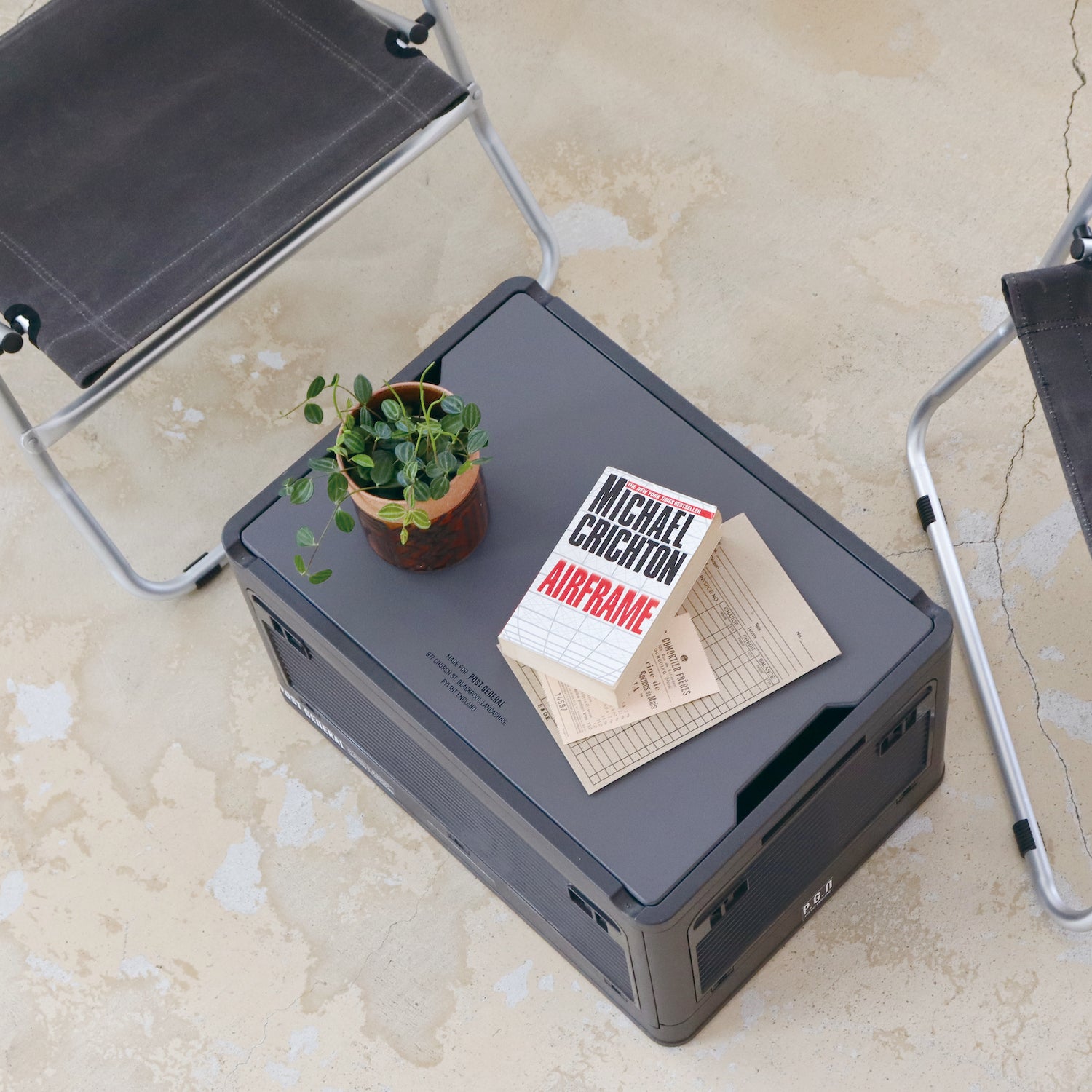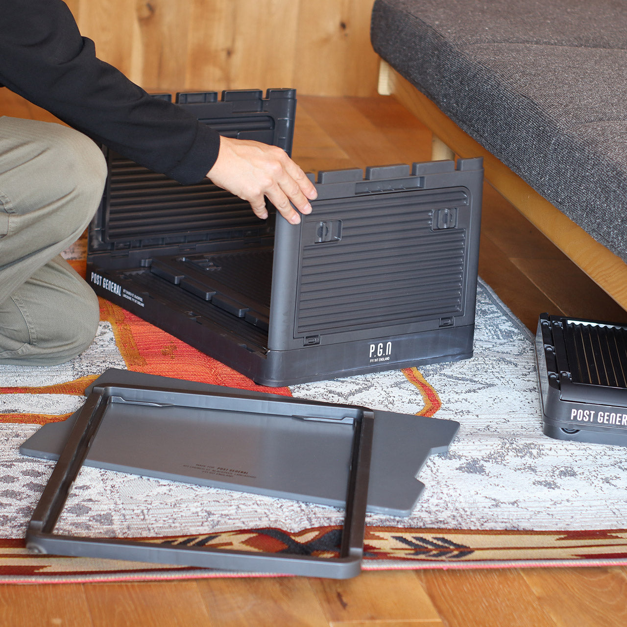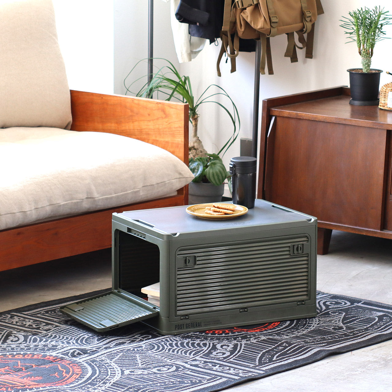 使い勝手の良い折りたたみ式のコンテナボックス。底面にはキャスターが付いており移動も楽々です。テーブルとして使える天板を標準装備。蓋の代わりにもなります。アウトドアシーンでのちょっとしたテーブルとしても便利。持ち運んでそのまま使える万能アイテム。スタッキングが可能で、重ねた状態でも、中に入れたものを取り出せるように4面すべてにロック式のドアを装備。使わない時は簡単に折りたためるので、置き場所にも困りません。