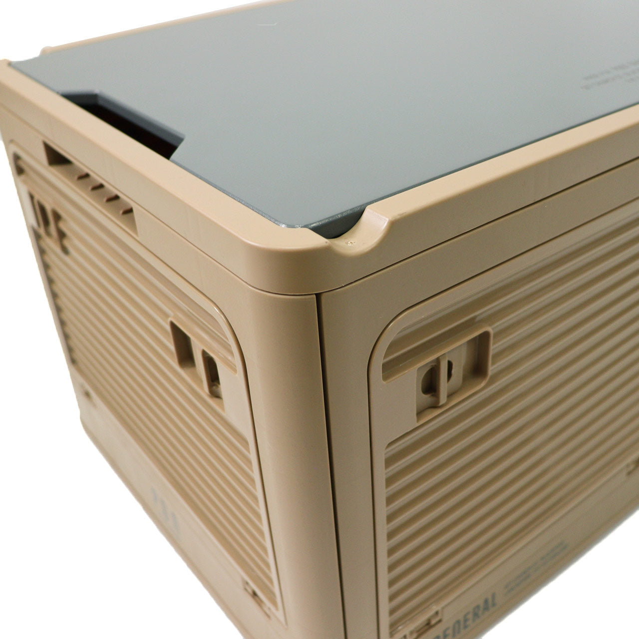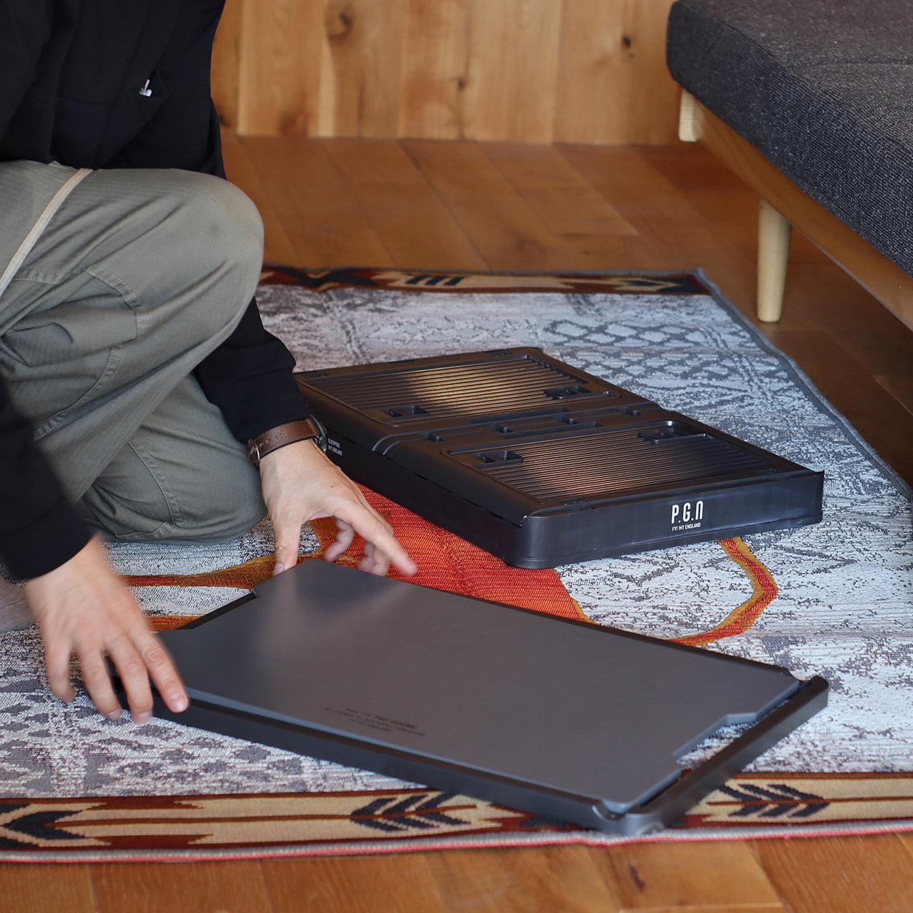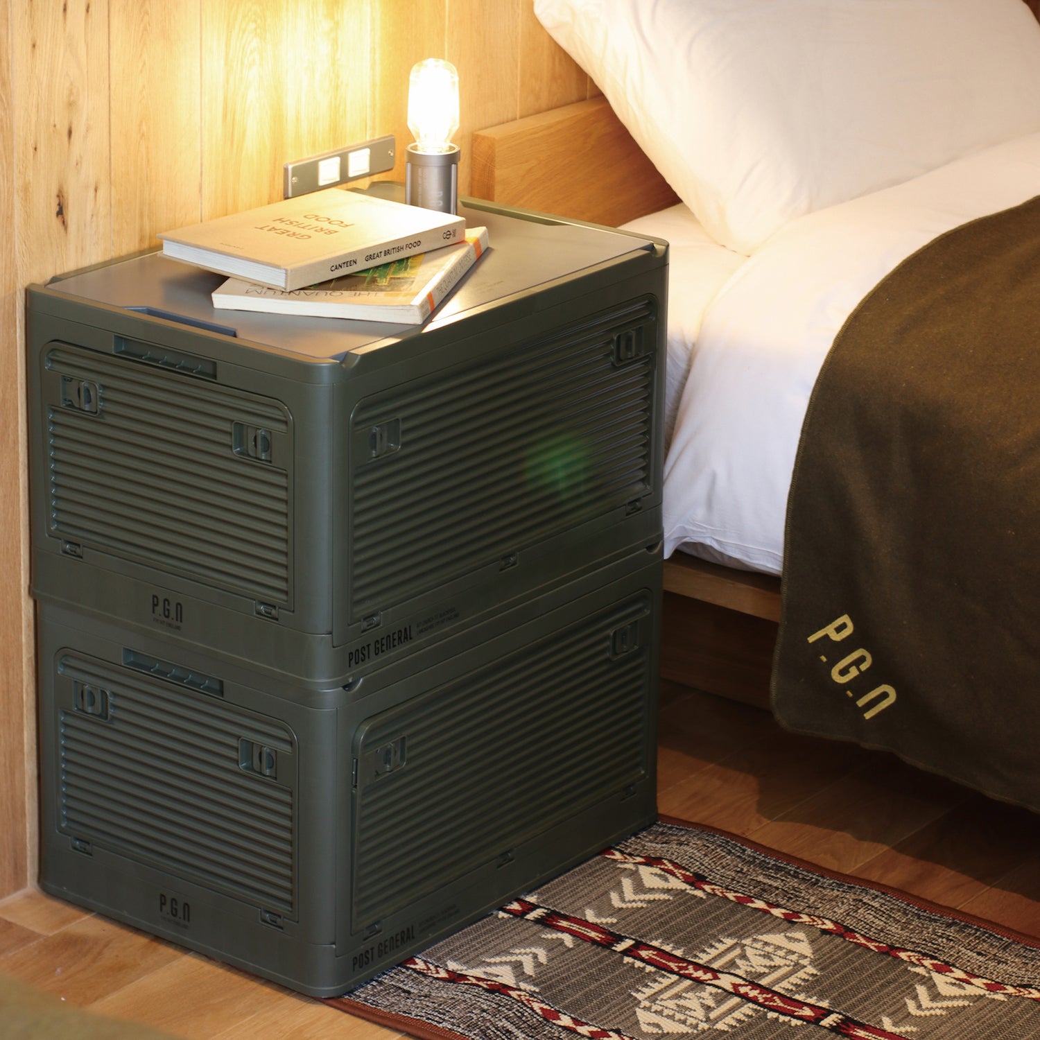 使い勝手の良い折りたたみ式のコンテナボックス。底面にはキャスターが付いており移動も楽々です。テーブルとして使える天板を標準装備。蓋の代わりにもなります。アウトドアシーンでのちょっとしたテーブルとしても便利。持ち運んでそのまま使える万能アイテム。スタッキングが可能で、重ねた状態でも、中に入れたものを取り出せるように4面すべてにロック式のドアを装備。使わない時は簡単に折りたためるので、置き場所にも困りません。