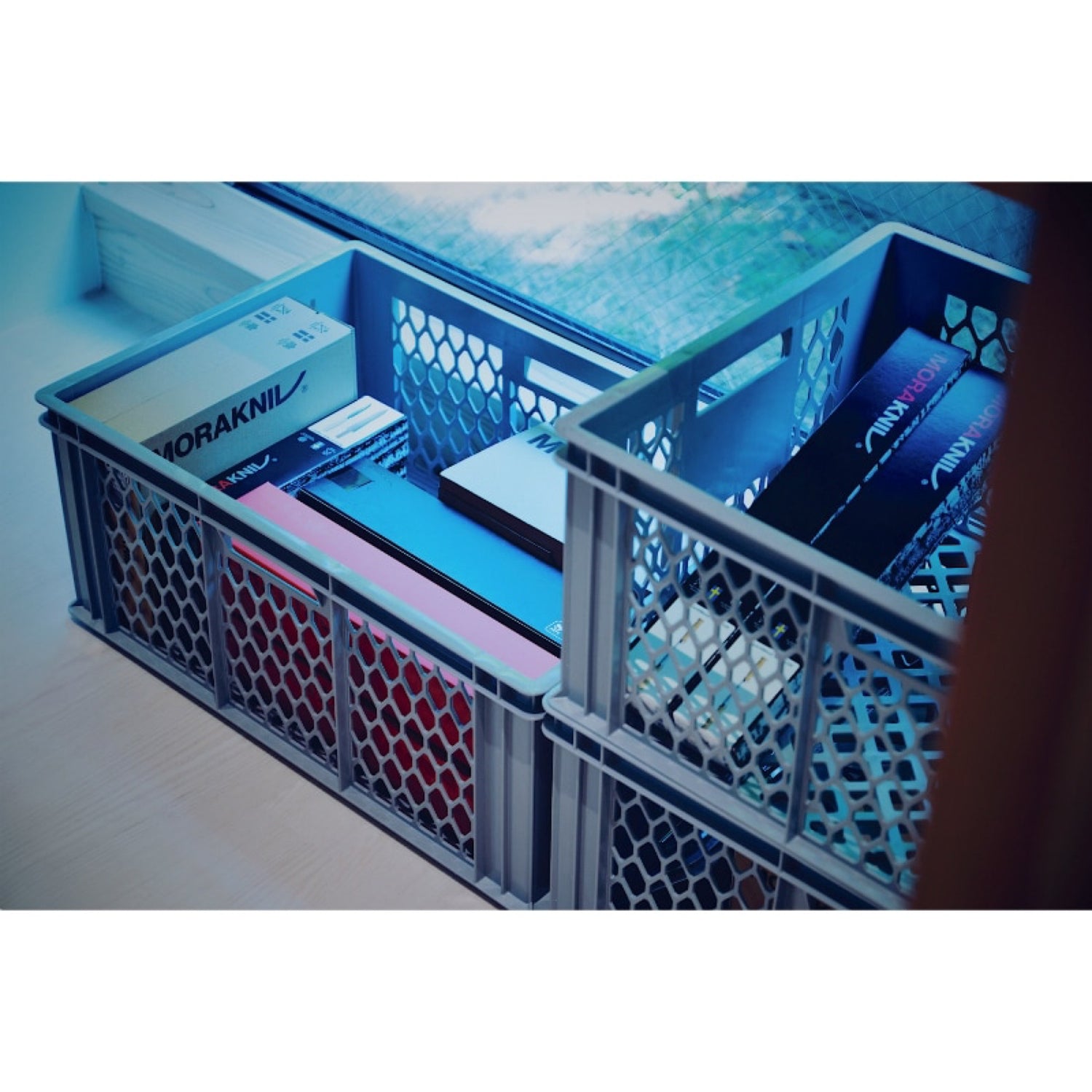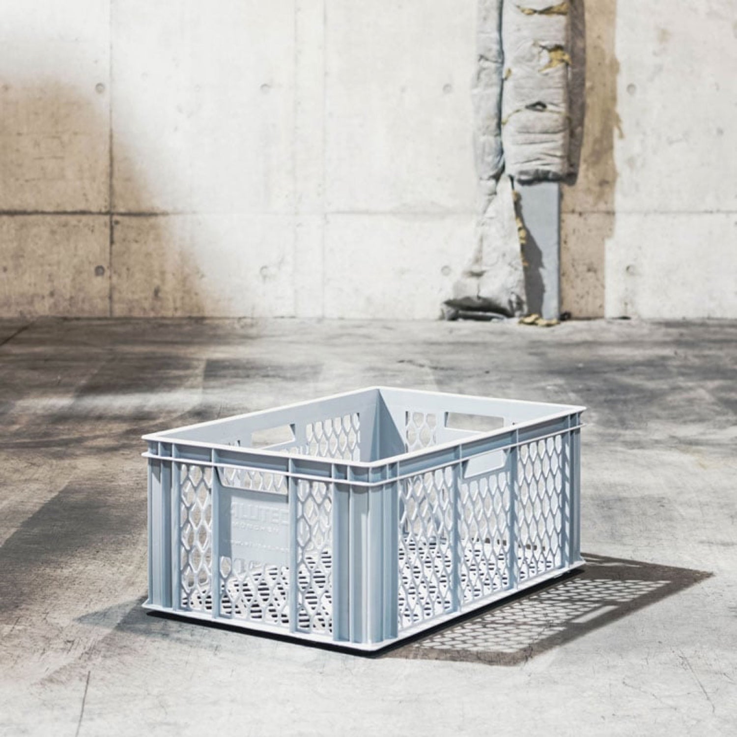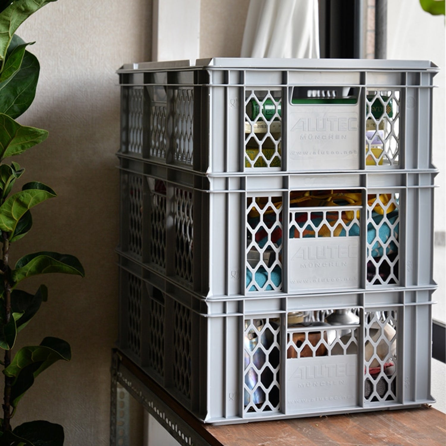 ヨーロッパで物流用に使用されている軽くて丈夫なコンテナ。スタッキング可能。箱自体が軽いので、中に重いものを入れても持ち運びが容易です。精悍なグレーでアルミコンテナと並べても統一感があります。