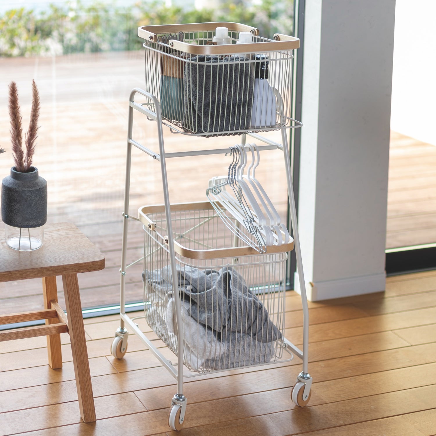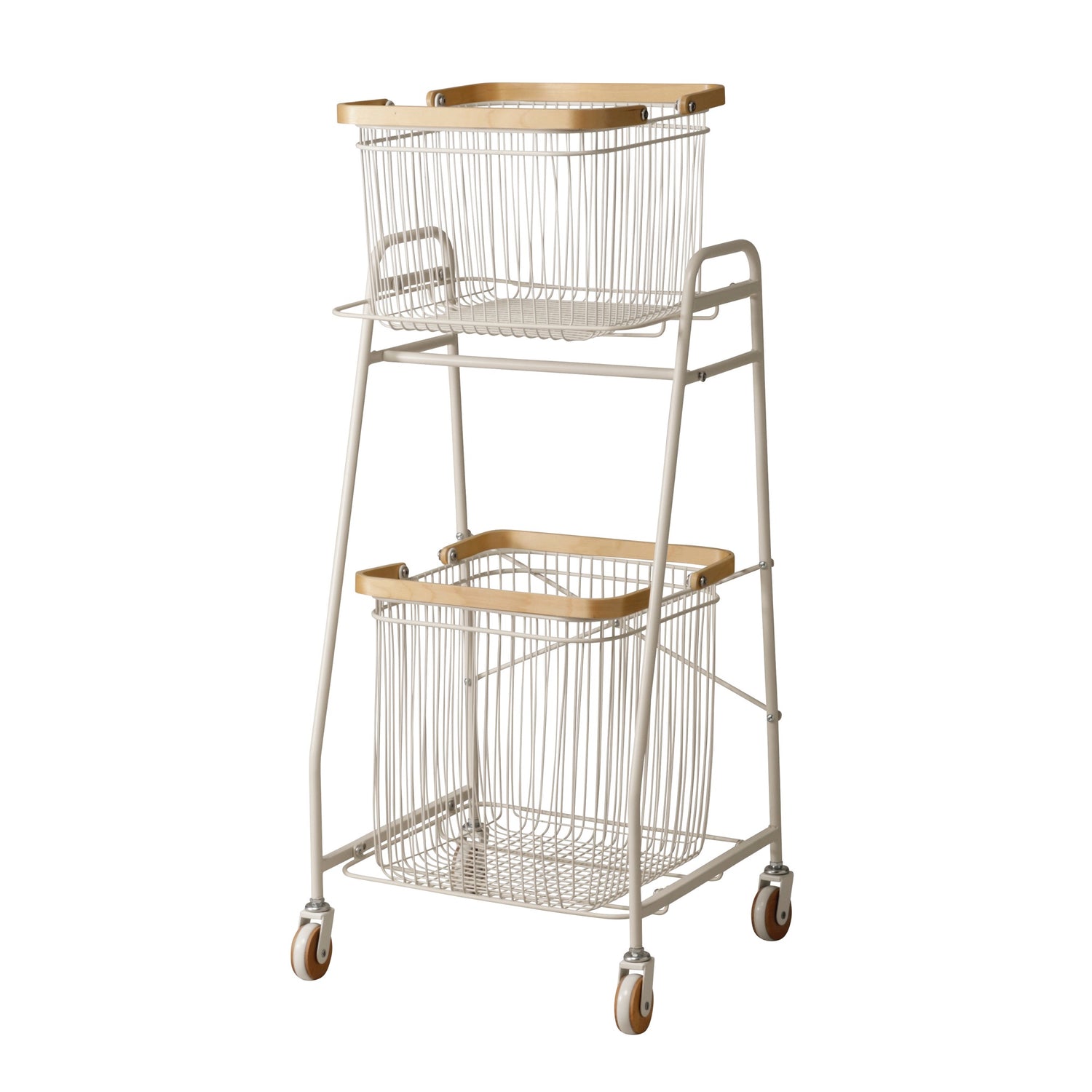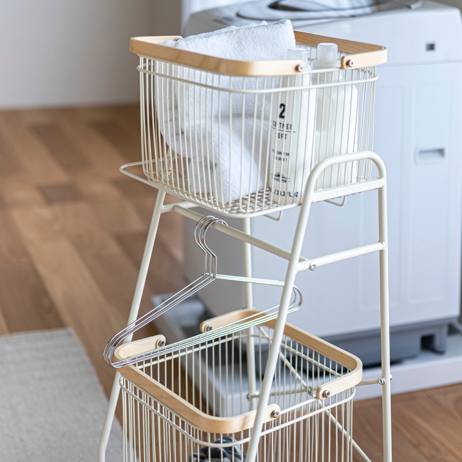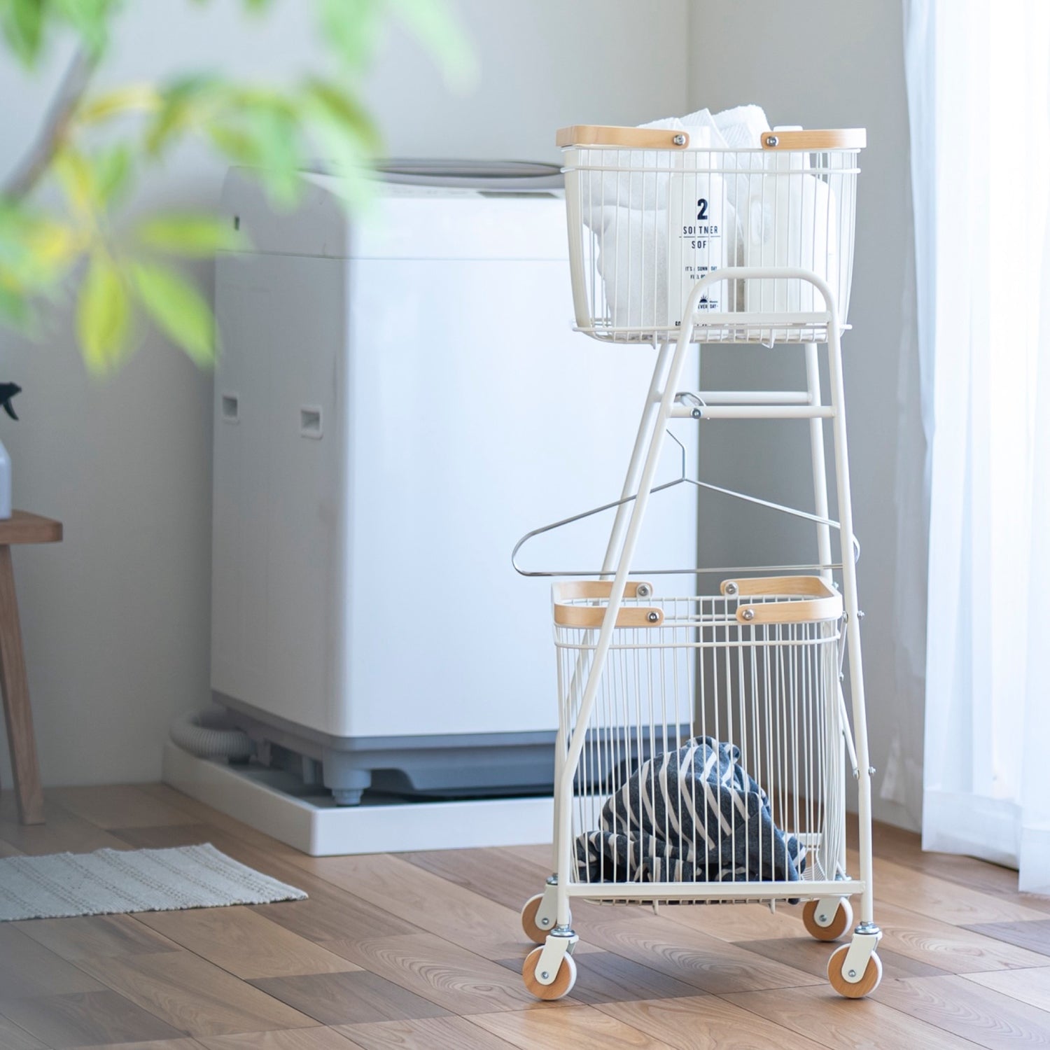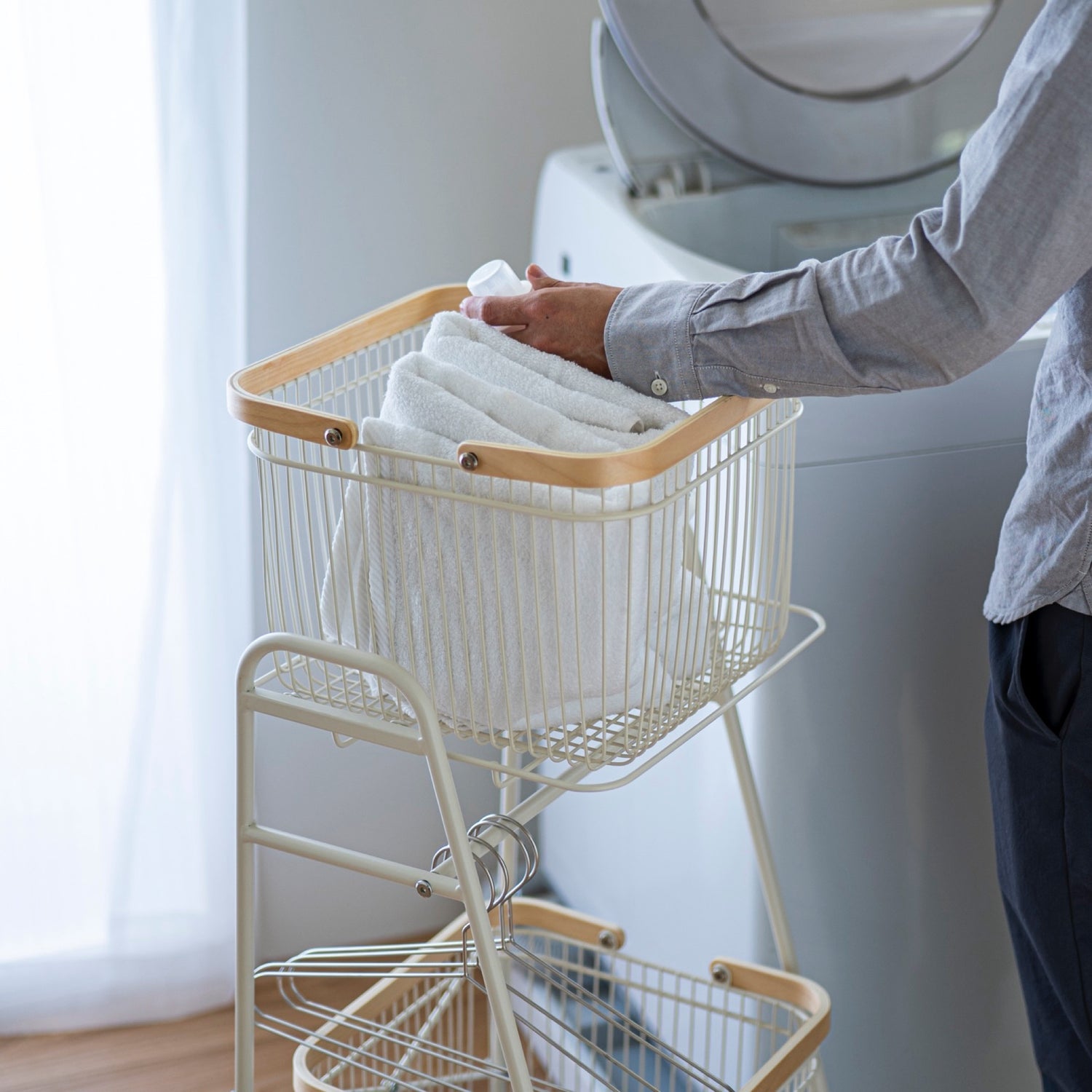 狭いスペースでも扱いやすく、大きさの異なるバスケット棚が使いやすいワゴン。取手付きのカゴは持ち運び可能なので、よく使うものをカゴごと移動できます。洗濯機の高さに合わせたサイズ感で、ランドリールームで活躍。上段のカゴ下のバーは、物干し前のハンガーの仮置き場としても活用できます。木製フレームとバスケット棚の軽やかなコンビネーションも魅力で、天然木を使用したデザイン性の高いキャスター付き。ワゴンごと移動させて使うこともできます。おしゃれなデザインで、お子様のおもちゃ等を収納するラックとしてもご使用いただけます。組み立て品です。