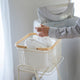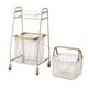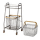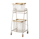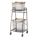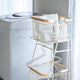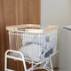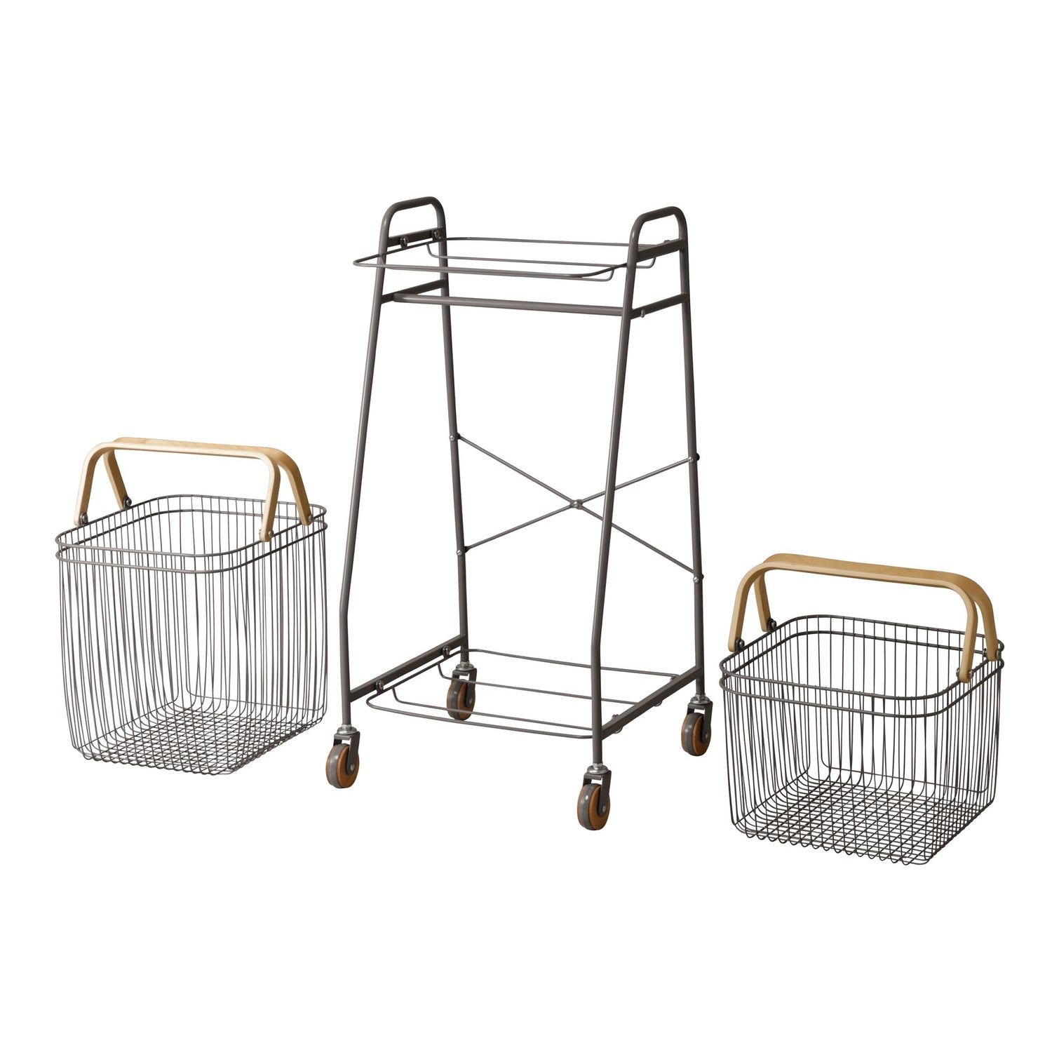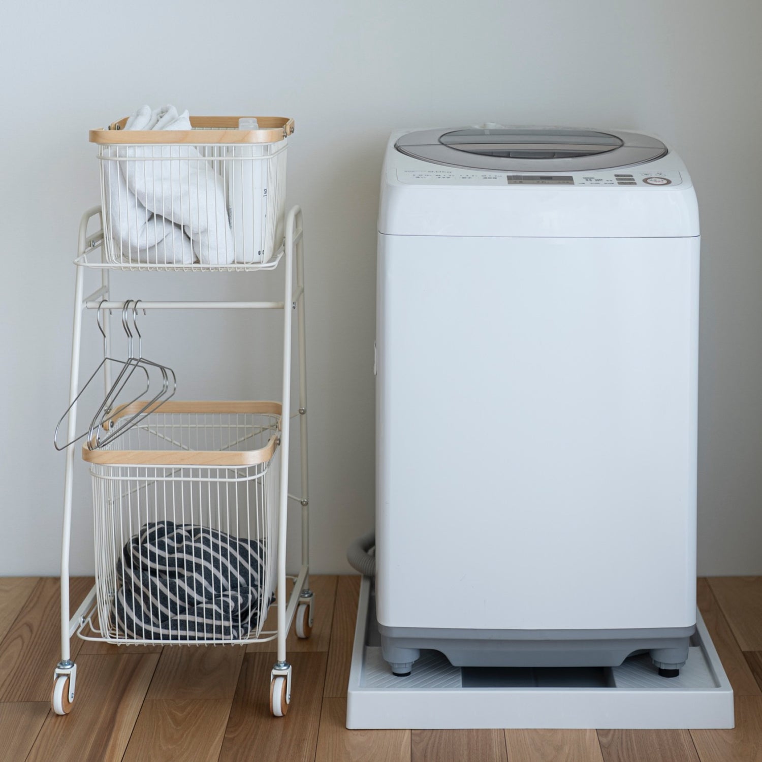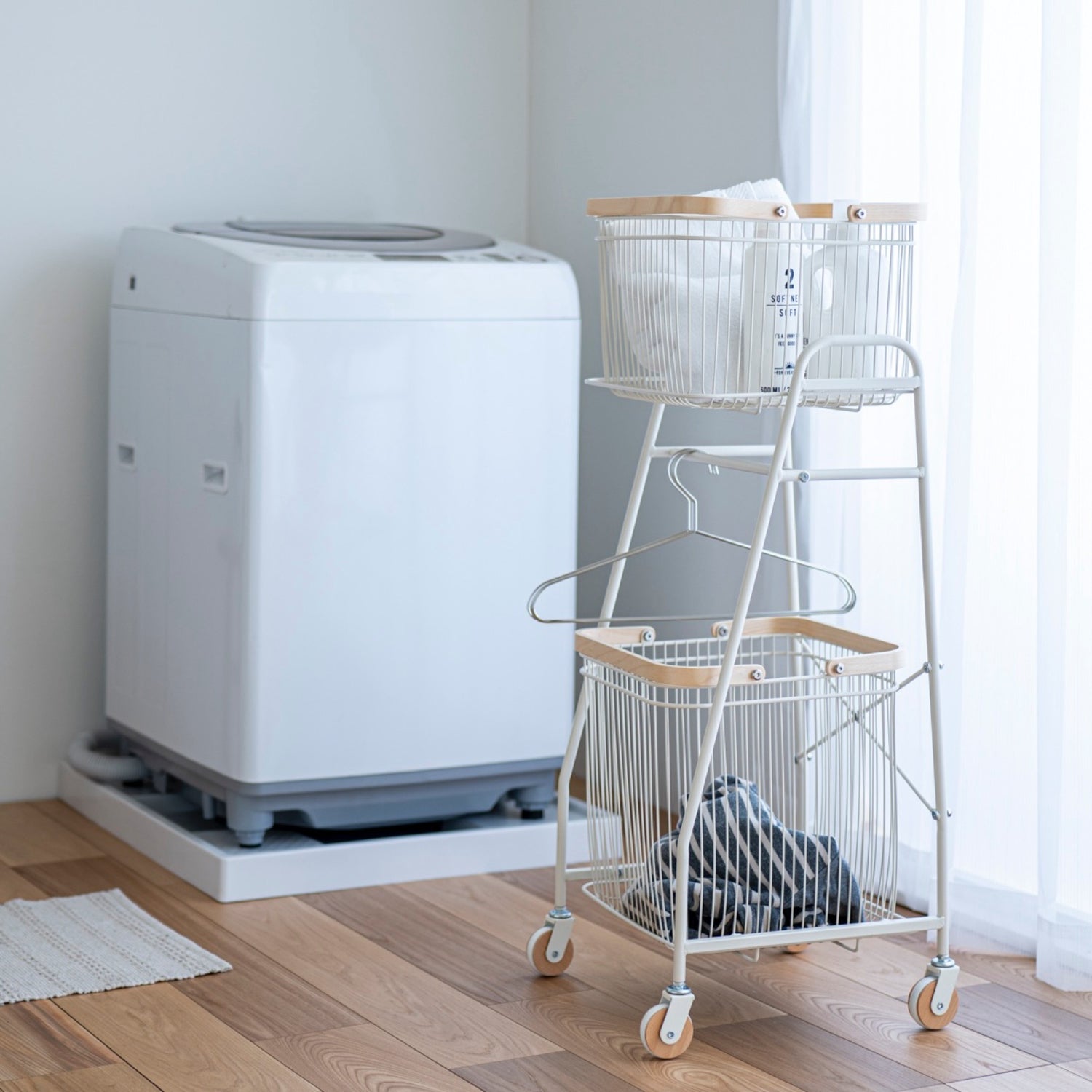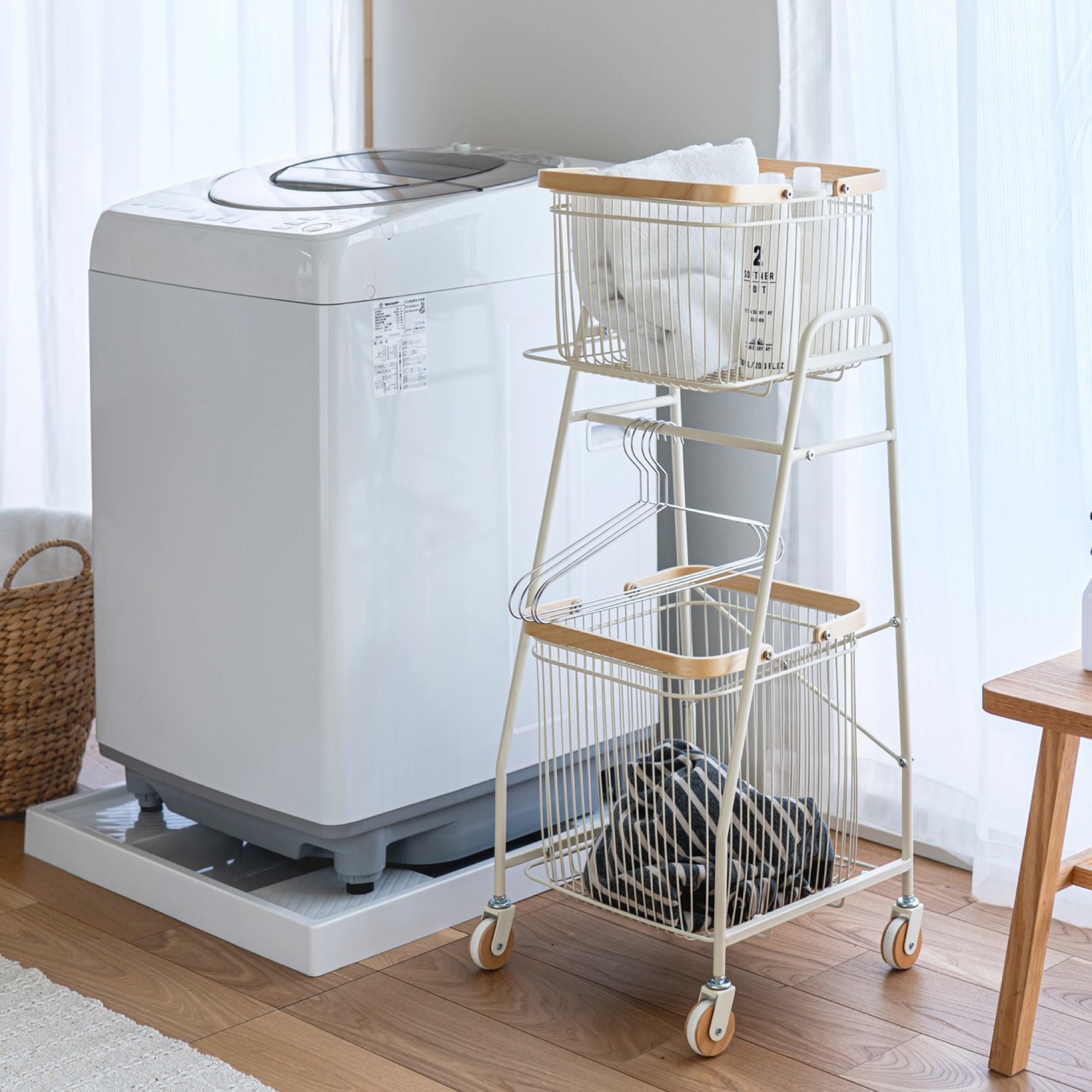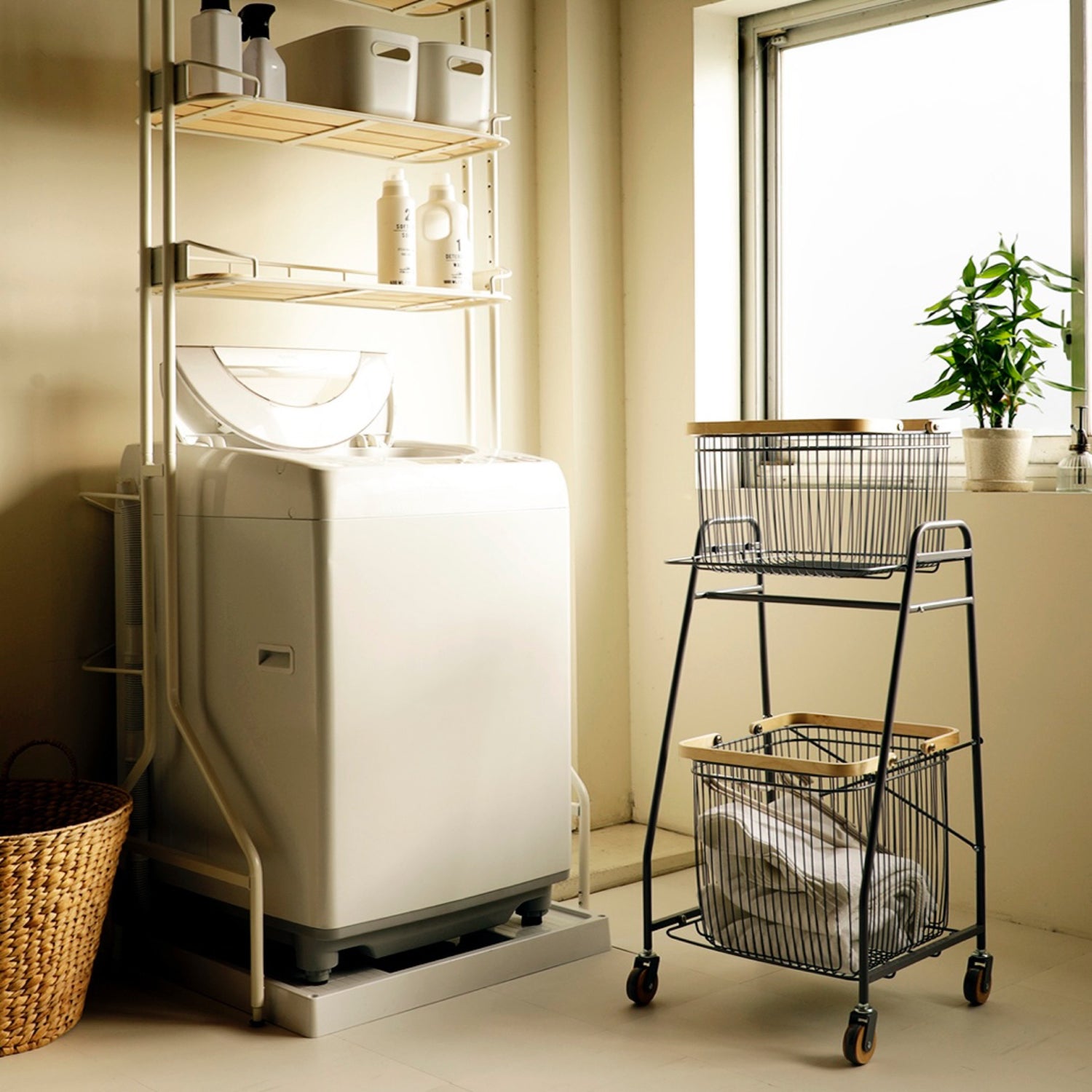 狭いスペースでも扱いやすく、大きさの異なるバスケット棚が使いやすいワゴン。取手付きのカゴは持ち運び可能なので、よく使うものをカゴごと移動できます。洗濯機の高さに合わせたサイズ感で、ランドリールームで活躍。上段のカゴ下のバーは、物干し前のハンガーの仮置き場としても活用できます。木製フレームとバスケット棚の軽やかなコンビネーションも魅力で、天然木を使用したデザイン性の高いキャスター付き。ワゴンごと移動させて使うこともできます。おしゃれなデザインで、お子様のおもちゃ等を収納するラックとしてもご使用いただけます。組み立て品です。