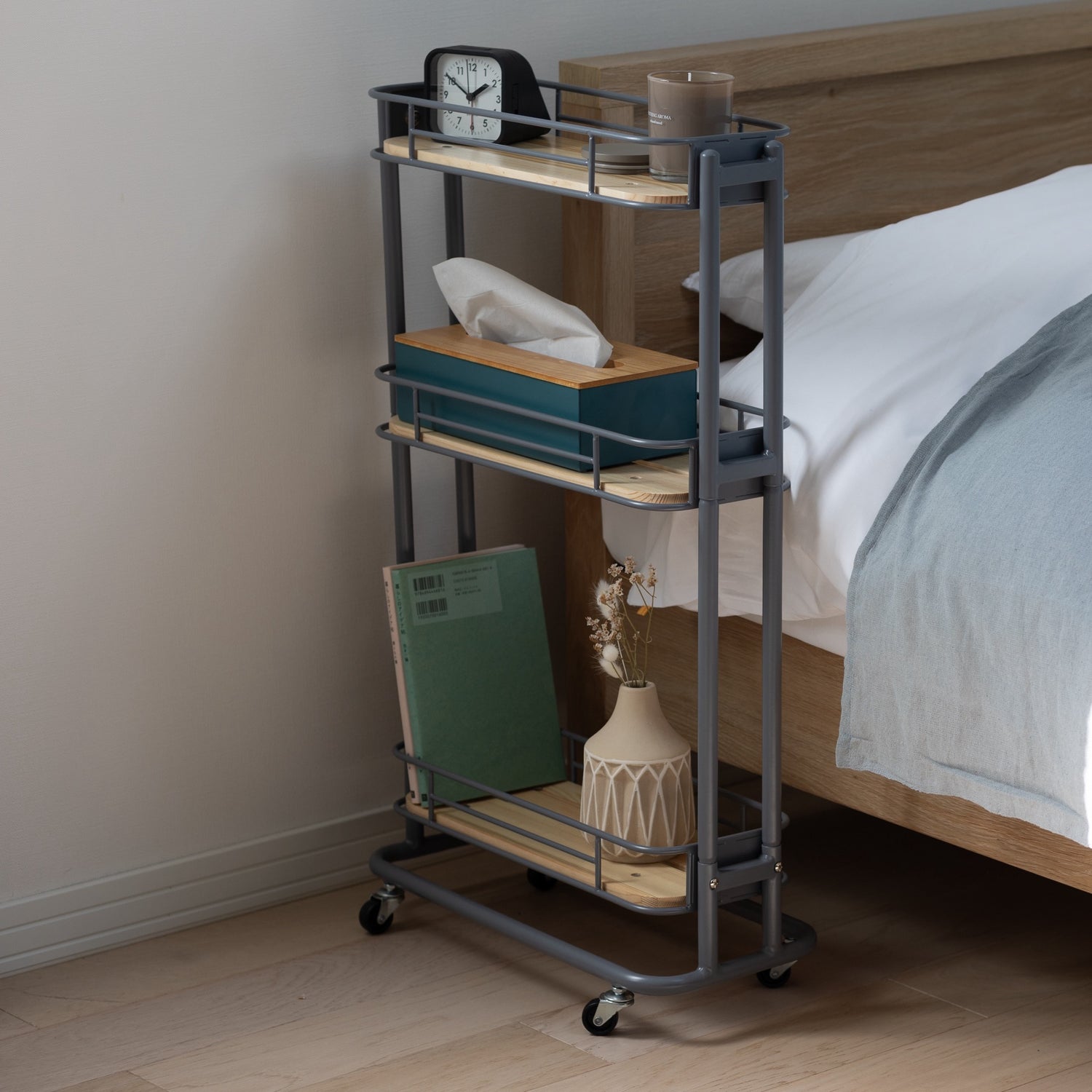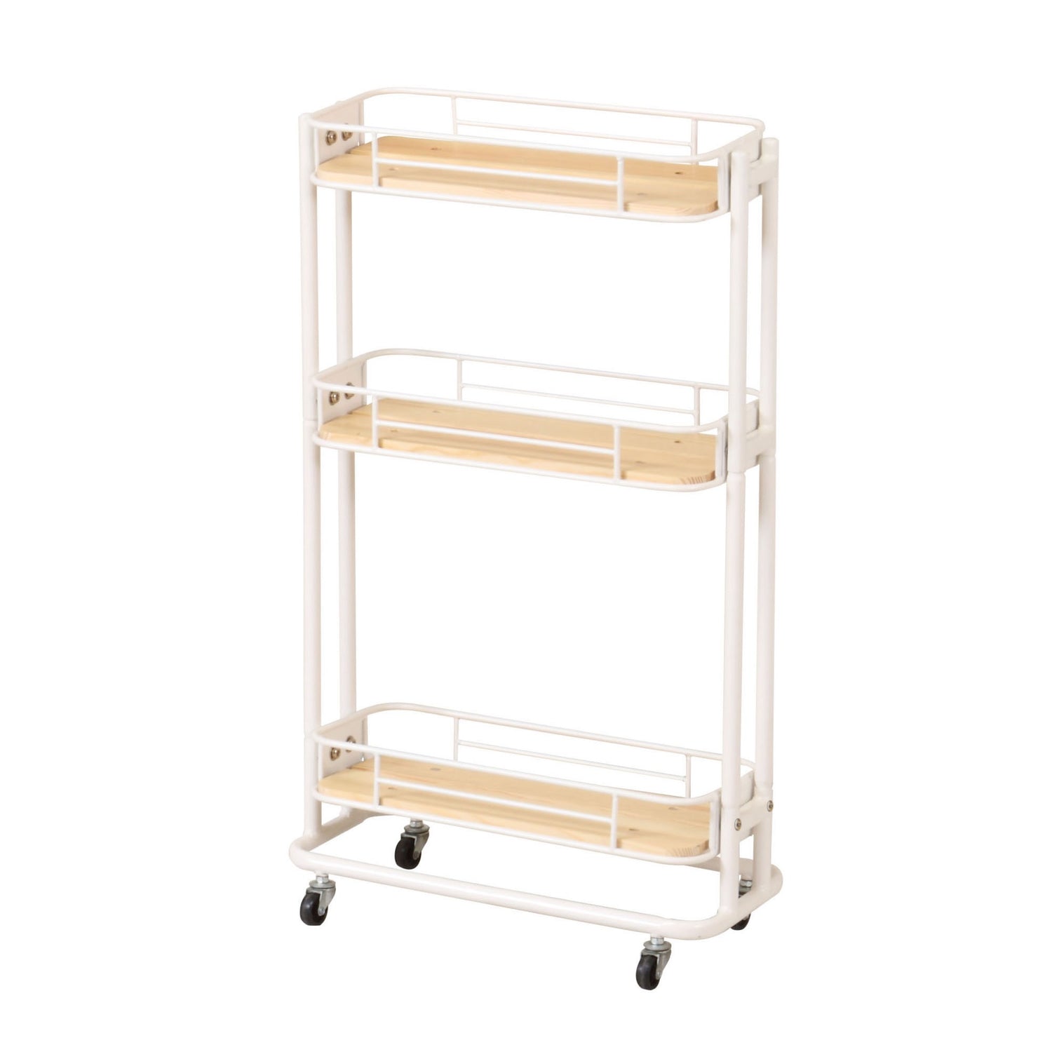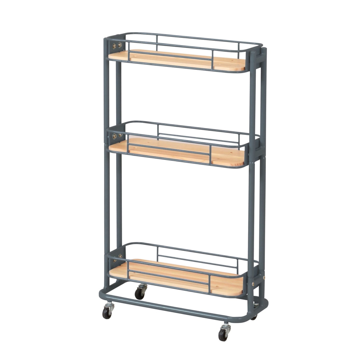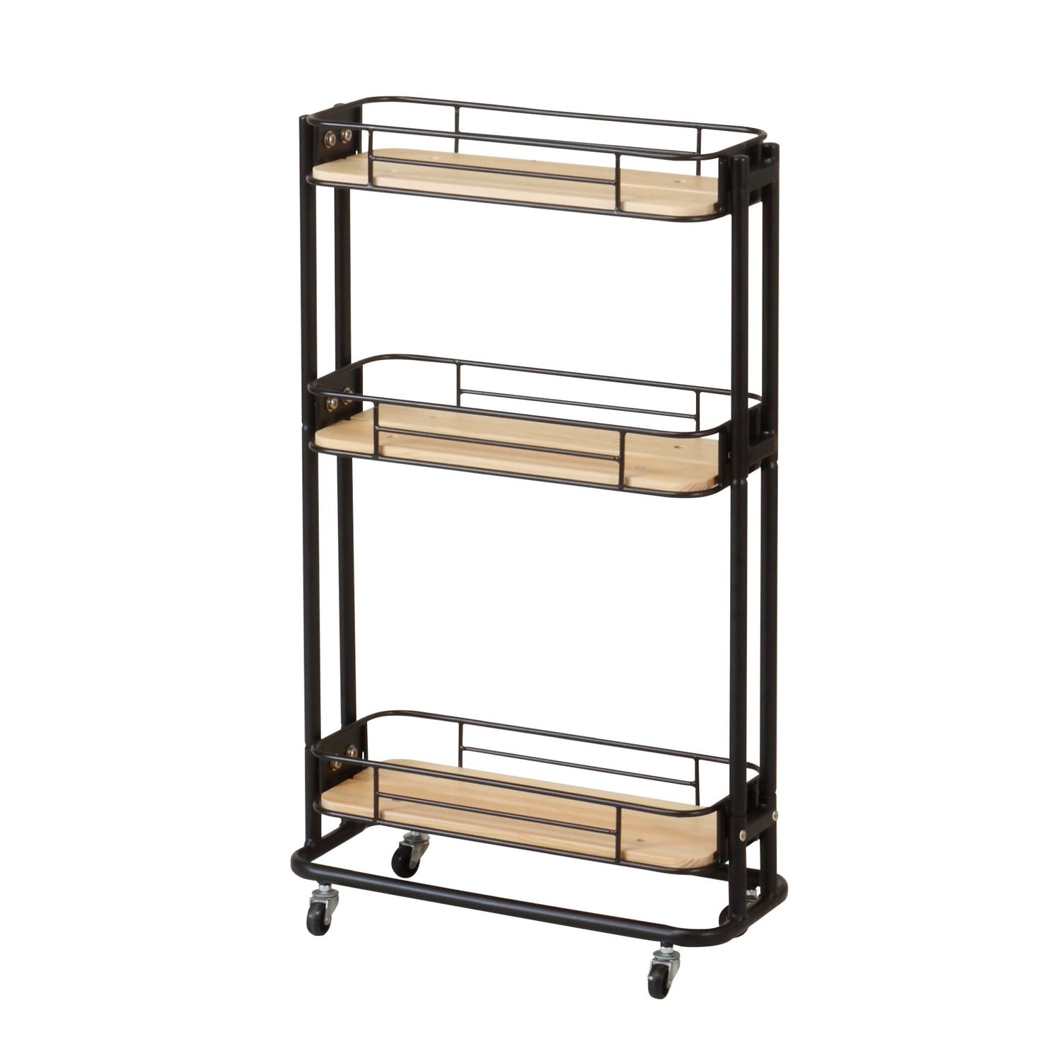 パインウッドとアイアン風スチールの組み合わせがオシャレな、使うシーンを選ばない万能ワゴンです。幅約200mmのスリムタイプは、キッチンやランドリーなどのちょっとした隙間を有効活用することができます。どこにでも置きやすいので、ソファサイドやベット周りでサイドテーブルとしてもお使いいただけます。棚はカゴ状で、置いた荷物が落ちにくい形状です。脚にはキャスターが付いており、使う時に隙間から引き出しやすい仕様です。組み立て品です。