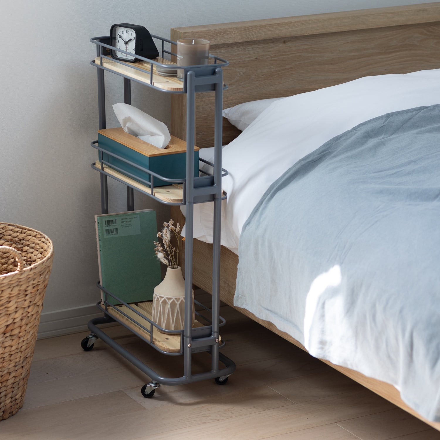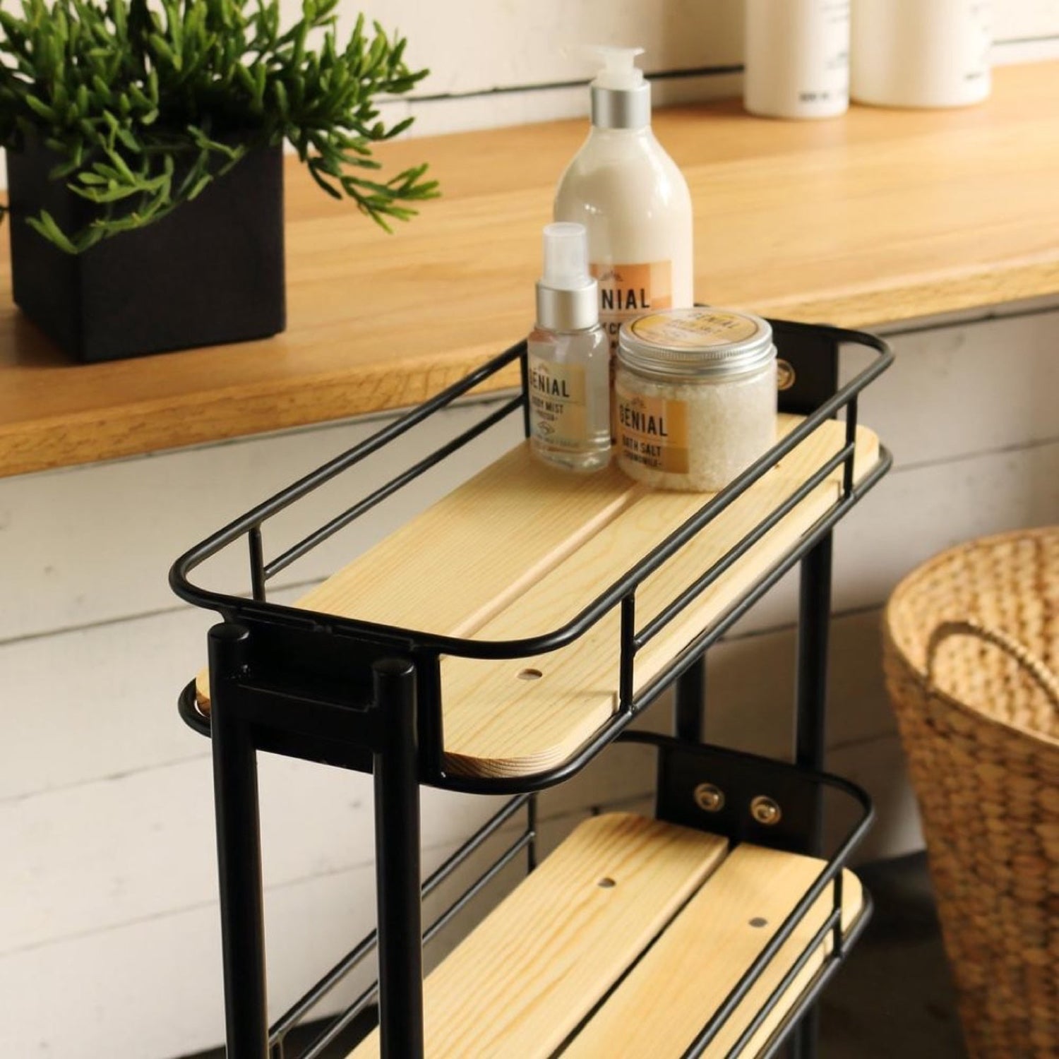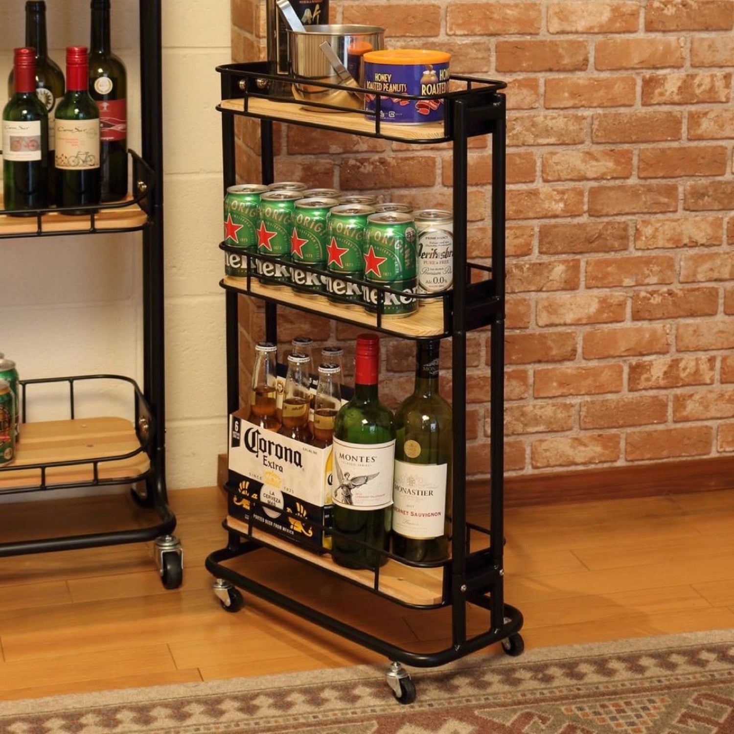 パインウッドとアイアン風スチールの組み合わせがオシャレな、使うシーンを選ばない万能ワゴンです。幅約200mmのスリムタイプは、キッチンやランドリーなどのちょっとした隙間を有効活用することができます。どこにでも置きやすいので、ソファサイドやベット周りでサイドテーブルとしてもお使いいただけます。棚はカゴ状で、置いた荷物が落ちにくい形状です。脚にはキャスターが付いており、使う時に隙間から引き出しやすい仕様です。組み立て品です。