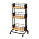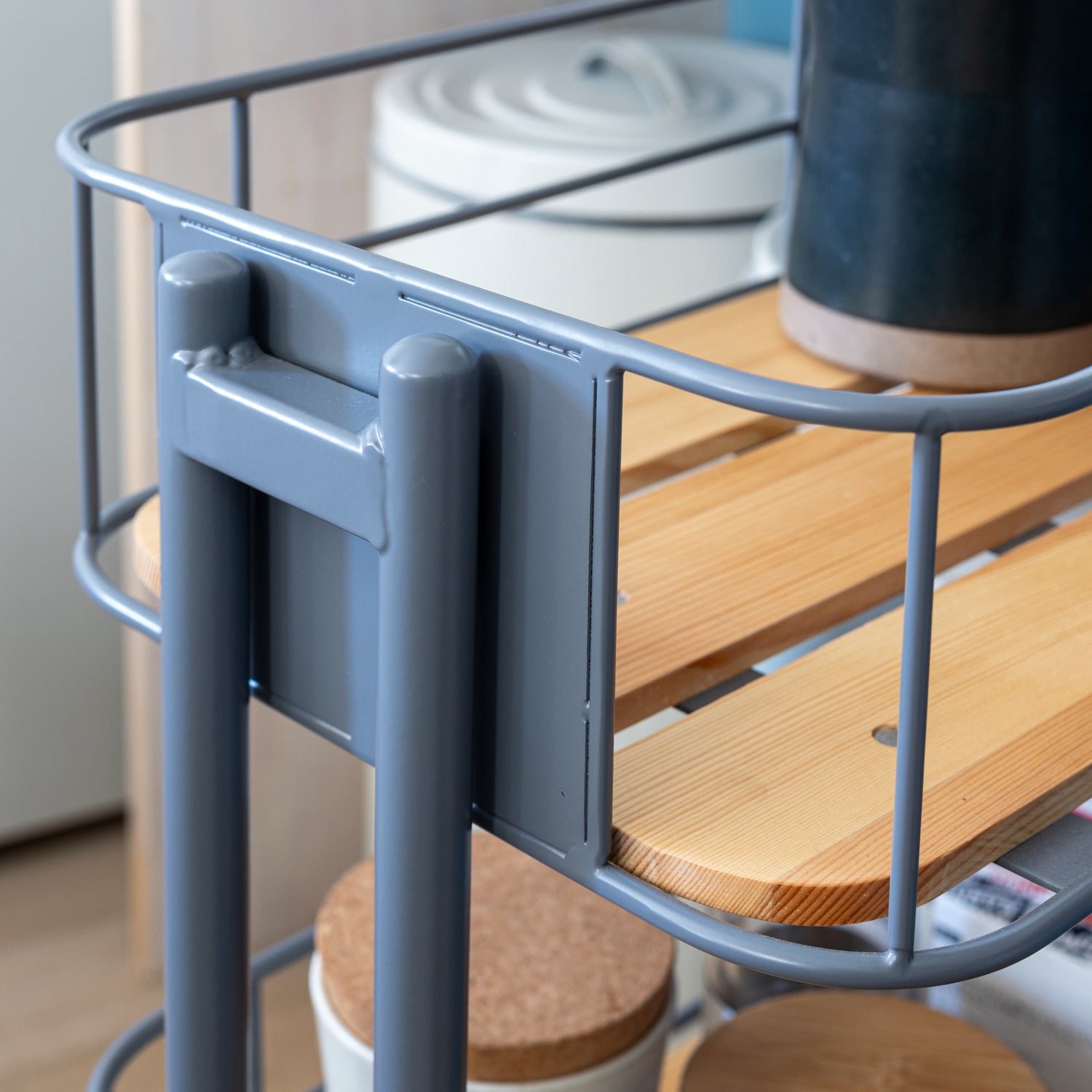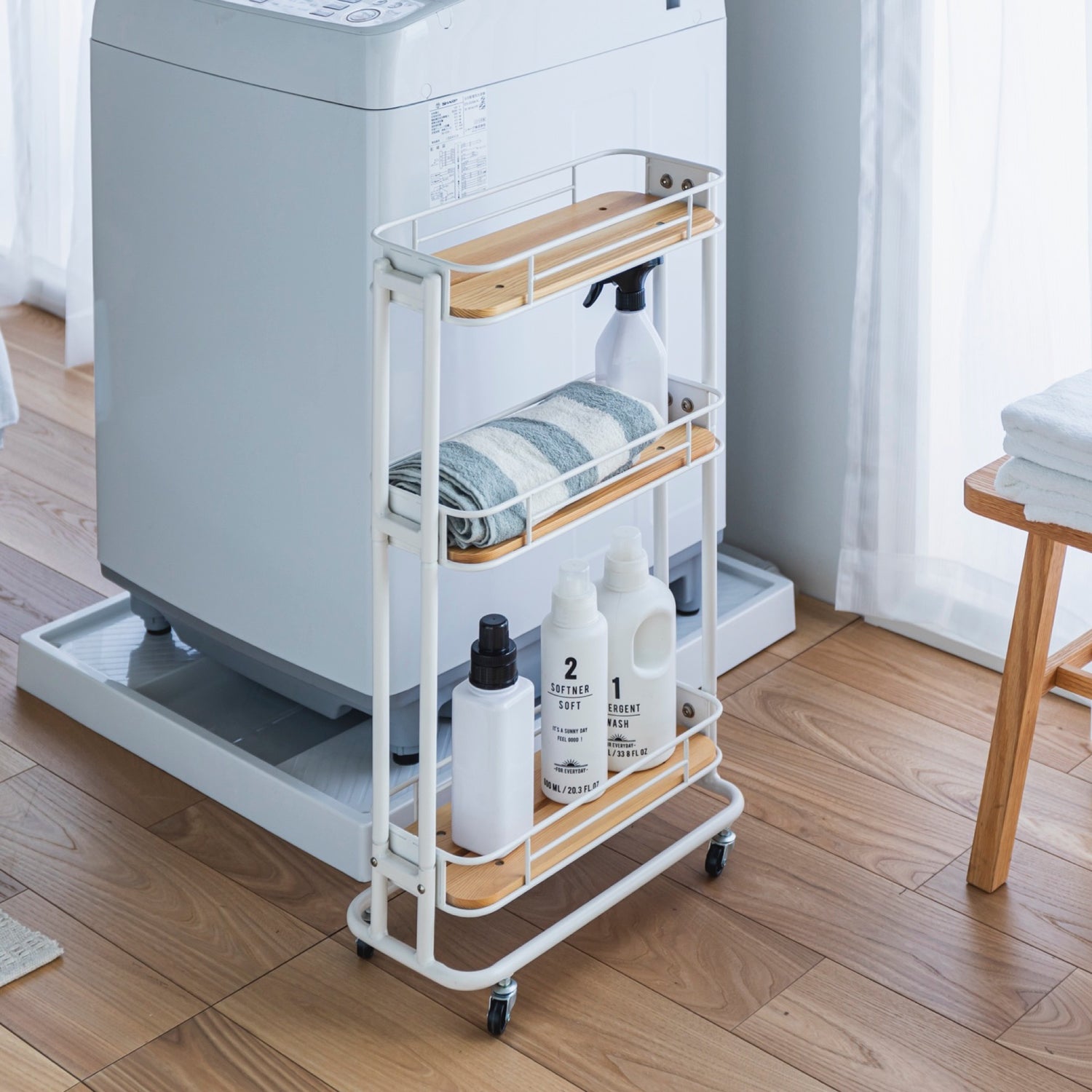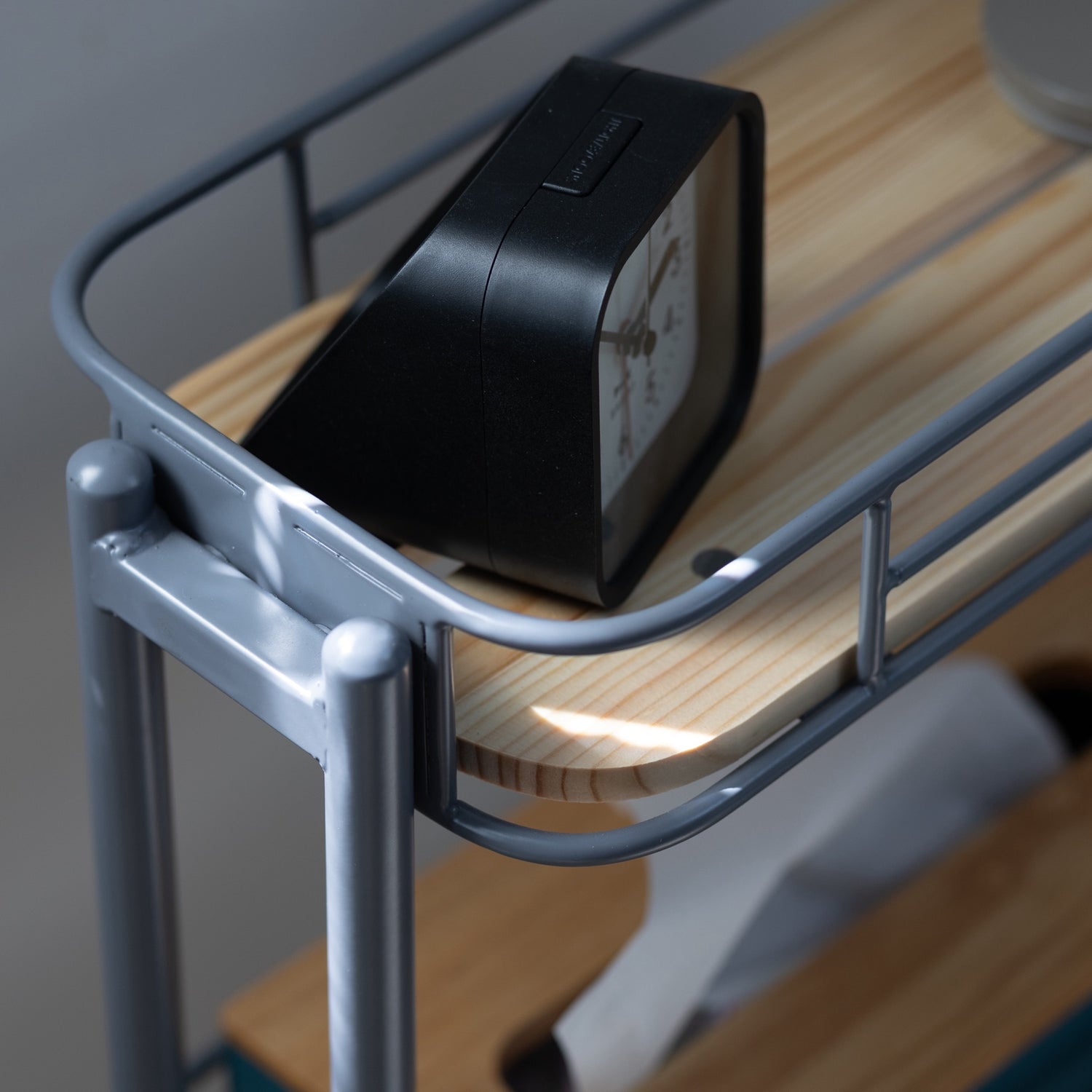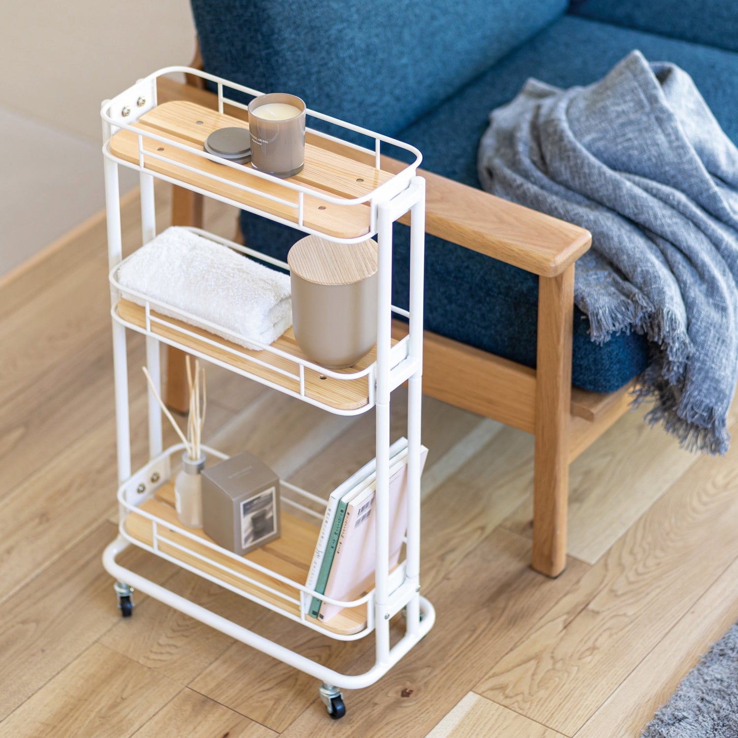 パインウッドとアイアン風スチールの組み合わせがオシャレな、使うシーンを選ばない万能ワゴンです。幅約200mmのスリムタイプは、キッチンやランドリーなどのちょっとした隙間を有効活用することができます。どこにでも置きやすいので、ソファサイドやベット周りでサイドテーブルとしてもお使いいただけます。棚はカゴ状で、置いた荷物が落ちにくい形状です。脚にはキャスターが付いており、使う時に隙間から引き出しやすい仕様です。組み立て品です。