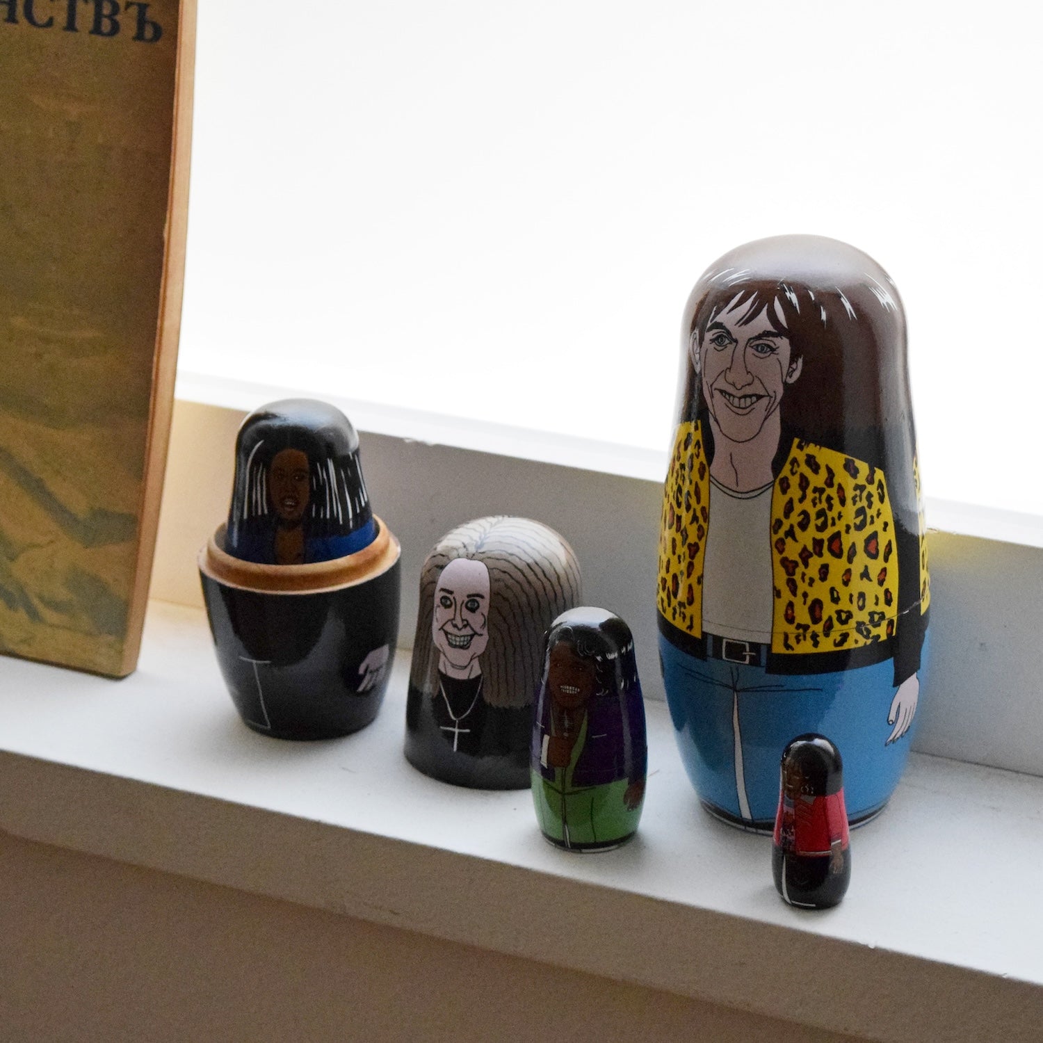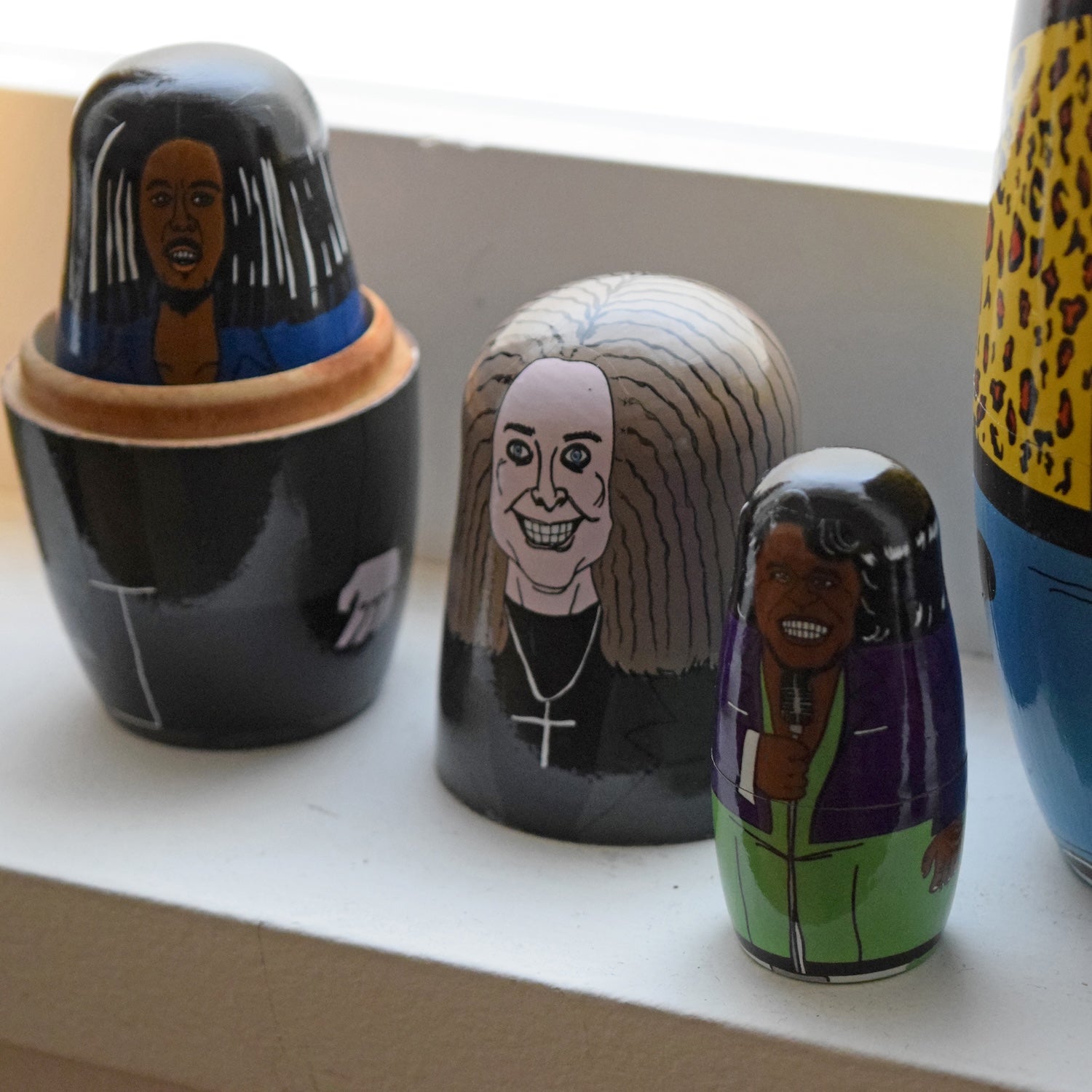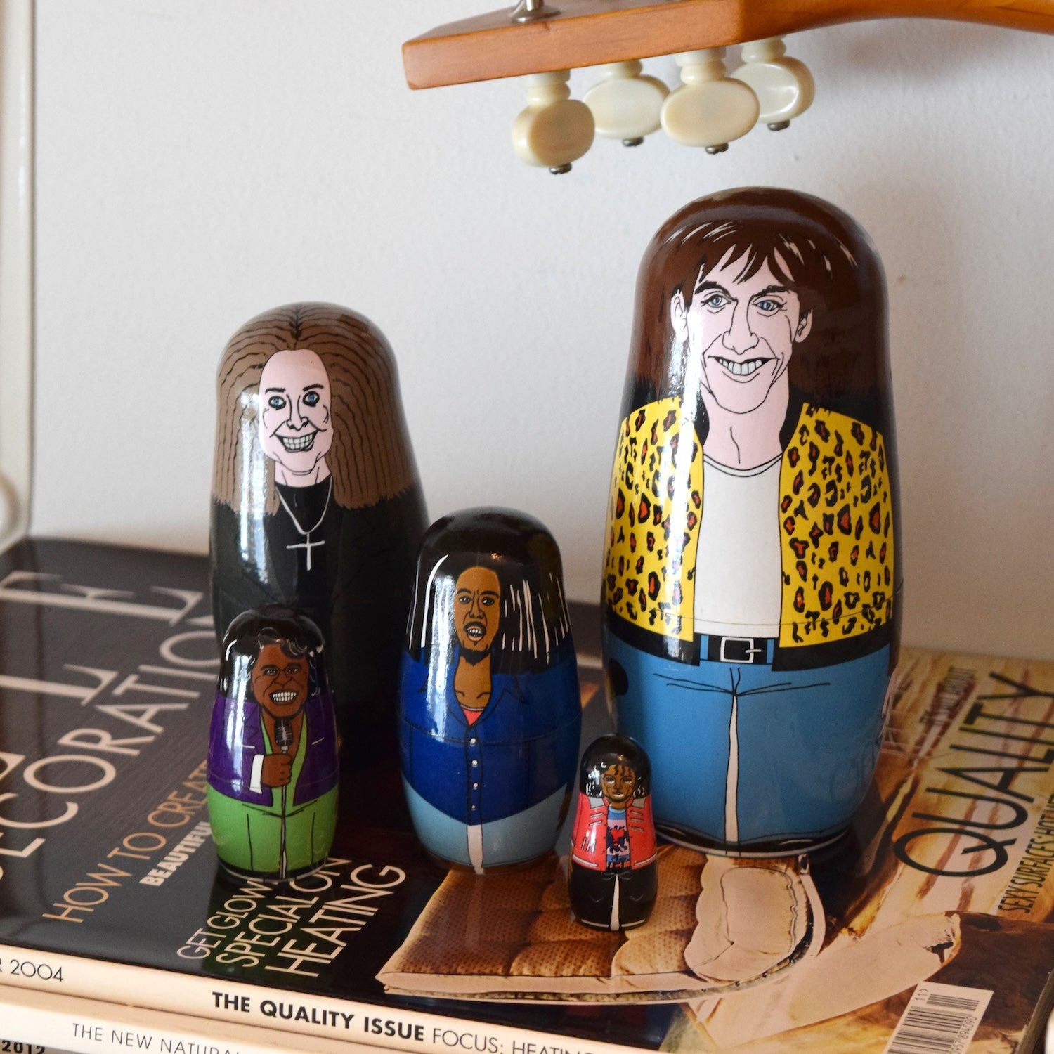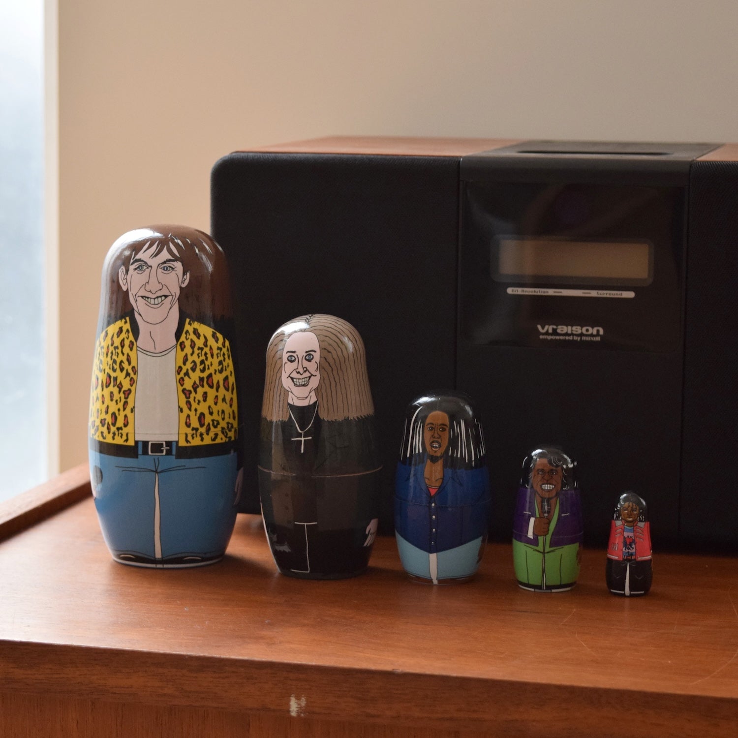 各時代の音楽シーンを引っ張ってきたあのスターたちを描いたマトリョーシカ。ロック、ヘヴィメタ、レゲエ、ソウル、ポップ、さまざまな音楽シーンを輝かせてきたスターたち。その功績を拝めながらお気に入りの音楽に浸ってはいかがでしょう。