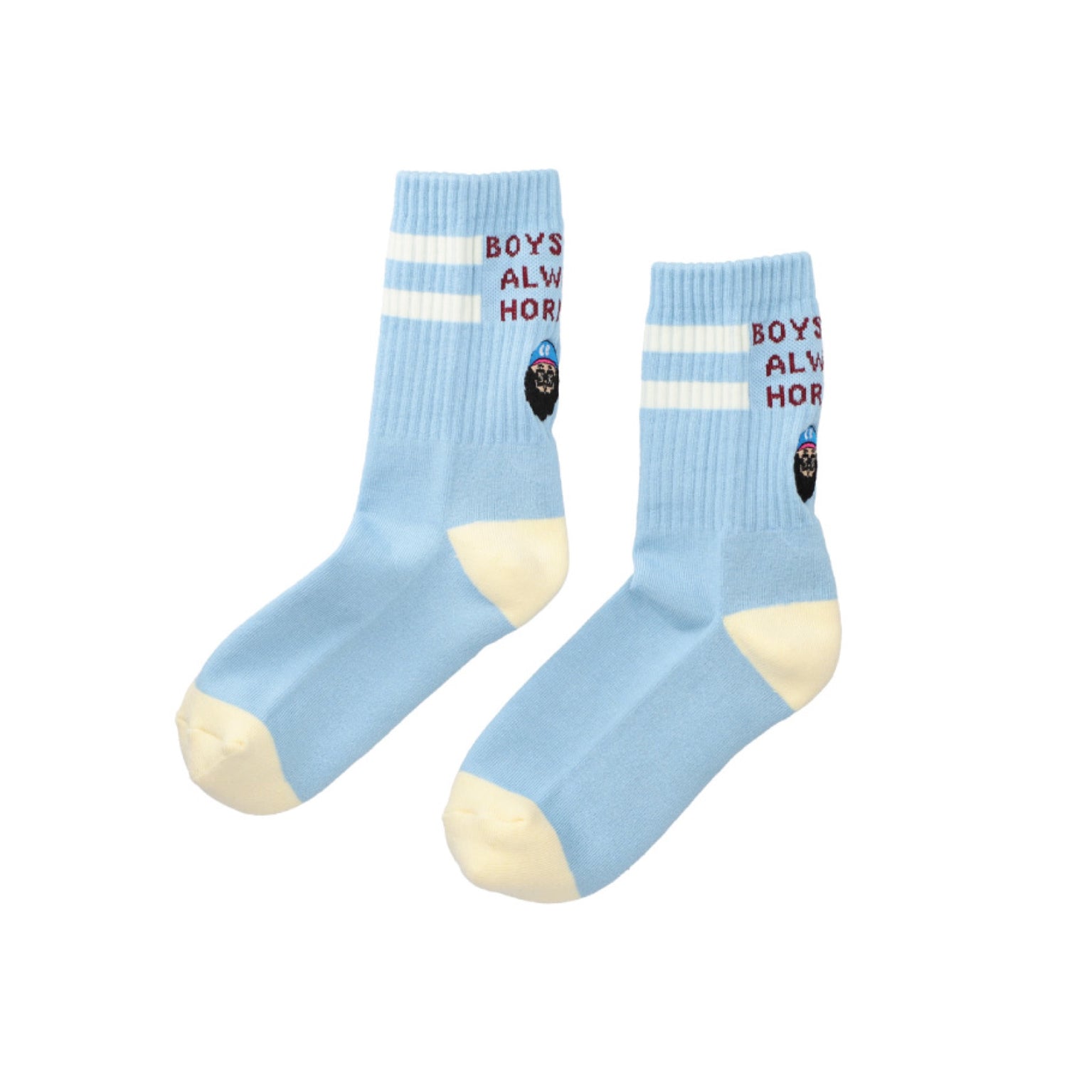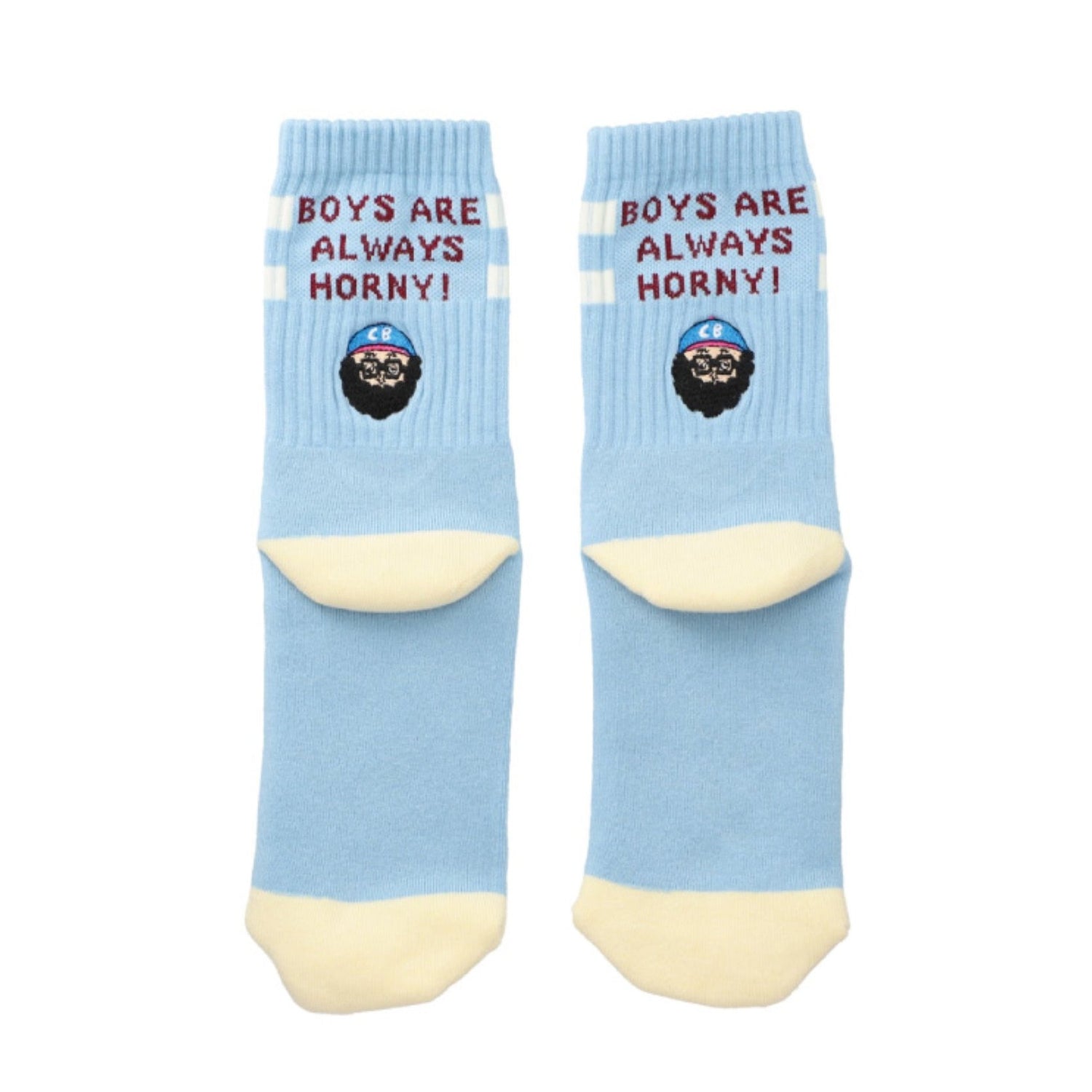 “BOYS ARE ALWAYS HORNY”と刻まれたソックスのバックにchi-beeのメインキャラクターネルソンの刺繍があり、パンツの裾からチラっと覗く刺繍がカワイイです。スポーツソックスをベースにしており、とても伸びが良く、フリーサイズでご利用頂けます。